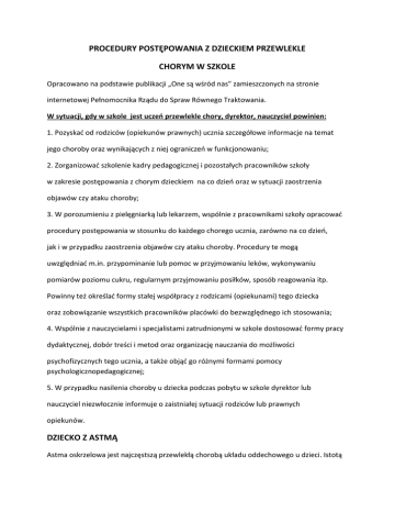 PROCEDURY POSTĘPOWANIA Z DZIECKIEM PRZEWLEKLE CHORYM W SZKOLE Opracowano na podstawie publikacji „One są wśród nas” zamieszczonych na stronie internetowej Pełnomocnika Rządu do Spraw Równego Traktowania. W sytuacji, gdy w szkole jest uczeń przewlekle chory, dyrektor, nauczyciel powinien: 1. Pozyskać od rodziców (opiekunów prawnych) ucznia szczegółowe informacje na temat jego choroby oraz wynikających z niej ograniczeń w funkcjonowaniu; 2. Zorganizować szkolenie kadry pedagogicznej i pozostałych pracowników szkoły w zakresie postępowania z chorym dzieckiem na co dzień oraz w sytuacji zaostrzenia objawów czy ataku choroby; 3. W porozumieniu z pielęgniarką lub lekarzem, wspólnie z pracownikami szkoły opracować procedury postępowania w stosunku do każdego chorego ucznia, zarówno na co dzień, jak i w przypadku zaostrzenia objawów czy ataku choroby. Procedury te mogą uwzględniać m.in. przypominanie lub pomoc w przyjmowaniu leków, wykonywaniu pomiarów poziomu cukru, regularnym przyjmowaniu posiłków, sposób reagowania itp. Powinny też określać formy stałej współpracy z rodzicami (opiekunami) tego dziecka oraz zobowiązanie wszystkich pracowników placówki do bezwzględnego ich stosowania; 4. Wspólnie z nauczycielami i specjalistami zatrudnionymi w szkole dostosować formy pracy dydaktycznej, dobór treści i metod oraz organizację nauczania do możliwości psychofizycznych tego ucznia, a także objąć go różnymi formami pomocy psychologicznopedagogicznej; 5. W przypadku nasilenia choroby u dziecka podczas pobytu w szkole dyrektor lub nauczyciel niezwłocznie informuje o zaistniałej sytuacji rodziców lub prawnych opiekunów. DZIECKO Z ASTMĄ Astma oskrzelowa jest najczęstszą przewlekłą chorobą układu oddechowego u dzieci. Istotą astmy jest przewlekły proces zapalny toczący się w drogach oddechowych, który prowadzi do zwiększonej skłonności do reagowania skurczem na różne bodźce i pojawienia się objawów choroby. OBJAWY Jednym z podstawowych objawów jest duszność jako subiektywne uczucie braku powietrza spowodowane trudnościami w jego swobodnym przechodzeniu przez zwężone drogi oddechowe. Gdy duszność jest bardzo nasilona możemy zauważyć, że usta dziecka a także inne części ciała są zasinione. Konsekwencją zwężenia oskrzeli jest pojawienie się świszczącego oddechu. Częstym objawem astmy oskrzelowej jest kaszel. Najczęściej jest to kaszel suchy, napadowy, bardzo męczący. Zaostrzenie astmy może być wywołane przez: kontakt z alergenami, na które uczulone jest dziecko, kontakt z substancjami drażniącymi drogi oddechowe, wysiłek fizyczny, zimne powietrze, dym tytoniowy, infekcje. W przypadku wystąpienia duszności należy podać dziecku wziewnie lek rozkurczający oskrzela zgodnie z zaleceniem lekarza. W przypadku objawów ciężkiej duszności należy podać jednocześnie 2 dawki leku w aerozolu w odstępie 10-20 sekund. Po wykonaniu 1pierwszej inhalacji należy powiadomić rodziców dziecka o wystąpieniu zaostrzenia. W przypadku duszności o dużym nasileniu powinno się wezwać Pogotowie Ratunkowe. W czasie oczekiwania na przyjazd karetki pogotowia dziecko wymaga ciągłego nadzoru osoby dorosłej. Dodatkowo bardzo ważne jest zapewnienie dziecku spokoju oraz odizolowanie od osób trzecich. NAKAZY 1. Częste wietrzenie sal lekcyjnych. 2. Dziecko, które ma objawy po wysiłku, powinno przed lekcją wychowania fizycznego przyjąć dodatkowy lek. 3. Ćwiczenia fizyczne należy zaczynać od rozgrzewki. 4. W przypadku wystąpienia u dziecka objawów duszności należy przerwać wykonywanie wysiłku i pozwolić dziecku zażyć środek rozkurczowy. ZAKAZY 1. Chorzy uczniowie nie powinni uczestniczyć w pracach porządkowych. 2. W okresie pylenia roślin dzieci z pyłkowicą nie mogą ćwiczyć na wolnym powietrzu oraz nie powinny uczestniczyć w planowanych wycieczkach poza miasto. 3. Astma oskrzelowa wyklucza biegi na długich dystansach, wymagających długotrwałego, ciągłego wysiłku. 4. W klasach, gdzie odbywają się lekcje nie powinno być zwierząt futerkowych. OGRANICZENIA 1. Uczeń z astmą może okresowo wymagać ograniczenia aktywności fizycznej i dostosowania ćwiczeń do stanu zdrowia. 2. Dziecko uczulone na pokarmy powinno mieć adnotacje od rodziców, co może jeść w sytuacjach, które mogą wywołać pojawienie się objawów uczulenia. OBSZARY DOZWOLONE I WSKAZANE DLA DZIECKA 1. Dzieci chore na astmę powinny uczestniczyć w zajęciach z wychowania fizycznego. wysportowane dziecko lepiej znosi okresy zaostrzeń choroby. 2. Uczeń z astmą nie powinien być trwale eliminowany z zajęć z wychowania fizycznego. 3. Dzieci z astmą mogą uprawiać biegi krótkie, a także gry zespołowe. 4. Dzieci z astmą mogą uprawiać gimnastykę i pływanie. 5. Dzieci z astmą mogą uprawiać większość sportów zimowych. Bardzo ważny jest dobry kontakt szkoły z rodzicami, po to, aby wspólnie zapewnić dziecku bezpieczne warunki nauki i pobytu w szkole. Pozwoli to zmniejszyć nadopiekuńczość rodziców a dziecku rozwijać samodzielność i zaufanie do własnych możliwości i umiejętności. Tylko współdziałanie szkoły z rodzicami i lekarzem prowadzącym pomoże prawidłowo funkcjonować dziecku z astmą oskrzelową w środowisku, gdzie spędza wiele godzin w ciągu dnia. DZIECKO Z CUKRZYCĄ Cukrzyca to grupa chorób metabolicznych charakteryzujących się hiperglikemią (wysoki poziom glukozy we krwi - większy od 250mg%). Obecnie w Polsce wśród dzieci i młodzieży dominuje cukrzyca typu 1 – ten typ cukrzycy ma podłoże genetyczne i autoimmunologiczne. Cukrzyca nie jest chorobą zakaźną, nie można się nią zarazić przez kontakt z osobą chorą. Najczęstsze objawy to wzmożone pragnienie, częste oddawanie moczu oraz chudnięcie. W chwili obecnej, w warunkach pozaszpitalnych, jedynym skutecznym sposobem podawania insuliny jest wstrzykiwanie jej do podskórnej tkanki 