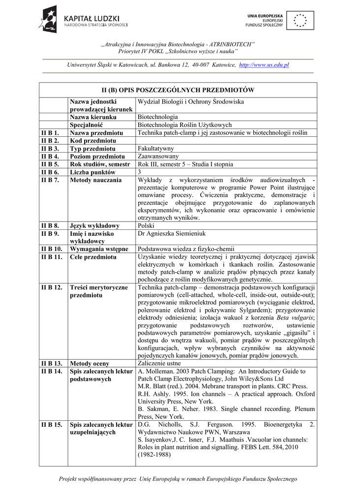„Atrakcyjna i Innowacyjna Biotechnologia - ATRINBIOTECH” Priorytet IV POKL „Szkolnictwo wyższe i nauka” Uniwersytet Śląski w Katowicach, ul. Bankowa 12, 40-007 Katowice, http://www.us.edu.pl II (B) OPIS POSZCZEGÓLNYCH PRZEDMIOTÓW II B 1. II B 2. II B 3. II B 4. II B 5. II B 6. II B 7. II B 8. II B 9. II B 10. II B 11. II B 12. II B 13. II B 14. II B 15. Nazwa jednostki prowadzącej kierunek Nazwa kierunku Specjalność Nazwa przedmiotu Kod przedmiotu Typ przedmiotu Poziom przedmiotu Rok studiów, semestr Liczba punktów Metody nauczania Język wykładowy Imię i nazwisko wykładowcy Wymagania wstępne Cele przedmiotu Wydział Biologii i Ochrony Środowiska Biotechnologia Biotechnologia Roślin Użytkowych Technika patch-clamp i jej zastosowanie w biotechnologii roślin Fakultatywny Zaawansowany Rok III, semestr 5 – Studia I stopnia 3 Wykłady z wykorzystaniem środków audiowizualnych prezentacje komputerowe w programie Power Point ilustrujące omawiane procesy. Ćwiczenia praktyczne, demonstracje i prezentacje obejmujące przygotowanie do zaplanowanych eksperymentów, ich wykonanie oraz opracowanie i omówienie otrzymanych wyników. Polski Dr Agnieszka Siemieniuk Podstawowa wiedza z fizyko-chemii Uzyskanie wiedzy teoretycznej i praktycznej dotyczącej zjawisk elektrycznych w komórkach i tkankach roślin. Zastosowanie metody patch-clamp w analizie prądów płynących przez kanały pochodzące z roślin modyfikowanych genetycznie. Technika patch-clamp – demonstracja podstawowych konfiguracji Treści merytoryczne pomiarowych (cell-attached, whole-cell, inside-out, outside-out); przedmiotu przygotowanie mikroelektrod pomiarowych (wyciąganie elektrod, polerowanie elektrod i pokrywanie Sylgardem); przygotowanie elektrody odniesienia; izolacja wakuol z korzenia Beta vulgaris; przygotowanie podstawowych roztworów, ustawienie podstawowych parametrów pomiarowych, uzyskanie „gigasilu” i dostępu do wnętrza wakuoli, pomiar prądów w poszczególnych konfiguracjach, wpływ wybranych czynników na aktywność pojedynczych kanałów jonowych, pomiar prądów jonowych. Zaliczenie ustne Metody oceny Spis zalecanych lektur A. Molleman. 2003 Patch Clamping: An Introductory Guide to Patch Clamp Electrophysiology, John Wiley&Sons Ltd podstawowych M.R. Blatt (red.). 2004. Mebrane transport in plants. CRC Press. R.H. Ashly. 1995. Ion channels – A practical approach. Oxford University Press, New York. B. Sakman, E. Neher. 1983. Single channel recording. Plenum Press, New York. Spis zalecanych lektur D.G. Nicholls, S.J. Ferguson. 1995. Bioenergetyka 2. Wydawnictwo Naukowe PWN, Warszawa uzupełniających S. Isayenkov,J. C. Isner, F.J. Maathuis .Vacuolar ion channels: Roles in plant nutrition and signalling. FEBS Lett. 584, 2010 (1982-1988) Projekt współfinansowany przez Unię Europejską w ramach Europejskiego Funduszu Społecznego