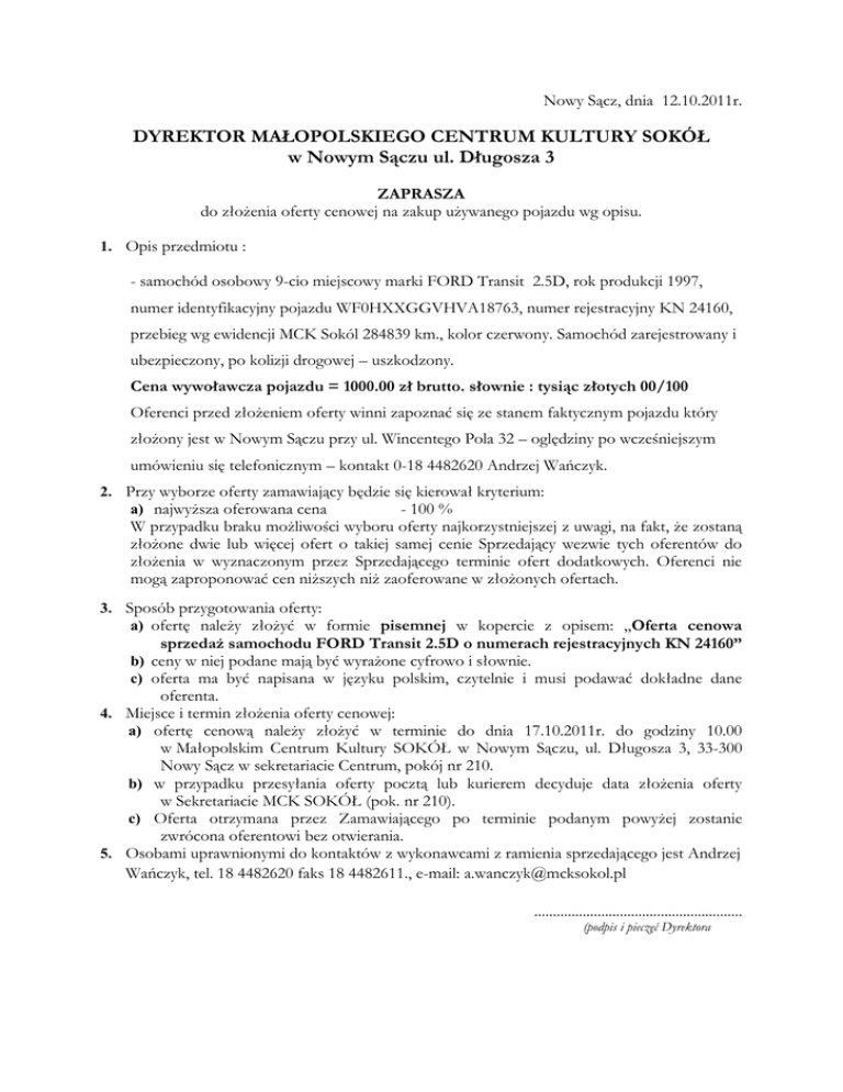Nowy Sącz, dnia 12.10.2011r. DYREKTOR MAŁOPOLSKIEGO CENTRUM KULTURY SOKÓŁ w Nowym Sączu ul. Długosza 3 ZAPRASZA do złożenia oferty cenowej na zakup używanego pojazdu wg opisu. 1. Opis przedmiotu : - samochód osobowy 9-cio miejscowy marki FORD Transit 2.5D, rok produkcji 1997, numer identyfikacyjny pojazdu WF0HXXGGVHVA18763, numer rejestracyjny KN 24160, przebieg wg ewidencji MCK Sokól 284839 km., kolor czerwony. Samochód zarejestrowany i ubezpieczony, po kolizji drogowej – uszkodzony. Cena wywoławcza pojazdu = 1000.00 zł brutto. słownie : tysiąc złotych 00/100 Oferenci przed złożeniem oferty winni zapoznać się ze stanem faktycznym pojazdu który złożony jest w Nowym Sączu przy ul. Wincentego Pola 32 – oględziny po wcześniejszym umówieniu się telefonicznym – kontakt 0-18 4482620 Andrzej Wańczyk. 2. Przy wyborze oferty zamawiający będzie się kierował kryterium: a) najwyższa oferowana cena - 100 % W przypadku braku możliwości wyboru oferty najkorzystniejszej z uwagi, na fakt, że zostaną złożone dwie lub więcej ofert o takiej samej cenie Sprzedający wezwie tych oferentów do złożenia w wyznaczonym przez Sprzedającego terminie ofert dodatkowych. Oferenci nie mogą zaproponować cen niższych niż zaoferowane w złożonych ofertach. 3. Sposób przygotowania oferty: a) ofertę należy złożyć w formie pisemnej w kopercie z opisem: „Oferta cenowa sprzedaż samochodu FORD Transit 2.5D o numerach rejestracyjnych KN 24160” b) ceny w niej podane mają być wyrażone cyfrowo i słownie. c) oferta ma być napisana w języku polskim, czytelnie i musi podawać dokładne dane oferenta. 4. Miejsce i termin złożenia oferty cenowej: a) ofertę cenową należy złożyć w terminie do dnia 17.10.2011r. do godziny 10.00 w Małopolskim Centrum Kultury SOKÓŁ w Nowym Sączu, ul. Długosza 3, 33-300 Nowy Sącz w sekretariacie Centrum, pokój nr 210. b) w przypadku przesyłania oferty pocztą lub kurierem decyduje data złożenia oferty w Sekretariacie MCK SOKÓŁ (pok. nr 210). c) Oferta otrzymana przez Zamawiającego po terminie podanym powyżej zostanie zwrócona oferentowi bez otwierania. 5. Osobami uprawnionymi do kontaktów z wykonawcami z ramienia sprzedającego jest Andrzej Wańczyk, tel. 18 4482620 faks 18 4482611., e-mail: [email protected] ........................................................ (podpis i pieczęć Dyrektora
