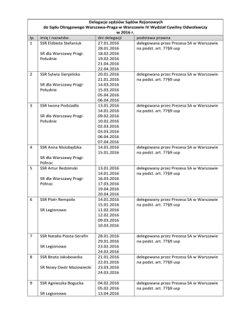 lp. 1 2 3 4 5 6 7 Delegacje sędziów Sądów Rejonowych do Sądu Okręgowego Warszawa-Praga w Warszawie IV Wydział Cywilny Odwoławczy w 2016 r. imię i nazwisko dni delegacji podstawa prawna SSR Elżbieta Stefaniuk 27.01.2016 delegowana przez Prezesa SA w Warszawie 28.01.2016 na podst. art. 77§9 usp SR dla Warszawy Pragi18.02.2016 Południe 19.02.2016 21.04.2016 22.04.2016 SSR Sylwia Sierpińska 20.01.2016 delegowana przez Prezesa SA w Warszawie 21.01.2016 na podst. art. 77§9 usp SR dla Warszawy Pragi14.03.2016 Południe 15.03.2016 05.04.2016 06.04.2016 SSR Iwona Podsiadła 13.01.2016 delegowana przez Prezesa SA w Warszawie 14.01.2016 na podst. art. 77§9 usp SR dla Warszawy Pragi09.02.2016 Południe 10.02.2016 02.03.2016 03.03.2016 06.04.2016 07.04.2016 SSR Anna Nisiobędzka 14.01.2016 delegowana przez Prezesa SA w Warszawie 15.01.2016 na podst. art. 77§9 usp SR dla Warszawy PragiPółnoc SSR Artur Redzimski 13.01.2016 delegowany przez Prezesa SA w Warszawie 14.01.2016 na podst. art. 77§9 usp SR dla Warszawy Pragi16.03.2016 Północ 17.03.2016 19.04.2016 20.04.2016 SSR Piotr Rempoła 14.01.2016 delegowany przez Prezesa SA w Warszawie 15.01.2016 na podst. art. 77§9 usp SR Legionowo 11.02.2016 12.02.2016 09.03.2016 10.03.2016 SSR Natalia Piasta-Serafin SR Legionowo 8 SSR Beata Jakubowska SR Nowy Dwór Mazowiecki 9 SSR Agnieszka Bogucka SR Legionowo 28.01.2016 29.01.2016 23.02.2016 24.02.2016 21.01.2016 22.01.2016 23.03.2016 24.03.2016 delegowana przez Prezesa SA w Warszawie na podst. art. 77§9 usp 04.02.2016 05.02.2016 13.04.2016 delegowana przez Prezesa SA w Warszawie na podst. art. 77§9 usp delegowana przez Prezesa SA w Warszawie na podst. art. 77§9 usp 10 11 12 SSR Małgorzata Kamykowska 14.04.2016 22.02.2016 23.02.2016 08.03.2016 09.03.2016 SR dla Warszawy PragiPółnoc SSR Julita Wyrębiak-Romero 17.02.2016 18.02.2016 SR dla Warszawy Pragi15.03.2016 Południe 16.03.2016 17.05.2016 18.05.2016 SSR Anna Jacaszek SR dla Warszawy PragiPołudnie 10.02.2016 11.02.2016 01.03.2016 02.03.2016 delegowana przez Prezesa SA w Warszawie na podst. art. 77§9 usp delegowana przez Prezesa SA w Warszawie na podst. art. 77§9 usp delegowana przez Prezesa SA w Warszawie na podst. art. 77§9 usp
