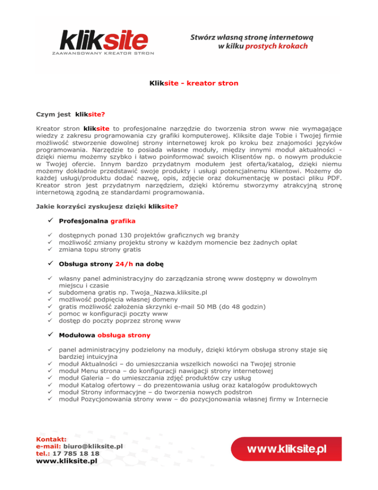 Kliksite - kreator stron Czym jest kliksite? Kreator stron kliksite to profesjonalne narzędzie do tworzenia stron www nie wymagające wiedzy z zakresu programowania czy grafiki komputerowej. Kliksite daje Tobie i Twojej firmie możliwość stworzenie dowolnej strony internetowej krok po kroku bez znajomości języków programowania. Narzędzie to posiada własne moduły, między innymi moduł aktualności dzięki niemu możemy szybko i łatwo poinformować swoich Klisentów np. o nowym produkcie w Twojej ofercie. Innym bardzo przydatnym modułem jest oferta/katalog, dzięki niemu możemy dokładnie przedstawić swoje produkty i usługi potencjalnemu Klientowi. Możemy do każdej usługi/produktu dodać nazwę, opis, zdjęcie oraz dokumentację w postaci pliku PDF. Kreator stron jest przydatnym narzędziem, dzięki któremu stworzymy atrakcyjną stronę internetową zgodną ze standardami programowania. Jakie korzyści zyskujesz dzięki kliksite? Profesjonalna grafika dostępnych ponad 130 projektów graficznych wg branży możliwość zmiany projektu strony w każdym momencie bez żadnych opłat zmiana topu strony gratis Obsługa strony 24/h na dobę własny panel administracyjny do zarządzania stronę www dostępny w dowolnym miejscu i czasie subdomena gratis np. Twoja_Nazwa.kliksite.pl możliwość podpięcia własnej domeny gratis możliwość założenia skrzynki e-mail 50 MB (do 48 godzin) pomoc w konfiguracji poczty www dostęp do poczty poprzez stronę www Modułowa obsługa strony panel administracyjny podzielony na moduły, dzięki którym obsługa strony staje się bardziej intuicyjna moduł Aktualności – do umieszczania wszelkich nowości na Twojej stronie moduł Menu strona – do konfiguracji nawigacji strony internetowej moduł Galeria – do umieszczania zdjęć produktów czy usług moduł Katalog ofertowy – do prezentowania usług oraz katalogów produktowych moduł Strony informacyjne – do tworzenia nowych podstron moduł Pozycjonowania strony www – do pozycjonowania własnej firmy w Internecie Kontakt: e-mail: [email protected] tel.: 17 785 18 18 www.kliksite.pl Dodatkowe korzyści moduł facebook dostępne 4 wersje językowe stron www bez dodatkowych opłat Mapka Google z lokalizacją Twojej firmy logo firmy do wstawienia na własną stronę formularz kontaktowy możliwość założenia kilku stron www na jednym koncie nieograniczona liczba podstron www nieograniczona liczba zdjęć do podstron www statystyki do własnej strony oraz statystyki zliczające odwiedzin 7 dni gratis do testowania w cenie opłaty rocznej jest utrzymanie strony www na serwerze Abonament ROCZNY Strona www z CMS Grafika do strony Domena Panel administracyjny 24 h/dobę Poczta e-mail 50 MB 4 wersje językowe Mapa Google Formularz kontaktowy Statystyki do strony itd. CENA NETTO ZA MIESIĄC 41,58 zł CENA NETTO ZA ROK 499 zł Do podanych cen należy doliczyć 23% podatku VAT Dodatkowe opłaty (opcjonalne): • • stworzenie indywidualnej grafiki do TOP strony 499 zł netto+ 23% VAT (613,77 brutto) szkolenie z zakresu obsługi sklepu 200 zł netto (246 zł brutto) u Klienta Gratis wdrożenie strony www + dodanie do 10 podstron zdjęcia + teksty Znajdź nas na FACEBOOK Kontakt: e-mail: [email protected] tel.: 17 785 18 18 www.kliksite.pl