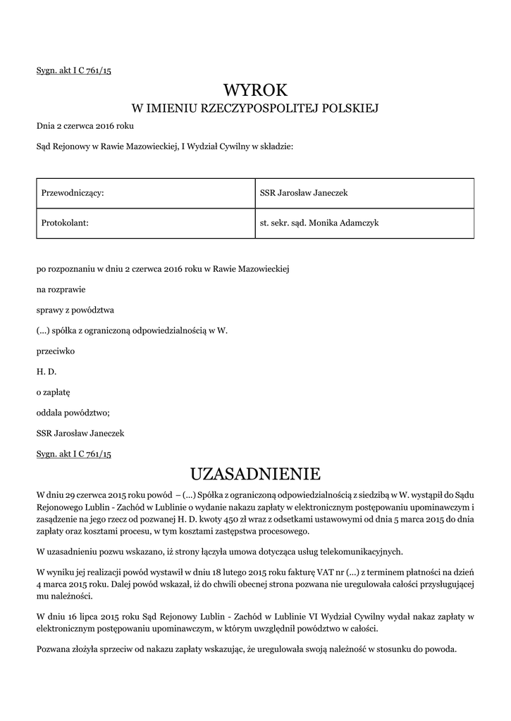 Sygn. akt I C 761/15 WYROK W IMIENIU RZECZYPOSPOLITEJ POLSKIEJ Dnia 2 czerwca 2016 roku Sąd Rejonowy w Rawie Mazowieckiej, I Wydział Cywilny w składzie: Przewodniczący: SSR Jarosław Janeczek Protokolant: st. sekr. sąd. Monika Adamczyk po rozpoznaniu w dniu 2 czerwca 2016 roku w Rawie Mazowieckiej na rozprawie sprawy z powództwa (...) spółka z ograniczoną odpowiedzialnością w W. przeciwko H. D. o zapłatę oddala powództwo; SSR Jarosław Janeczek Sygn. akt I C 761/15 UZASADNIENIE W dniu 29 czerwca 2015 roku powód – (...) Spółka z ograniczoną odpowiedzialnością z siedzibą w W. wystąpił do Sądu Rejonowego Lublin - Zachód w Lublinie o wydanie nakazu zapłaty w elektronicznym postępowaniu upominawczym i zasądzenie na jego rzecz od pozwanej H. D. kwoty 450 zł wraz z odsetkami ustawowymi od dnia 5 marca 2015 do dnia zapłaty oraz kosztami procesu, w tym kosztami zastępstwa procesowego. W uzasadnieniu pozwu wskazano, iż strony łączyła umowa dotycząca usług telekomunikacyjnych. W wyniku jej realizacji powód wystawił w dniu 18 lutego 2015 roku fakturę VAT nr (...) z terminem płatności na dzień 4 marca 2015 roku. Dalej powód wskazał, iż do chwili obecnej strona pozwana nie uregulowała całości przysługującej mu należności. W dniu 16 lipca 2015 roku Sąd Rejonowy Lublin - Zachód w Lublinie VI Wydział Cywilny wydał nakaz zapłaty w elektronicznym postępowaniu upominawczym, w którym uwzględnił powództwo w całości. Pozwana złożyła sprzeciw od nakazu zapłaty wskazując, że uregulowała swoją należność w stosunku do powoda. Postanowieniem z dnia 24 sierpnia 2015 Sąd Rejonowy Lublin – Zachód w Lublinie VI Wydział Cywilny stwierdził skuteczne wniesienie sprzeciwu i utratę mocy nakazu zapłaty w całości oraz przekazał rozpoznanie sprawy tutejszemu Sądowi. W toku dalszego postępowania stanowiska stron nie uległy zmianie. Sąd Rejonowy ustalił następujący stan faktyczny: Pozwaną H. D. i (...) Spółkę z ograniczoną odpowiedzialnością z siedzibą w W. łączyła umowa o świadczenie usług telekomunikacyjnych w sieci (...) z dnia 4 lipca 2014 roku zawarta na okres od 4 lipca 2014 roku do 11 stycznia 2016 roku. Umowa została zawarta w warunkach promocji „Int mod/rout/tab 24 m (testuj) ( (...))”. W umowie została zastrzeżona kara umowna w wysokości 830 zł. Zgodnie z § 5 ust. 2 umowy o świadczenie usług telekomunikacyjnych w przypadku jednostronnego rozwiązania umowy przez abonenta lub przez (...) Spółkę z ograniczoną odpowiedzialnością z siedzibą w W. z winy abonenta przed upływem terminu, na jaki została zawarta umowa, abonent zobowiązany będzie do zapłaty kary umownej w wysokości określonej na stronie 1 umowy, przy czym wysokość kary będzie pomniejszona o proporcjonalną jej wartość za okres od dnia zawarcia umowy do dnia jej rozwiązania. (dowód: umowa o świadczenie usług telekomunikacyjnych, k. 25-27; porozumienie dodatkowe do powyżej umowy, k. 28) Zgodnie z §17 ust. 5 regulaminu świadczenia usług telekomunikacyjnych, jeżeli abonent nie ureguluje zobowiązań wobec (...) Spółki z ograniczoną odpowiedzialnością z siedzibą w W. w oznaczonym terminie płatności lub naruszy postanowienia regulaminu usługodawca zastrzegła sobie prawo do rozwiązania umowy ze skutkiem natychmiastowym. Rozwiązanie umowy ze skutkiem natychmiastowym może nastąpić po podjęciu przez (...) działań mających na celu poinformowanie abonenta o fakcie nieterminowego regulowania płatności w szczególności poprzez wysłanie krótkiej widomości tekstowej lub w formie telefonicznego kontaktu lub w formie pisemnych zawiadomień. (dowód: regulamin świadczenia usługi telekomunikacyjnej, k. 31-37) W dniu 18 lutego 2015 roku (...) Spółka z ograniczoną odpowiedzialnością z siedzibą w W. wystawiła na nazwisko pozwanej notę obciążeniową o nr (...) w związku z karą za niedotrzymanie warunków promocji ( (...)), opiewającą na kwotę 450 zł z terminem płatności oznaczonym na dzień 4 marca 2015 roku (dowód: nota obciążeniowa k. 29) W dniu 18 lutego 2015 (...) Spółka z ograniczoną odpowiedzialnością z siedzibą w W. wystawił na nazwisko pozwanej fakturę VAT o nr (...) za usługi telekomunikacyjne świadczone w okresie rozliczeniowym od 17 stycznia 2015 roku do dnia 16 lutego 2016 roku, opiewającą na kwotę 491,36 zł, z terminem płatności oznaczonym na dzień 4 marca 2015 roku. Ze szczegółowego rozliczenia wynika, że faktura obejmuje: niedopłatę przed wystawieniem bieżącego rachunku w wysokości 40,87 zł oraz należność wynikającą z bieżącego rachunku w kwocie 450,49 zł (dowód: faktura VAT, k. 30) W dniu 23 lutego 2015 roku (...) Spółka z ograniczoną odpowiedzialnością z siedzibą w W. wystosował do pozwanej pismo, w którym wskazał, iż nie otrzymał płatności na kwotę 491,36 zł w związku z czym rozwiązał umowę o świadczenie usług telekomunikacyjnych i wezwał do zapłaty wyżej wskazanej kwoty. (dowód: pismo operatora, k. 38) Powyższy stan faktyczny został ustalony na podstawie wskazanych wyżej dokumentów prywatnych. Strony nie kwestionowały prawdziwości ani autentyczności powyższych dokumentów, a stan faktyczny był w przeważającej mierze bezsporny. Sąd pominął dokument z kopi reklamacji i odpowiedzi na reklamacje, gdyż dotyczył on prawdopodobnie innej usługi świadczonej w innym okresie, niż ten, o którym jest mowa w pozwie. Sąd Rejonowy zważył, co następuje: Powództwo okazało się bezzasadne i jako taki zasługiwało jedynie na oddalenie. W następstwie zawarcia umowy o świadczenie usług telekomunikacyjnych przez pozwaną i stronę powodową powstały stosunki zobowiązaniowe, do których znajdują zastosowanie przepisy ustawy z dnia z dnia 16 lipca 2004 roku Prawo telekomunikacyjne (Dz. U. z 2014 r., poz. 243 z późn. zm.). Zgodnie z art. 56 ust. 1 tejże ustawy świadczenie usług telekomunikacyjnych odbyw