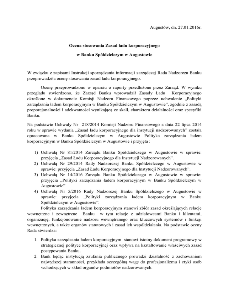 Augustów, dn. 27.01.2016r. Ocena stosowania Zasad ładu korporacyjnego w Banku Spółdzielczym w Augustowie W związku z zapisami Instrukcji sporządzania informacji zarządczej Rada Nadzorcza Banku przeprowadziła ocenę stosowania zasad ładu korporacyjnego. Ocenę przeprowadzono w oparciu o raporty przedłożone przez Zarząd. W wyniku przeglądu stwierdzono, że Zarząd Banku wprowadził Zasady Ładu Korporacyjnego określone w dokumencie Komisji Nadzoru Finansowego poprzez uchwalenie „Polityki zarządzania ładem korporacyjnym w Banku Spółdzielczym w Augustowie”, zgodnie z zasadą proporcjonalności i adekwatności wynikającą ze skali, charakteru działalności oraz specyfiki Banku. Na podstawie Uchwały Nr 218/2014 Komisji Nadzoru Finansowego z dnia 22 lipca 2014 roku w sprawie wydania „Zasad ładu korporacyjnego dla instytucji nadzorowanych” została opracowana w Banku Spółdzielczym w Augustowie Polityka zarządzania ładem korporacyjnym w Banku Spółdzielczym w Augustowie i przyjęta : 1) Uchwałą Nr 81/2014 Zarządu Banku Spółdzielczego w Augustowie w sprawie: przyjęcia „Zasad Ładu Korporacyjnego dla Instytucji Nadzorowanych”. 2) Uchwałą Nr 29/2014 Rady Nadzorczej Banku Spółdzielczego w Augustowie w sprawie: przyjęcia „Zasad Ładu Korporacyjnego dla Instytucji Nadzorowanych”. 3) Uchwałą Nr 14/2016 Zarządu Banku Spółdzielczego w Augustowie w sprawie: przyjęcia „Polityki zarządzania ładem korporacyjnym w Banku Spółdzielczym w Augustowie”. 4) Uchwałą Nr 5/2016 Rady Nadzorczej Banku Spółdzielczego w Augustowie w sprawie: przyjęcia „Polityki zarządzania ładem korporacyjnym w Banku Spółdzielczym w Augustowie”. Polityka zarządzania ładem korporacyjnym stanowi zbiór zasad określających relacje wewnętrzne i zewnętrzne Banku w tym relacje z udziałowcami Banku i klientami, organizację, funkcjonowanie nadzoru wewnętrznego oraz kluczowych systemów i funkcji wewnętrznych, a także organów statutowych i zasad ich współdziałania. Na podstawie oceny Rada stwierdza: 1. Polityka zarządzania ładem korporacyjnym stanowi istotny dokument programowy w strategicznej polityce korporacyjnej oraz wpływa na kształtowanie właściwych zasad postępowania Banku. 2. Bank będąc instytucją zaufania publicznego prowadzi działalność z zachowaniem najwyższej staranności, przykłada szczególną wagę do profesjonalizmu i etyki osób wchodzących w skład organów podmiotów nadzorowanych. 3. Dobre relacje Banku z klientami budują zaufanie do Banku, stąd dbałość o klienta jest jednym z nadrzędnych celów strategicznych. 4. Rzetelne informowanie klientów o oferowanej usłudze czy produkcie w sposób zrozumiały dla przeciętnego odbiorcy z uwzględnieniem ryzyka z nią związanego jest podstawowym obowiązkiem pracowników Banku i jest realizowany na etapie komunikacji marketingowej oraz nawiązywania stosunku prawnego i doboru odpowiedniej dla klienta usługi czy produktu finansowego. 5. Bank może skutecznie realizować wyznaczone cele strategiczne, dzięki właściwej strukturze organizacyjnej, poddawanej okresowym przeglądom oraz odpowiednim systemem kontroli wewnętrznej, audytu i zarządzania ryzykiem. 6. Polityka wynagrodzeń (ze szczególnym uwzględnieniem Polityki zmiennych składników wynagrodzeń stanowi istotny element rozwoju i bezpieczeństwa funkcjonowania Banku i stanowi elementy zapobiegające nadmiernej ekspozycji banku na ryzyko. 7. Polityka informacyjna Banku służy budowie właściwych relacji, w szczególności poprzez ułatwianie dostępu do informacji zarówno klientom, jak i udziałowcom. 8. Bank wykazuje troskę o ochronę praw i rozwój pracowników budujących wartość i reputację instytucji. Tekst „Polityki zarządzania ładem korporacyjnym w Banku Spółdzielczym w Augustowie” (zwanej dalej też „Polityką”) dostępny jest na stronie internetowej Banku pod adresem: www.bs.augustow.pl. Główne postanowienia „Zasad Ładu Korporacyjnego”, które, zgodnie z zasadą proporcjonalności, w ocenie Banku nie stosują się do Banku lub stosowane są w zmodyfikowanej postaci zostały wymienione w Oświadczeniu Zarządu w sprawie stosowania Zasad ładu korporacyjnego, zamieszczonego na stronie internetowej Banku. W 2015 roku Bank przestrzegał wszystkich zasad zawartych w Polityce zarządzania ładem korporacyjnym z uwzględnieniem wyżej wymienionych wyłączeń. Bank dąży do zapewnienia jak największej transparentności swoich działań, należytej jakości komunikacji z klientami oraz ochrony praw udziałowców, także w obszarach nie regulowanych przepisami prawa. Rada Nadzorcza ocenia pozytywnie przestrzeganie przez Bank Zasad ładu korporacyjnego, opracowanych przez Komisję Nadzoru Finansowego. Rada Nadzorcza