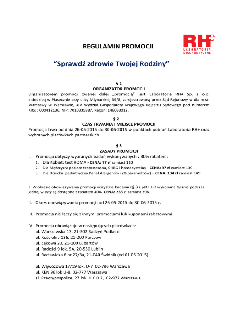 REGULAMIN PROMOCJI ”Sprawdź zdrowie Twojej Rodziny” §1 ORGANIZATOR PROMOCJI Organizatorem promocji zwanej dalej „promocją” jest Laboratoria RH+ Sp. z o.o. z siedzibą w Piasecznie przy ulicy Młynarskiej 39/8, zarejestrowaną przez Sąd Rejonowy w dla m.st. Warszawy w Warszawie, XIV Wydział Gospodarczy Krajowego Rejestru Sądowego pod numerem KRS: : 000412136, NIP: 7010335987, Regon: 146033012. §2 CZAS TRWANIA I MIEJSCE PROMOCJI Promocja trwa od dnia 26-05-2015 do 30-06-2015 w punktach pobrań Laboratoria RH+ oraz wybranych placówkach partnerskich. §3 ZASADY PROMOCJI I. Promocja dotyczy wybranych badań wykonywanych z 30% rabatem: 1. Dla Kobiet: test ROMA - CENA: 77 zł zamiast 110 2. Dla Mężczyzn: poziom testosteronu, SHBG i homocysteiny - CENA: 97 zł zamiast 139 3. Dla Dziecka: pediatryczny Panel Alergenów (20-parametrów) – CENA: 104 zł zamiast 149 II. W okresie obowiązywania promocji wszystkie badania z§ 3 z pkt I 1-3 wykonane łącznie podczas jednej wizyty są dostępne z rabatem 40% CENA: 238 zł zamiast 398. II. Okres obowiązywania promocji: od 26-05-2015 do 30-06-2015 r. III. Promocja nie łączy się z innymi promocjami lub kuponami rabatowymi. IV. Promocja obowiązuje w następujących placówkach: ul. Warszawska 17, 21-302 Radzyń Podlaski ul. Kościelna 136, 21-200 Parczew ul. Łąkowa 20, 21-100 Lubartów ul. Radości 9 lok. 5A, 20-530 Lublin ul. Racławicka 6 nr 27/3a, 21-040 Świdnik (od 01.06.2015) ul. Wąwozowa 17/19 lok. U-7 02-796 Warszawa ul. KEN 96 lok U-8, 02-777 Warszawa al. Rzeczypospolitej 27 lok. U.0.0.2, 02-972 Warszawa ul. Sienkiewicza 25A, 05-825 Grodzisk Mazowiecki ul. Piekarska 4, 96-323 Osuchów ul. Wyspiańskiego 6b, 96-300 Żyrardów ul. Słoneczna 2, 96-313 Jaktorów ul. Warszawska 24, 96-321 Żabia Wola ul. Lipowa 15, 08-460 Sobolew ul. Słoneczna 2, 96-325 Radziejowice ul. Sobieskiego 42, 96-330 Puszcza Mariańska Plac Wolności 5, 96-315 Wiskitki §4 UCZESTNICTWO W PROMOCJI Warunkiem wzięcia udziału w promocji jest wykonanie pakietu badań objętych promocją w określonym w regulaminie czasie obowiązywania. §5 POSTANOWIENIA KOŃCOWE 1. Udział Uczestnika w promocji oznacza jego akceptację zasad promocji zawartych w niniejszym Regulaminie. 2. Regulamin promocji dostępny jest we wskazanych punktach pobrań Laboratoria RH+ Sp. z o.o. oraz na stronie internetowej Organizatora www.rhpluslab.pl. 3. Organizator zastrzega sobie prawo dokonywania zmian w niniejszym Regulaminie. 4. Wszelkie reklamacje powinny być kierowane do Organizatora w ciągu 7 dni od wystąpienia powodu reklamacji na adres mailowy [email protected].