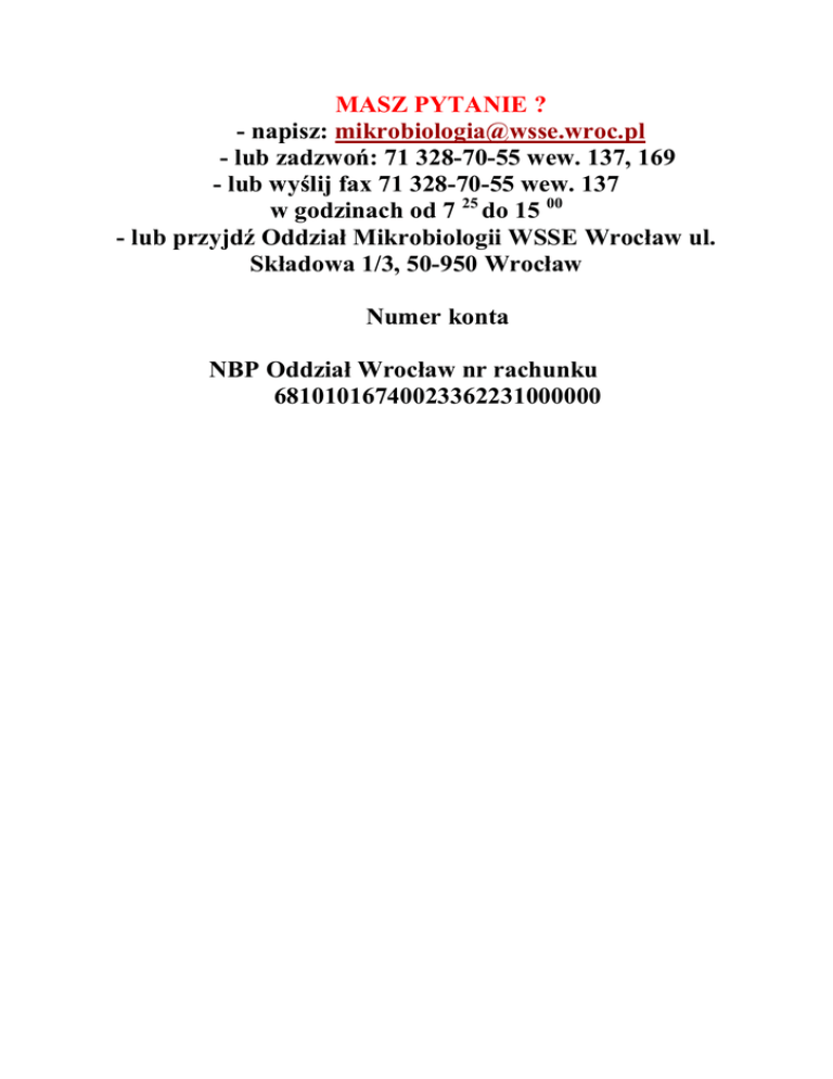 MASZ PYTANIE ? - napisz: [email protected] - lub zadzwoń: 71 328-70-55 wew. 137, 169 - lub wyślij fax 71 328-70-55 wew. 137 w godzinach od 7 25 do 15 00 - lub przyjdź Oddział Mikrobiologii WSSE Wrocław ul. Składowa 1/3, 50-950 Wrocław Numer konta NBP Oddział Wrocław nr rachunku 68101016740023362231000000