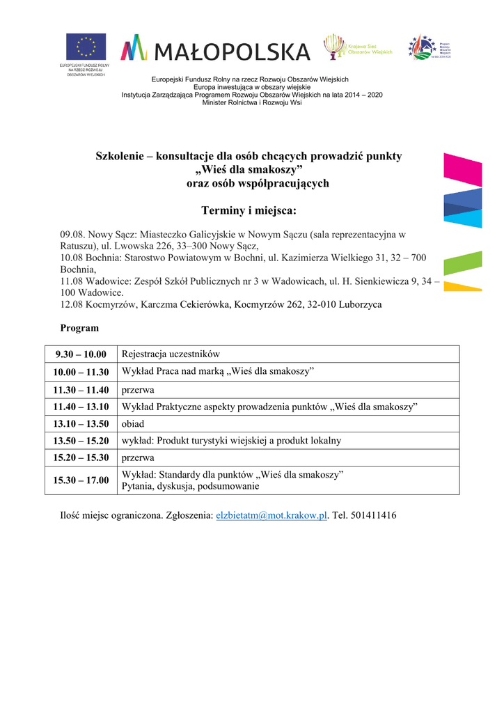 Europejski Fundusz Rolny na rzecz Rozwoju Obszarów Wiejskich Europa inwestująca w obszary wiejskie Instytucja Zarządzająca Programem Rozwoju Obszarów Wiejskich na lata 2014 – 2020 Minister Rolnictwa i Rozwoju Wsi Szkolenie – konsultacje dla osób chcących prowadzić punkty „Wieś dla smakoszy” oraz osób współpracujących Terminy i miejsca: 09.08. Nowy Sącz: Miasteczko Galicyjskie w Nowym Sączu (sala reprezentacyjna w Ratuszu), ul. Lwowska 226, 33–300 Nowy Sącz, 10.08 Bochnia: Starostwo Powiatowym w Bochni, ul. Kazimierza Wielkiego 31, 32 – 700 Bochnia, 11.08 Wadowice: Zespół Szkół Publicznych nr 3 w Wadowicach, ul. H. Sienkiewicza 9, 34 – 100 Wadowice. 12.08 Kocmyrzów, Karczma Cekierówka, Kocmyrzów 262, 32-010 Luborzyca Program 9.30 – 10.00 Rejestracja uczestników 10.00 – 11.30 Wykład Praca nad marką „Wieś dla smakoszy” 11.30 – 11.40 przerwa 11.40 – 13.10 Wykład Praktyczne aspekty prowadzenia punktów „Wieś dla smakoszy” 13.10 – 13.50 obiad 13.50 – 15.20 wykład: Produkt turystyki wiejskiej a produkt lokalny 15.20 – 15.30 przerwa 15.30 – 17.00 Wykład: Standardy dla punktów „Wieś dla smakoszy” Pytania, dyskusja, podsumowanie Ilość miejsc ograniczona. Zgłoszenia: [email protected]. Tel. 501411416