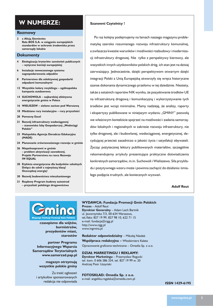 W NUMERZE: Szanowni Czytelnicy ! Rozmowy 2 Po raz kolejny podejmujemy na łamach naszego magazynu proble- z Alicją Siemieniec Rola BOŚ S.A. w osiąganiu europejskich standardów w ochronie środowiska przez samorządy lokalne matykę szeroko rozumianego rozwoju infrastruktury komunalnej, a zwłaszcza kwestie warunków i możliwości rozbudowy i moderniza- Dokumenty cji infrastruktury drogowej. Nie tylko z perspektywy kierowcy, ale 4 Ekologizacja kryteriów zamówień publicznych – wytyczne komisji europejskiej 6 Instalacje nowoczesnego systemu zagospodarowania odpadów zatrważający. Jednocześnie, dzięki perspektywom otwartym dzięki 8 Partnerstwo dla selektywnej gospodarki odpadami komunalnymi integracji Polski z Unią Europejską otworzyły się wręcz historyczne wszystkich innych użytkowników polskich dróg, ich stan jest na dzisiaj szanse dokonania dynamicznego przełomu w tej dziedzinie. Niestety, 12 Wszystkie kolory recyklingu – ogólnopolska kampania outdoorowa także z ostatnich raportów NIK wynika, że pozyskiwanie środków UE 14 SUCHOWOLA – najbardziej efektywna energetycznie gmina w Polsce na infrastrukturę drogową i komunikacyjną i wykorzystywanie tych 16 WIELISZEW – zielone zacisze pod Warszawą środków jest wciąż minimalne. Mamy nadzieję, że analizy, raporty 18 Miedziane rury instalacyjne – rury przyszłości i ekspertyzy publikowane w niniejszym wydaniu „GMINY” pozwolą 20 Pomocny Excel we właściwym kontekście spojrzeć na możliwości i zadania samorzą- 21 Rozwój infrastruktury wodociągowej – stanowisko Izby Gospodarczej „Wodociągi Polskie” dów lokalnych i regionalnych w zakresie rozwoju infrastruktury, nie tylko drogowej, ale i budowlanej, wodociągowej, energetycznej, de- 23 Małopolska Agencja Doradczo Edukacyjna (MADE) 24 Planowanie zrównoważonego rozwoju w gminie cydującej przecież zasadniczo o jakości życia i satysfakcji obywateli. Życząc pożytecznej lektury publikowanych materiałów, szczególnie 26 Niepełnosprawni w gminie – problem aktywizacji zawodowej. Projekt Partnerstwa na rzecz Rozwoju IW EQUAL rekomendujemy artykuły prezentujące praktyczne doświadczenia 28 Etykieta energetyczna dla budynków szkolnych Dołącz do szkół z najwyższą klasą! Oszczędzaj energię! du i pozytywnego wzoru może i powinna zachęcić do działania i śmia- 30 Rozwój budownictwa mieszkaniowego konkretnych samorządów, m.in. Suchowoli i Wieliszewa. Siła przykła- łego podjęcia trudnych, ale koniecznych wyzwań. 31 Rządowy Program budowy autostrad – przyszłość polskiego drogownictwa Adolf Reut WYDAWCA: Fundacja Promocji Gmin Polskich czasopismo dla wójtów, burmistrzów, prezydentów miast, starostów partner Programu Informacyjnego Wsparcia Samorządów Terytorialnych www.samorzad.pap.pl magazyn otrzymują wszystkie polskie gminy Za treść ogłoszeń i artykułów sponsorowanych redakcja nie odpowiada Prezes – Adolf Reut Dyrektor Generalny – Adam Lech Bartnik ul. Jaworzyńska 7/3, 00-634 Warszawa, tel./faks: 827 19 99, 827 98 10, 622 71 15 e-mail: [email protected] http://www.cigg.pl www.ingmina.pl Redaktor odpowiedzialny – Mikołaj Niedek Współpraca redakcyjna – Włodzimierz Kaleta Opracowanie graficzno-techniczne – Omedia Sp. z o.o. DZIAŁ MARKETINGU I REKLAMY: Dyrektor Marketingu – Przemysław Rogucki tel. kom. 0 606 586 334, tel. 827 19 99 w. 20 Andrzej Piotr Uszyński FOTOSKŁAD: Omedia Sp. z o.o. e-mail: [email protected] ISSN 1429-6195 www.ingmina.pl 1 Rola BOŚ S.A. w osiąganiu europejskich standardów w ochronie środowiska przez samorządy lokalne Jak BOŚ S.A. ocenia miniony okres piętnastolecia swojego działania ? BOŚ S.A. jest aktywnym uczestnikiem rynku finansowania ochrony środowiska od chwili rozpoczęcia działalności, tj. od 15 lat. W ciągu tego okresu bank, realizując swoją misję, współfinansował wiele przedsięwzięć inwestycyjnych z zakresu infrastruktury komunalnej, przyczyniając się w ten sposób do poprawy stanu naszego środowiska naturalnego. Od początku swego istnienia bank współpracuje z jednostkami samorządu terytorialnego, które stanowią strategiczną grupę klientów banku. Jesteśmy partnerem co trzeciego samorządu w Polsce. Samorządy należą do najlepszych, solidnych i najbardziej wiarygodnych klientów banku. Jakie efekty przyniosła gminom wieloletnia współpraca z BOŚ S.A.? Mamy tę satysfakcję, że długoletnia współpraca Banku Ochrony Środowiska S.A. z gminami przyniosła konkretne rezultaty. W wielu gminach w Polsce wybudowano sieć wodociągową i kanalizacyjną, oczyszczalnie ścieków, zamieniono oświetlenie na energooszczędne, wybudowano i unowocześniono wysypiska odpadów. BOŚ posiada duże doświadczenie we współfinansowaniu przedsięwzięć inwestycyjnych w ochronie środowiska. W okresie od 1991r. do końca 2005 r. bank udzielił około 37 tys. kredytów finansujących przedsięwzięcia w ochronie środowiska w kwocie – ogółem – 6,3 mld zł. Sfinansowano ponad 22 tys. zadań inwestycyjnych o łącznej wartości około 24 mld zł. W wyniku realizacji zadań uzyskano następujące efekty ekologiczne: zredukowana została emisja pyłów o 128 Mg/a, emisja gazów o 477,6 Mg/a, zwiększyła się przepustowość oczyszczalni ścieków o około 2,5 mln m3/dobę. Długość sieci kanalizacyjnej wzrosła o 5,4 tys. km, a pojemność składowisk odpadów o 15,5 mln m3. Tylko w ubiegłym roku bank udzielił ponad 3,3 tys. kredytów na finansowanie inwestycji w ochronie środowiska na łączną kwotę około 800 mln zł. Zdecy- 2 www.ingmina.pl dowaną większość stanowiły kredyty udzielane we współpracy z Narodowym Funduszem Ochrony Środowiska i Gospodarki Wodnej oraz Wojewódzkimi Funduszami Ochrony Środowiska i Gospodarki Wodnej. Co od momentu wstąpienia Polski do UE, szczególnie zmieniło się w sposobie finansowania inwestycji w ochronie środowiska przez BOŚ? proekologicznych, żeby osiągnąć przy