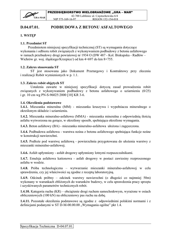 GRA-MAR D.04.07.01. PRZEDSIĘBIORSTWO WIELOBRANŻOWE ,,GRA – MAR” 42-700 Lubliniec ul. Częstochowska 6/4 NIP 575-169-16-97 REGON 152-154-018 PODBUDOWA Z BETONU ASFALTOWEGO 1. WSTĘP 1.1. Przedmiot ST Przedmiotem niniejszej specyfikacji technicznej (ST) są wymagania dotyczące wykonania i odbioru robót związanych z wykonywaniem podbudowy z betonu asfaltowego w ramach przebudowy drogi powiatowej nr 1934 O (DW 487 - Kol. Biskupska - Radłów – Wichrów gr. woj. śląskiego/Krzepice/) od km 4+697 do km 8+755. 1.2. Zakres stosowania ST ST jest stosowana jako Dokument Przetargowy i Kontraktowy przy zleceniu i realizacji Robót wymienionych w p. 1.1. 1.3. Zakres robót objętych ST Ustalenia zawarte w niniejszej specyfikacji dotyczą zasad prowadzenia robót związanych z wykonywaniem podbudowy z betonu asfaltowego o uziarnieniu (0/25) i gr. 10 cm wg PN-S-96025:2000 [10] KR 3-6. 1.4. Określenia podstawowe 1.4.1. Mieszanka mineralna (MM) - mieszanka kruszywa i wypełniacza mineralnego o określonym składzie i uziarnieniu. 1.4.2. Mieszanka mineralno-asfaltowa (MMA) - mieszanka mineralna z odpowiednią ilością asfaltu wytworzona na gorąco, w określony sposób, spełniająca określone wymagania. 1.4.3. Beton asfaltowy (BA) - mieszanka mineralno-asfaltowa ułożona i zagęszczona. 1.4.4. Podbudowa asfaltowa - warstwa nośna z betonu asfaltowego spełniająca funkcje nośne w konstrukcji nawierzchni. 1.4.5. Podłoże pod warstwę asfaltową - powierzchnia przygotowana do ułożenia warstwy z mieszanki mineralno-asfaltowej. 1.4.6. Asfalt upłynniony - asfalt drogowy upłynniony lotnymi rozpuszczalnikami. 1.4.7. Emulsja asfaltowa kationowa - asfalt drogowy w postaci zawiesiny rozproszonego asfaltu w wodzie. 1.4.8. Próba technologiczna – wytwarzanie mieszanki mineralno-asfaltowej w celu sprawdzenia, czy jej właściwości są zgodne z receptą laboratoryjną. 1.4.9. Odcinek próbny – odcinek warstwy nawierzchni (o długości co najmniej 50m) wykonany w warunkach zbliżonych do warunków budowy, w celu sprawdzenia pracy sprzętu i uzyskiwanych parametrów technicznych robót. 1.4.10. Kategoria ruchu (KR) – obciążenie drogi ruchem samochodowym, wyrażone w osiach obliczeniowych (100 kN) na obliczeniowy pas ruchu na dobę. 1.4.11. Pozostałe określenia podstawowe są zgodne z odpowiednimi polskimi normami i z definicjami podanymi w ST D-M-00.00.00 „Wymagania ogólne” pkt 1.4. Specyfikacja Techniczna D-04.07.01. GRA-MAR PRZEDSIĘBIORSTWO WIELOBRANŻOWE ,,GRA – MAR” 42-700 Lubliniec ul. Częstochowska 6/4 NIP 575-169-16-97 REGON 152-154-018 1.5. Ogólne wymagania dotyczące robót Ogólne wymagania dotyczące robót podano w ST D-M-00.00.00 „Wymagania ogólne” pkt 1.5. 2. MATERIAŁY 2.1. Ogólne wymagania dotyczące materiałów Ogólne wymagania dotyczące materiałów, ich pozyskiwania i składowania, podano w ST D-M-00.00.00 „Wymagania ogólne” pkt 2. 2.2. Asfalt Należy stosować asfalt drogowy spełniający wymagania określone w PN-C96170:1965 [6]. 2.3. Wypełniacz Należy stosować wypełniacz, spełniający wymagania PN-S-96504:1961 [9] dla wypełniacza podstawowego i zastępczego. Przechowywanie wypełniacza powinno być zgodne z PN-S-96504:1961 [9]. 2.4. Kruszywo W zależności od kategorii ruchu należy stosować kruszywa podane w tablicy 1. Składowanie kruszywa powinno odbywać się w warunkach zabezpieczających je przed zanieczyszczeniem i zmieszaniem z innymi asortymentami kruszywa lub jego frakcjami. Tablica 1. Wymagania wobec materiałów do podbudowy z betonu asfaltowego Specyfikacja Techniczna D-04.07.01. GRA-MAR PRZEDSIĘBIORSTWO WIELOBRANŻOWE ,,GRA – MAR” 42-700 Lubliniec ul. Częstochowska 6/4 NIP 575-169-16-97 REGON 152-154-018 Lp Rodzaj materiału . nr normy 1 Kruszywo łamane zwykłe i granulowane z surowca skalnego oraz sztucznego (żużle), wg PN-B11112:1996 [2], PN-B-11115:1998 [4] 2 Żwir i mieszanka wg PN-B11111:1996 [1] 3 Grys i żwir kruszony z naturalnie rozdrobnionego surowca skalnego wg WT/MK-CZDP 84 [14] 4 Piasek wg PN-B-11113:1996 [3] 5 Wypełniacz mineralny: a) wg PN-S-96504:1961 [9] 6 Wymagania wobec materiałów w zależności od kategorii ruchu KR 1 lub KR 2 KR 3 do KR 6 kl.I, II, gat.1,2 kl. I, II III; kl I, II; gat. 1, 2 - kl I, II III; gat kl I, II; gat. 1, 1, 2 2 gat. 1, 2 gat. 1, 21) podstawowy, podstawowy zastępczy, b) innego pochodzenia wg orzeczenia pyły z pyły z 2) laboratorium drogowego odpylania, odpylania popioły lotne Asfalt drogowy wg PN-C-96170:1965 D70, D50 D70, D50 [6] 1) Stosunek piasku łamanego do naturalnego w mieszance mineralnej ≥ 1 2) Stosunek wypełniacza podstawowego do pyłów z odpylania ≥ 1 2.5. Asfalt upłynniony Należy stosować asfalt upłynniony spełniający wymagania określone w PN-C96173:1974 [7]. 2.6. Emulsja asfaltowa kationowa Należy stosować drogowe kationowe emulsje asfaltowe spełniające wymagania określone w WT.EmA-99 [13]. 3. SPRZĘT 3.1. Ogólne wymagania dotyczące sprzętu Ogólne wymagania dotyczące sprzętu podano w ST D-M-00.00.00 „Wymagania ogólne” pkt 3. 3.2. Sprzęt do wykonania podbudowy z betonu asfaltowego Wykonawca przystępujący do wykonania podbudowy z betonu asfaltowego powinien wykazać się możliwością korzystania z następującego sprzętu: − wytwórni (otaczarki) o mieszaniu cyklicznym lub ciągłym do wytwarzania mieszanek mineralno-asfaltowych, − układarek do układania mieszanek mineralno-asfaltowych typu zagęszczanego, − skrapiarek, Specyfikacja Techniczna D-04.07.01. GRA-MAR − − − − PRZEDSIĘBIORSTWO WIELOBRANŻOWE ,,GRA – MAR” 42-700 Lubliniec ul. Częstochowska 6/4 NIP 575-169-16-97 REGON 152-154-018 walców lekkich, średnich i ciężkich, walców ogumionych ciężkich o regulowanym ciśnieniu w oponach, szczotek mechanicznych i/lub innych urządzeń czyszczących, samochodów samowyładowczych z przykryciem lub termosów. 4. TRANSPORT 4.1. Ogólne wymagania dotyczące transportu Ogólne wymagania dotyczą