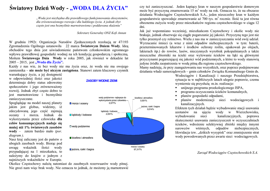 Światowy Dzień Wody - „WODA DLA śYCIA” „Woda jest niezbędna dla prawidłowego funkcjonowania ekosystemów, dla zrównowaŜonego rozwoju i dla ludzkiego Ŝycia. A jednak zbyt często jest ona bezmyślnie marnotrawiona i poddawana skaŜeniu” Sekretarz Generalny ONZ Kofi Annan W grudniu 1992r. Organizacja Narodów Zjednoczonych rezolucją nr 47/193 Zgromadzenia Ogólnego ustanowiła 22 marca Światowym Dniem Wody. Ideą obchodów tego dnia jest uświadomienie państwom członkowskim ogromnego wpływu prawidłowej gospodarki wodnej na ich kondycję gospodarczą i społeczną. Mottem Światowego Dnia Wody w roku 2005, jak równieŜ w dekadzie lat 2005 – 2015, jest „Woda dla śycia”. KaŜdy z nas wie, Ŝe bez wody nie ma Ŝycia oraz, Ŝe woda nie ma swojego zamiennika – nie moŜe być niczym zastąpiona. Stanowi zatem kluczowy czynnik warunkujący Ŝycie, a jej dostępność w odpowiedniej ilości oraz jakości ZASOBY WODNE ZIEMI determinuje dobry status zdrowotny społeczeństw i jego zrównowaŜony rozwój. Jednak zbyt często dobro to jest marnotrawione i bezmyślnie wody podziemne- najlepsze do zanieczyszczane. wykorzystania przez człowieka 0,577% Spoglądając na model naszej planety morza i oceany jakim jest globus, widzimy, iŜ lądolody i lodowce zdecydowaną jego część zajmują 2,091% lądolody i lodowce oceany i morza. Jednak do wykorzystania przez człowieka dla celów konsumpcyjnych nadaje się wody podziemne mniej niŜ 1% światowych zasobów wody – zatem bardzo mało (por. diagram ). biosfera i atmosfera Nasz kraj zaliczany jest do państw o ubogich zasobach wody. Biorąc pod uwagę wskaźnik ilości wody jeziora, rzeki i bagna przypadającej na 1 mieszkańca, to naleŜymy do krajów o jednym z najniŜszych wskaźników w Europie. Okolice Częstochowy naleŜą natomiast do zasobnych rezerwuarów wody pitnej. Nie grozi nam więc brak wody. Nie oznacza to jednak, Ŝe moŜemy ją marnotrawić czy teŜ zanieczyszczać. Jeden kapiący kran w naszym gospodarstwie domowym moŜe być przyczyną zmarnowania 15 m3 wody na rok. Oznacza to, Ŝe na obszarze działania Wodociągów Częstochowskich S.A., jeden nieszczelny kran w kaŜdym gospodarstwie spowoduje zmarnowanie aŜ 700 tys. m3 rocznie. Ilość ta jest równa obecnemu zuŜyciu wody przez mieszkańców regionu częstochowskiego w ciągu 12 dni. Jak juŜ wspomniano wcześniej, mieszkańcom Częstochowy i okolic wody nie brakuje, jednak obserwuje się ciągłe pogarszanie jej jakości. Przyczyną tego jest nie tylko przemysł czy rolnictwo. Wielu z nas ma w zanieczyszczaniu wód swój udział. Wyrzucanie śmieci (a wraz z nimi odpadów niebezpiecznych w tym: baterii, przeterminowanych lekarstw i środków ochrony roślin, opakowań po olejach, lakierach itp.) do rowów, lasów, nieczynnych wyrobisk pokopalnianych a takŜe nieszczelne zbiorniki na ścieki oraz wylewanie ścieków na łąki są głównymi przyczynami pogarszającej się jakości wód podziemnych, a które to wody stanowią jedyne źródła zaopatrzenia w wodę pitną dla regionu częstochowskiego. Mamy nadzieję, Ŝe przy zaangaŜowaniu nas wszystkich, oraz poprzez podejmowane działania władz samorządowych – gmin członków Związku Komunalnego Gmin ds. Wodociągów i Kanalizacji i naszego Przedsiębiorstwa, sytuacja ta w najbliŜszych latach ulegnie poprawie, czemu wymiernie się przysłuŜą m.in. realizacje: unijnego programu proekologicznego ISPA, programu oczyszczania ścieków komunalnych, planów gospodarki odpadami, biosfera i atmosfera planów modernizacji sieci wodociągowych i 0,001% kanalizacyjnych. jeziora, rzeki i bagna Efektem tych działań będzie wybudowanie stacji usuwania 0,014% azotanów na ujęciu wody w Wierzchowisku, wybudowanie sieci kanalizacyjnych, poprawa skuteczności usuwania zanieczyszczeń w oczyszczalniach ścieków, wdroŜenie selektywnej zbiórki między innymi surowców wtórnych, odpadów niebezpiecznych, likwidacja tzw. „dzikich wysypisk” oraz zmniejszenie strat wody powodowanych przez awarie sieci wodociągowych. morza i oceany 97,317% Zarząd Wodociągów Częstochowskich S.A.