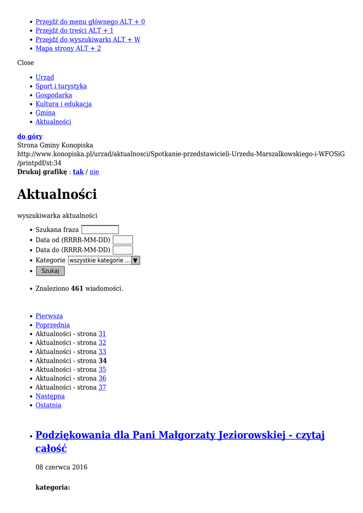 Przejdź do menu głównego ALT + 0 Przejdź do treści ALT + 1 Przejdź do wyszukiwarki ALT + W Mapa strony ALT + 2 Close Urząd Sport i turystyka Gospodarka Kultura i edukacja Gmina Aktualności do góry Strona Gminy Konopiska http://www.konopiska.pl/urzad/aktualnosci/Spotkanie-przedstawicieli-Urzedu-Marszalkowskiego-i-WFOSiG /printpdf/st:34 Drukuj grafikę : tak / nie Aktualności wyszukiwarka aktualności Szukana fraza Data od (RRRR-MM-DD) Data do (RRRR-MM-DD) Kategorie wszystkie kategorie ... ▼ Szukaj Znaleziono 461 wiadomości. Pierwsza Poprzednia Aktualności - strona 31 Aktualności - strona 32 Aktualności - strona 33 Aktualności - strona 34 Aktualności - strona 35 Aktualności - strona 36 Aktualności - strona 37 Następna Ostatnia Podziękowania dla Pani Małgorzaty Jeziorowskiej - czytaj całość 08 czerwca 2016 kategoria: Urząd W dniu 3 czerwca 2016 roku odbyła się XXII sesja Rady Gminy Konopiska. Jedną z zaproszonych gości była Pani Małgorzata Jeziorowska, która w podziękowaniu za długoletni wkład pracy w promocję Gminy Konopiska oraz redagowanie Biuletynu PASMA otrzymała z rąk Wójta Gminy Konopiska Pana Jerzego Żurka oraz Przewodniczącego Rady Gminy Konopiska Pana Edwarda Bałdygi pamiątkową tablicę oraz bukiet kwiatów. Podziękowania dla Pani Małgorzaty Jeziorowskiej Podziękowania dla Pani Małgorzaty Jeziorowskiej - czytaj całość FESTIWAL NAUKI W KONOPISKACH - czytaj całość 08 czerwca 2016 kategoria: Kultura i Edukacja 1 czerwca br. odbył się w naszym gimnazjum Festiwal Nauki. Został on pomyślany jako impreza podsumowująca wszystkie przedsięwzięcia realizowane w ramach ogólnopolskiego projektu „Szkoła z Klasą”. FESTIWAL NAUKI W KONOPISKACH FESTIWAL NAUKI W KONOPISKACH - czytaj całość Integracyjny Dzień Dziecka - czytaj całość 08 czerwca 2016 kategoria: Kultura i Edukacja Tradycyjnie już 1 czerwca odbył się w Zespole Szkolno- Przedszkolnym im. Jana Kochanowskiego w Aleksandrii Integracyjny Dzień Dziecka. Na imprezę zaprosiliśmy, oprócz przedszkolaków i uczniów naszej placówki, niepełnosprawne dzieci i młodzież z terenu naszej gminy. Integracyjny Dzień Dziecka Integracyjny Dzień Dziecka - czytaj całość Taneczna Promocja Gminy Konopiska - czytaj całość 08 czerwca 2016 kategoria: Kultura i Edukacja Przez ostatnie 2 tygodnie maja Zespoły Taneczne z Gminnego Centrum Kultury i Rekreacji pracowały bardzo ciężko. Taneczna Promocja Gminy Konopiska Taneczna Promocja Gminy Konopiska - czytaj całość DZIEŃ RODZINY I FESTIWAL SZKOŁY Z KLASĄ W SP W KONOPISKACH - czytaj całość 08 czerwca 2016 kategoria: Kultura i Edukacja Dzień Dziecka w Szkole Podstawowej w Konopiskach upłynął w rodzinnej atmosferze. Tego ranka uczniowie przybyli razem ze swoimi rodzicami, babciami i dziadkami oraz rodzeństwem. Wszyscy spotkali się w hali sportowej. Po powitaniu zebranych przez panią dyrektor rozpoczęło się przedstawienie „Czerwony kapturek szuka księcia”, przygotowane przez koło teatralne „teatrzyk.pl”. DZIEŃ RODZINY I FESTIWAL SZKOŁY Z KLASĄ W SP W DZIEŃ RODZINY I FESTIWAL SZKOŁY Z KLASĄ W SP W KONOPISKACH - czytaj całość Informacja - czytaj całość 08 czerwca 2016 kategoria: Urząd Urząd Gminy Konopiska poszukuje kandydata na stanowisko informatyka w ramach organizowanego stażu. Informacja Informacja - czytaj całość Informacja - czytaj całość 08 czerwca 2016 kategoria: Urząd Informuję mieszkańców gminy, że w dniach 7–9 czerwca 2016 roku odbędzie się trening systemu alarmowania i ostrzegania obejmujący zasięgiem niektóre powiaty na terenie kraju. Informacja Informacja - czytaj całość Jubileusz 100.lecia Szkoły w Hutkach - czytaj całość 07 czerwca 2016 kategoria: Kultura i Edukacja Obchody uroczystości 100.lecia Szkoły w Hutkach rozpoczęły się 4 czerwca 2016r. mszą św. koncelebrowaną w kościele parafialnym pw. NSPJ w Rększowicach o godzinie 11.00 pod przewodnictwem ks. dr Tomasza Muchy – wizytatora katechetycznego z udziałem ks. proboszcza – Jerzego Mielczarka oraz ks. prałata Stefana Jachimaczaka byłego proboszcza parafii w Rększowicach i katechety szkoły w Hutkach. Jubileusz 100.lecia Szkoły w Hutkach Jubileusz 100.lecia Szkoły w Hutkach - czytaj całość Droga Wojewódzka nr 908 - czy chcemy mieć chodniki i ciągi rowerowe? - czytaj całość 07 czerwca 2016 kategoria: Urząd Zapraszamy do lektury zamieszczonego poniżej pisma Zarządu Dróg Wojewódzkich w Katowicach oraz interpelacji Radnego Stanisława Górniaka, która od 22 kwietnia br. była publikowana na oficjalnej stronie Gminy Konopiska. Droga Wojewódzka nr 908 - czy chcemy mieć chodni Droga Wojewódzka nr 908 - czy chcemy mieć chodniki i ciągi rowerowe? - czytaj całość Komunikat dla Przedsiębiorców! - czytaj całość 04 czerwca 2016 kategoria: Gospodarka Komunikat dla Przedsiębiorców! Od 19 maja 2016r. wchodzi w życie nowelizacja ustawy o swobodzie działalności gospodarczej. Obowiązywać będą nowe wersje formularzy wniosku CEIDG-1 oraz wszystkich załączników. Szczegółowe informacje znajdują się na stronie Ministerstwa Rozwoju w zakładce: Formularze i Instrukcje. Komunikat dla Przedsiębiorców! Komunikat dla Przedsiębiorców! - czytaj całość Pierwsza Poprzednia Aktualności - strona 31 Aktualności - strona 32 Aktualności - strona 33 Aktualności - strona 34 Aktualności - strona 35 Aktualności - strona 36 Aktualności - strona 37 Następna Ostatnia