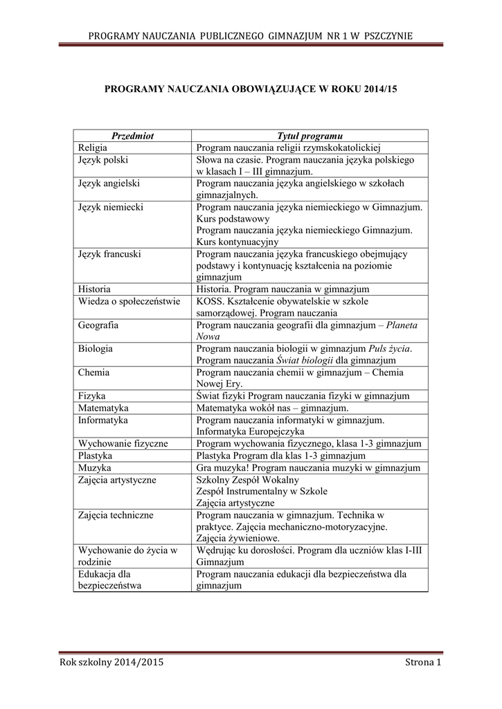 PROGRAMY NAUCZANIA PUBLICZNEGO GIMNAZJUM NR 1 W PSZCZYNIE PROGRAMY NAUCZANIA OBOWIĄZUJĄCE W ROKU 2014/15 Przedmiot Religia Język polski Język angielski Język niemiecki Język francuski Historia Wiedza o społeczeństwie Geografia Biologia Chemia Fizyka Matematyka Informatyka Wychowanie fizyczne Plastyka Muzyka Zajęcia artystyczne Zajęcia techniczne Wychowanie do życia w rodzinie Edukacja dla bezpieczeństwa Rok szkolny 2014/2015 Tytuł programu Program nauczania religii rzymskokatolickiej Słowa na czasie. Program nauczania języka polskiego w klasach I – III gimnazjum. Program nauczania języka angielskiego w szkołach gimnazjalnych. Program nauczania języka niemieckiego w Gimnazjum. Kurs podstawowy Program nauczania języka niemieckiego Gimnazjum. Kurs kontynuacyjny Program nauczania języka francuskiego obejmujący podstawy i kontynuację kształcenia na poziomie gimnazjum Historia. Program nauczania w gimnazjum KOSS. Kształcenie obywatelskie w szkole samorządowej. Program nauczania Program nauczania geografii dla gimnazjum – Planeta Nowa Program nauczania biologii w gimnazjum Puls życia. Program nauczania Świat biologii dla gimnazjum Program nauczania chemii w gimnazjum – Chemia Nowej Ery. Świat fizyki Program nauczania fizyki w gimnazjum Matematyka wokół nas – gimnazjum. Program nauczania informatyki w gimnazjum. Informatyka Europejczyka Program wychowania fizycznego, klasa 1-3 gimnazjum Plastyka Program dla klas 1-3 gimnazjum Gra muzyka! Program nauczania muzyki w gimnazjum Szkolny Zespół Wokalny Zespół Instrumentalny w Szkole Zajęcia artystyczne Program nauczania w gimnazjum. Technika w praktyce. Zajęcia mechaniczno-motoryzacyjne. Zajęcia żywieniowe. Wędrując ku dorosłości. Program dla uczniów klas I-III Gimnazjum Program nauczania edukacji dla bezpieczeństwa dla gimnazjum Strona 1 PROGRAMY NAUCZANIA PUBLICZNEGO GIMNAZJUM NR 1 W PSZCZYNIE SZKOLNY ZESTAW PROGRAMÓW Lp. Przedmiot Tytuł programu Nr programu w Szkolnym Zest. Programów Nauczania Imię i nazwisko nauczyciela realizującego program Klasa, w której program jest realizowany PG1/REL/01/11/1 1. 2. 3. 4. 5. 6. 7. 8. 9. Program nauczania religii w PG1/REL/01/11/ D. Szklanny 2 gimnazjum M. Fischer PG1/REL/01/11/ 3 Słowa na czasie. Program L. Markowska PG1/JP/02/11/1 PG1/JP/02/11/2 nauczania języka polskiego A. Kubica J. polski PG1/JP/02/11/3 w klasach I – III A. Jureczko gimnazjum. J. Szwarczewska - Nędza Program nauczania języka W. Bryła PG1/JA/03/11/1 PG1/JA/03/11/2 J. angielski angielskiego w szkołach J. Szwarczewska - Nędza PG1/JA/03/11/3 gimnazjalnych. M. Mazurczyk Program nauczania języka niemieckiego w Gimnazjum. Kurs PG1/JN/04/11/1 A.Witosza PG1/JN/04/11/2 J. niemiecki podstawowy G. Kloc Program nauczania języka PG1/JN/04/11/3 niemieckiego Gimnazjum. Kurs kontynuacyjny Religia J. francuski Program nauczania języka francuskiego obejmujący podstawy i kontynuację kształcenia na poziomie gimnazjum Muzyka Gra muzyka! Program nauczania muzyki w gimnazjum Plastyka Plastyka Program dla klas 1-3 gimnazjum PG1/JF/05/11/1 PG1/JF/05/11/2 PG1/JF/05/11/3 B. Folek M. Koczy PG1/MUZ/06/11/ 1 S. Wituła PG1/PLAST/07/1 1/1 A. Hoczek Historia Program nauczania w gimnazjum PG1/HIST/08/11 /1 PG1/HIST/08/11 /2 PG1/HIST/08/11 /3 WOS KOSS. Kształcenie obywatelskie w szkole samorządowej. Program nauczania PG1/WOS/09/11/ 1 PG1/WOS/09/11/ 2 Rok szkolny 2014/2015 E. Matula I II III I II III I II III I II III I II III III I J. Fronia M. Swoboda I II III M. Swoboda II III Strona 2 PROGRAMY NAUCZANIA PUBLICZNEGO GIMNAZJUM NR 1 W PSZCZYNIE 10. 11. 12. 13. Geografia Biologia Program nauczania geografii dla gimnazjum – Planeta Nowa PG1/GEOG/10/11 /1 PG1/GEOG/10/11 /2 PG1/GEOG/10/11 /3 PG1/BIOL/11/14/ 1 Program nauczania Świat biologii dla gimnazjum Program nauczania biologii PG1/BIOL/11/11/ 2 w gimnazjum Puls życia. PG1/BIOL/11/1 1/3 Chemia Program nauczania chemii w gimnazjum – Chemia Nowej Ery. Fizyka Świat fizyki Program nauczania fizyki w gimnazjum PG1/CHEM/12/1 1/1 PG1/CHEM/12/1 1/2 PG1/CHEM/12/1 1/3 PG1/FIZ/13/11/1 PG1/FIZ/13/11/2 PG1/FIZ/13/11/3 PG1/MAT/14/11/ 1 PG1/MAT/14/11/ 2 PG1/MAT/14/11/ 3 G. Sroga I II III I A. Nowok II III W. Glaeser I II III K. Kepke I II III U. Brachaczek –Stekla I. Limańska K. Kepke U. Zygmunt I II III 14. Matematyka Matematyka wokół nas – gimnazjum. 15. Informatyka Program nauczania informatyki w gimnazjum. Informatyka Europejczyka PG1/INF/15/11/2 PG1/INF/15/11/3 A. Kania M. Szmidt-Tetla II III Program wychowania fizycznego PG1/WF/16/11/1 PG1/WF/16/112 PG1/WF/16/11/3 A. Pieczka A. Biela S. Dziech Z. Oszek I II III 16. Wychowanie fizyczne PG1/ZART/17/11 /1 17. Zajęcia artystyczne Programy własne PG1/ZART/17/1 1/2 PG1/ZART/18/1 1/1 PG1/ZART/18/1 1/2 Program nauczania w gimnazjum. Technika w PG1/ZATE/19/11/ 1 Zajęcia praktyce. Zajęcia 18. PG1/ZATE/19/1 techniczne mechaniczno1/2 motoryzacyjne. Zajęcia żywieniowe. Wychowanie Wędrując ku dorosłości. PG1/WDŻ/20/11/ 19. 1 do życia w Program dla uczniów klas IRok szkolny 2014/2015 I S. Wituła A. Hoczek II M. Szmidt-Tetla U. Zygmunt I II M. Swoboda I Strona 3 PROGRAMY NAUCZANIA PUBLICZNEGO GIMNAZJUM NR 1 W PSZCZYNIE rodzinie 20. III Gimnazjum PG1/WDŻ/20/11/ 2 PG1/WDŻ/20/11/ 3 Edukacja dla Program nauczania edukacji PG1/EdB/21/11/3 bezpieczeńst dla bezpieczeństwa dla wa gimnazjum Rok szkolny 2014/2015 II III S. Dziech A. Biela III Strona 4