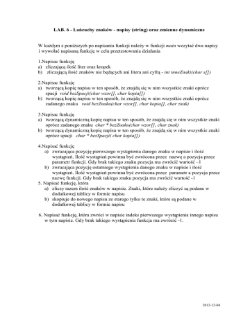 LAB. 6 - Łańcuchy znaków - napisy (string) oraz zmienne dynamiczne W każdym z poniższych po napisaniu funkcji należy w funkcji main wczytać dwa napisy i wywołać napisaną funkcję w celu przetestowania działania 1.Napisac funkcję a) zliczającą ilość liter oraz kropek b) zliczającą ilość znaków nie będących ani litera ani cyfrą - int inneZnaki(char s[]) 2.Napisac funkcję a) tworzącą kopię napisu w ten sposób, że znajdą się w nim wszystkie znaki oprócz spacji void bezSpacji(char wzor[], char kopia[]) b) tworzącą kopię napisu w ten sposób, że znajdą się w nim wszystkie znaki oprócz zadanego znaku void bezZnaku(char wzor[], char kopia[], char znak) 3.Napisac funkcję a) tworzącą dynamiczną kopię napisu w ten sposób, że znajdą się w nim wszystkie znaki oprócz zadanego znaku char * bezZnaku(char wzor[], char znak) b) tworzącą dynamiczną kopię napisu w ten sposób, że znajdą się w nim wszystkie znaki oprócz spacji char * bezSpacji( char kopia[]) 4.Napisać funkcję a) zwracająca pozycję pierwszego wystąpienia danego znaku w napisie i ilość wystąpień. Ilość wystąpień powinna być zwrócona przez nazwę a pozycja przez parametr funkcji. Gdy brak takiego znaku pozycja ma zwrócić wartość –1 b) zwracająca pozycję ostatniego wystąpienia danego znaku w napisie i ilość wystąpień. Ilość wystąpień powinna być zwrócona przez parametr a pozycja przez nazwę funkcji. Gdy brak takiego znaku pozycja ma zwrócić wartość -1 5. Napisać funkcję, która a) zliczy razem ilość znaków w napisie. Znaki, które należy zliczyć są podane w dodatkowej tablicy w formie napisu b) skopiuje do nowego napisu ze starego tylko te znaki, które są podane w dodatkowej tablicy w formie napisu 6. Napisać funkcję, która zwróci w napisie indeks pierwszego wystąpienia innego napisu w tym napisie. Gdy brak takiego wystąpienia funkcja ma zwrócić -1. 2012-12-04