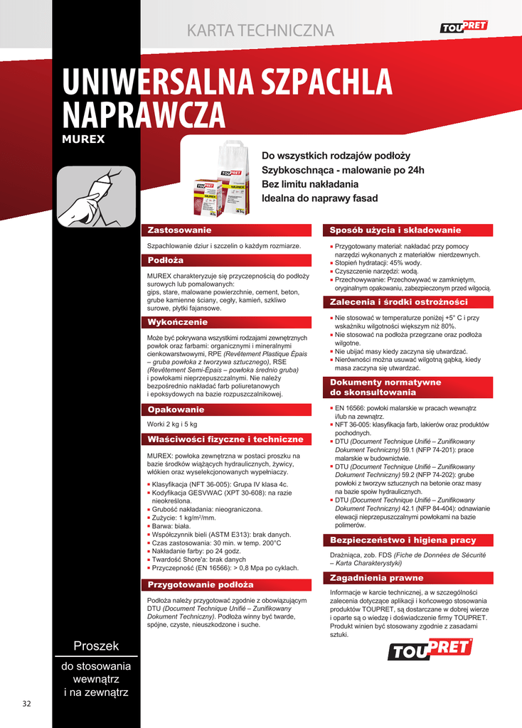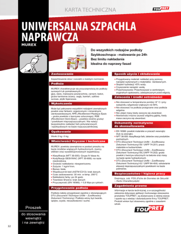 KARTA TECHNICZNA UNIWERSALNA SZPACHLA NAPRAWCZA MUREX Do wszystkich rodzajów podłoży Szybkoschnąca - malowanie po 24h Bez limitu nakładania Idealna do naprawy fasad Zastosowanie Sposób użycia i składowanie Szpachlowanie dziur i szczelin o każdym rozmiarze. ■ Podłoża MUREX charakteryzuje się przyczepnością do podłoży surowych lub pomalowanych: gips, stare, malowane powierzchnie, cement, beton, grube kamienne ściany, cegły, kamień, szkliwo surowe, płytki fajansowe. Wykończenie Może być pokrywana wszystkimi rodzajami zewnętrznych powłok oraz farbami: organicznymi i mineralnymi cienkowarstwowymi, RPE (Revêtement Plastique Épais – gruba powłoka z tworzywa sztucznego), RSE (Revêtement Semi-Épais – powłoka średnio gruba) i powłokami nieprzepuszczalnymi. Nie należy bezpośrednio nakładać farb poliuretanowych i epoksydowych na bazie rozpuszczalnikowej. Opakowanie Worki 2 kg i 5 kg Właściwości fizyczne i techniczne MUREX: powłoka zewnętrzna w postaci proszku na bazie środków wiążących hydraulicznych, żywicy, włókien oraz wyselekcjonowanych wypełniaczy. Klasyfikacja (NFT 36-005): Grupa IV klasa 4c. Kodyfikacja GESVWAC (XPT 30-608): na razie nieokreślona. ■ Grubość nakładania: nieograniczona. ■ Zużycie: 1 kg/m2/mm. ■ Barwa: biała. ■ Współczynnik bieli (ASTM E313): brak danych. ■ Czas zastosowania: 30 min. w temp. 200°C ■ Nakładanie farby: po 24 godz. ■ Twardość Shore'a: brak danych ■ Przyczepność (EN 16566): > 0,8 Mpa po cyklach. ■ ■ Przygotowanie podłoża Podłoża należy przygotować zgodnie z obowiązującym DTU (Document Technique Unifié – Zunifikowany Dokument Techniczny). Podłoża winny być twarde, spójne, czyste, nieuszkodzone i suche. Proszek 32 do stosowania wewnątrz i na zewnątrz Przygotowany materiał: nakładać przy pomocy narzędzi wykonanych z materiałów nierdzewnych. ■ Stopień hydratacji: 45% wody. ■ Czyszczenie narzędzi: wodą. ■ Przechowywanie: Przechowywać w zamkniętym, oryginalnym opakowaniu, zabezpieczonym przed wilgocią. Zalecenia i środki ostrożności Nie stosować w temperaturze poniżej +5° C i przy wskaźniku wilgotności większym niż 80%. ■ Nie stosować na podłoża przegrzane oraz podłoża wilgotne. ■ Nie ubijać masy kiedy zaczyna się utwardzać. ■ Nierówności można usuwać wilgotną gąbką, kiedy masa zaczyna się utwardzać. ■ Dokumenty normatywne do skonsultowania EN 16566: powłoki malarskie w pracach wewnątrz i/lub na zewnątrz. ■ NFT 36-005: klasyfikacja farb, lakierów oraz produktów pochodnych. ■ DTU (Document Technique Unifié – Zunifikowany Dokument Techniczny) 59.1 (NFP 74-201): prace malarskie w budownictwie. ■ DTU (Document Technique Unifié – Zunifikowany Dokument Techniczny) 59.2 (NFP 74-202): grube powłoki z tworzyw sztucznych na betonie oraz masy na bazie spoiw hydraulicznych. ■ DTU (Document Technique Unifié – Zunifikowany Dokument Techniczny) 42.1 (NFP 84-404): odnawianie elewacji nieprzepuszczalnymi powłokami na bazie polimerów. ■ Bezpieczeństwo i higiena pracy Drażniąca, zob. FDS (Fiche de Données de Sécurité – Karta Charakterystyki) Zagadnienia prawne Informacje w karcie technicznej, a w szczególności zalecenia dotyczące aplikacji i końcowego stosowania produktów TOUPRET, są dostarczane w dobrej wierze i oparte są o wiedzę i doświadczenie firmy TOUPRET. Produkt winien być stosowany zgodnie z zasadami sztuki. TOUPRET POLSKA Sp. z o.o. ul. Przemysłowa 18, 62-069 Zakrzewo k/Poznania, [email protected], tel. 61 670 68 68