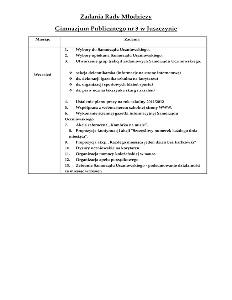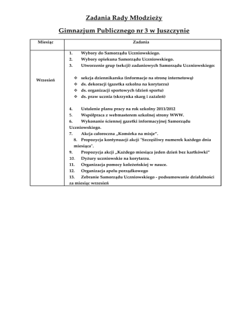Zadania Rady Młodzieży Gimnazjum Publicznego nr 3 w Juszczynie Miesiąc Zadania 1. Wybory do Samorządu Uczniowskiego. 2. Wybory opiekuna Samorządu Uczniowskiego. 3. Utworzenie grup (sekcji) zadaniowych Samorządu Uczniowskiego: sekcja dziennikarska (informacje na stronę internetową) Wrzesień ds. dekoracji (gazetka szkolna na korytarzu) ds. organizacji sportowych (dzień sportu) ds. praw ucznia (skrzynka skarg i zażaleń) 4. Ustalenie planu pracy na rok szkolny 2011/2012 5. Współpraca z webmasterem szkolnej strony WWW. 6. Wykonanie ściennej gazetki informacyjnej Samorządu Uczniowskiego. 7. Akcja całoroczna „Komórka na misje”. 8. Propozycja kontynuacji akcji "Szczęśliwy numerek każdego dnia miesiąca". 9. Propozycja akcji „Każdego miesiąca jeden dzień bez kartkówki” 10. Dyżury uczniowskie na korytarzu. 11. Organizacja pomocy koleżeńskiej w nauce. 12. Organizacja apelu porządkowego 13. Zebranie Samorządu Uczniowskiego - podsumowanie działalności za miesiąc wrzesień 1. Wystawy szkolne „Jedność Europejska” i „Europejska Tożsamość”w ramach projektu Comenius „Oddaleni ale podobni” 2. Dzień Edukacji Narodowej: Październik Przygotowanie upominków dla pracowników szkoły. Przygotowanie i wysyłanie kartek z życzeniami do emerytowanych nauczycieli. Przygotowanie akademii. Przygotowanie gazetki okolicznościowej Przygotowanie otrzęsin klas pierwszych. 3. Udział w ogólnopolskiej akcji "Góra Grosza": 4. Aktualizowanie strony Samorządu Uczniowskiego. 5. Współpraca z redakcją "Naszej Gminy" - Biuletynem Informacyjnym Gminy Radziechowy - Wieprz. 6. Aktualizowanie ściennej gazetki informacyjnej Samorządu Uczniowskiego. 7. Porządkowanie zaniedbanych grobów na cmentarzu w Juszczynie, zapalenie zniczy i złożenie kwiatów na Grobie Nieznanego Żołnierza u Juszczynie. 8. Zebranie Samorządu Uczniowskiego - podsumowanie działalności za miesiąc październik. 1. Pomoc w przygotowaniu akademii z okazji rocznicy Odzyskania przez Polskę Niepodległości i wykonanie gazetki okolicznościowej. 2. Dyskoteka andrzejkowa i sprzedaż ciasteczek z wróżbami. Listopad 3. Finał akcji "Góra Grosza". 4. Reprezentowanie szkoły podczas „Zaduszek narodowych” na Matysce. 5. Przygotowanie gazetki szkolnej na korytarzu „Słynni ludzie mojego kraju” w ramach projektu Comenius. 6. Aktualizowanie strony Samorządu Uczniowskiego. Grudzień Styczeń 7. Aktualizowanie ściennej gazetki informacyjnej Samorządu Uczniowskiego. 8. Zebranie Samorządu Uczniowskiego - podsumowanie działalności za miesiąc listopad. 1. Redagowanie i wysyłanie życzeń świątecznych do osób wspierających i współpracujących ze szkołą. 2. Mikołajkowe niespodzianki w pokoju nauczycielskim i klasach. 3. Akcja „Choinka gimnazjalna”. 4. Pomoc w przygotowaniu jasełek dla uczniów i społeczności lokalnej. 5. Aktualizowanie ściennej gazetki informacyjnej Samorządu Uczniowskiego. 6. Zebranie Samorządu Uczniowskiego - podsumowanie działalności za miesiąc grudzień. 1. Rozpoczęcie odliczania dni do egzaminu gimnazjalnego i końca roku szkolnego. 2. Dyskoteka karnawałowa – sprzedaż masek. 3. Pomoc w wystawieniu jasełek dla społeczności lokalnej. 4. Zamieszczenie informacji o przedstawieniu na stronie szkoły oraz w gazetce gminnej. 5. Aktualizowanie strony Samorządu Uczniowskiego. 6. Aktualizowanie ściennej gazetki informacyjnej Samorządu Uczniowskiego. 7. Zebranie Samorządu Uczniowskiego - podsumowanie działalności za miesiąc styczeń. 1. Walentynki : Luty Poczta walentynkowa, Dyskoteka walentynkowa Wykonanie gazetki okolicznościowej – walentynki. Konkurs pt. ,, Czerwono mi ” – gdzie nagrodą będą dwa bilety do kina. 2. Patronat nad konkursem fizycznym „Fizyka w moich oczach”. 3. Przygotowanie gazetki na korytarzu szkolnym „Słynni ludzie z kraju mojego partnera” w ramach projektu Comenius. 4. Aktualizowanie strony Samorządu Uczniowskiego. 5. Aktualizowanie ściennej gazetki informacyjnej Samorządu Uczniowskiego. 6. Odliczanie dni do egzaminu gimnazjalnego i końca roku szkolnego. 7. Zebranie Samorządu Uczniowskiego - podsumowanie działalności za miesiąc luty. Marzec 1. Dzień Kobiet – wykonanie gazetki okolicznościowej na korytarzu szkolnym. 2. Wielki Post - wykonanie gazetki okolicznościowej na korytarzu szkolnym. 3. Patronat nad IV Gminnym Turniejem Drużynowym z Chemii. 4. Aktualizowanie strony Samorządu Uczniowskiego. 5. Aktualizowanie ściennej gazetki informacyjnej Samorządu Uczniowskiego. 6. Odliczanie dni do egzaminu gimnazjalnego i końca roku szkolnego. 7. Zebranie Samorządu Uczniowskiego - podsumowanie działalności za miesiąc marzec. 1. Przygotowania do Świąt Wielkanocnych: - redagowanie i wysyłanie życzeń świątecznych do osób wspierających i współpracujących ze szkołą, Kwiecień - pomoc w przygotowaniu gazetki na korytarzu szkolnym z okazji Świąt Wielkanocnych 2. Zorganizowanie akcji antynikotynowej i antyalkoholowej polegającej na rozwieszeniu na terenie szkoły plakatów pokazujących w sposób obrzydliwie dosadny skutków palenia i picia. 3. Aktualizowanie strony Samorządu Uczniowskiego. 4. Aktualizowanie ściennej gazetki informacyjnej Samorządu Uczniowskiego. 5. Odliczanie dni do egzaminu gimnazjalnego i końca roku szkolnego. 6. Zebranie Samorządu Uczniowskiego - podsumowanie działalności za miesiąc kwiecień. 1. Rocznica uchwalenia Konstytucji 3 Maja – pomoc w organizacji akademii. 2. Organizacja „Święta Nauki” - V Gminny Turniej Chemiczny. 3. Organizacja Dnia Otwartego Szkoły. 4. W ramach działań dla projektu Comenius umieszczenie na gazetce szkolnej fragmentów najciekawszych prac na tematy: "Rządy Maj komunistów w Polsce" i "Reżim generała Franko w Hiszpanii". 5. Aktualizowanie strony Samorządu Uczniowskiego. 6. Aktualizowanie ściennej gazetki informacyjnej Samorządu Uczniowskiego. 7. Odliczanie dni do końca roku szkolnego. 8. Zebranie Samorządu Uc