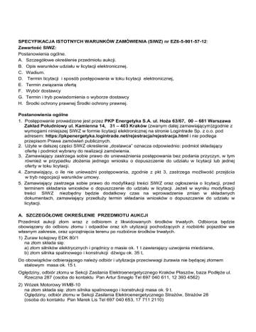 SPECYFIKACJA ISTOTNYCH WARUNKÓW ZAMÓWIENIA (SIWZ) nr EZ6-5-901-57-12: Zawartość SIWZ: Postanowienia ogólne. A. Szczegółowe określenie przedmiotu aukcji. B. Opis warunków udziału w licytacji elektronicznej. C. Wadium. D. Termin licytacji i sposób postępowania w toku licytacji elektronicznej, E. Termin związania ofertą F. Wybór dostawcy G. Termin i tryb powiadomienia o wyborze dostawcy H. Środki ochrony prawnej Środki ochrony prawnej. Postanowienia ogólne 1. Postępowanie prowadzone jest przez PKP Energetyka S.A. ul. Hoża 63/67, 00 – 681 Warszawa Zakład Południowy ul. Kamienna 14, 31 – 403 Kraków (zwanym dalej zamawiającym)zgodnie z wymogami niniejszej SIWZ w formie licytacji elektronicznej na stronie Logintrade Sp. z o.o. pod adresem: https://pkpenergetyka.logintrade.net/rejestracja/rejestracja.html i nie podlega przepisom Prawa zamówień publicznych. 2. Użyte w dalszej części SIWZ określenie „dostawca” oznacza odpowiednio: podmiot składający ofertę i podmiot wybrany do realizacji zamówienia. 3. Zamawiający zastrzega sobie prawo do unieważnienia postępowania bez podania przyczyn, w tym również w przypadku złożenia jednego wniosku o dopuszczenie do udziału w licytacji lub jednej oferty w toku licytacji. 4. Zamawiający, o ile nie unieważni postępowania, zgodnie z pkt 3, zastrzega możliwość przejścia w tryb negocjacji warunków umowy. 5. Zamawiający zastrzega sobie prawo do modyfikacji treści SIWZ oraz ogłoszenia o licytacji, przed terminem składania wniosków o dopuszczenie do udziału w licytacji. Jeżeli w wyniku modyfikacji treści SIWZ niezbędny będzie dodatkowy czas na wprowadzenie zmian w składanych dokumentach, zamawiający przedłuży termin składania wniosków o dopuszczenie do udziału w licytacji. A. SZCZEGÓŁOWE OKREŚLENIE PRZEDMIOTU AUKCJI Przedmiot aukcji złom wraz z odbiorem z likwidowanych środków trwałych. Odbiorca będzie obowiązany do odbioru złomu i odpadów oraz ich utylizacji pochodzących z rozbiórki pojazdów we własnym zakresie, oraz uprzątnięcia terenu po rozbiórce środków trwałych. 1) Żuraw kolejowy EDK 80/1 na złom składa się: a) złom silników elektrycznych i prądnicy o masie ok. 1 t zawierający uzwojenia miedziane, b) złom silnika spalinowego i konstrukcji dźwigu ok. 35 t, Do obowiązków odbierającego należy odbiór i utylizacja przeciwwagi żurawia nie będącej złomem stalowym masa ok. 15 t. Oględziny, odbiór złomu w Sekcji Zasilania Elektroenergetycznego Kraków Płaszów, baza Podłęże ul. Rzeczna 287 (osoba do kontaktu Pan Artur Smagło Tel 697 040 611, 12 393 4562) 2) Wózek Motorowy WMB-10 na złom składa się: złom silnika spalinowego i konstrukcji masa ok. 9 t. Oględziny, odbiór złomu w Sekcji Zasilania Elektroenergetycznego Strażów, Strażów 28 (osoba do kontaktu Pan Marek Lis Tel 697 040 653, 17 711 2110) B. OPIS WARUNKÓW UDZIAŁU W LICYTACJI ELEKTRONICZNEJ 1. Odbiorca ubiegający się o kontrakt zobowiązany jest sporządzić i złożyć wniosek o dopuszczenie do udziału w licytacji wg zał nr 1, oraz zgłosić udział w aukcji poprzez platformę zakupową. 2. Wniosek o dopuszczenie do udziału w licytacji dostawca obowiązany jest przesłać w formie zeskanowanego dokumentu w terminie do dnia 18 XII 2012. godz. 9:30 na adres: [email protected] lub faksem na numer 12 35 15 970 3. Ze strony PKP Energetyka upoważnionym do kontaktowania się z kontrahentami w powyższych sprawach jest Stanisław Zub tel.: 12 35 15 970, faks: 12 35 15 970 4. Do udziału w aukcji dopuszczone są tylko podmioty zarejestrowane jako czynny płatnik VAT lub zwolniony z VAT C. WADIUM Zamawiający nie wymaga wniesienia wadium D. SPOSÓB POSTĘPOWANIA W TOKU LICYTACJI ELEKTRONICZNEJ, W SZCZEGÓLNOŚCI OKREŚLENIE MINIMALNYCH WYSOKOŚCI POSTĄPIEŃ ORAZ INFORMACJE O LICZBIE ETAPÓW LICYTACJI ELEKTRONICZNEJ I CZASIE ICH TRWANIA 1. Cena wywoławcza: 300 zł/tona złomu. Oferent jest zobowiązany do zakupu całości złomu (ok. 45 t) po wylicytowanej cenie. Cena zawiera także wszelkie koszty odbioru i utylizacji przeciwwagi żurawia. 2. Minimalny krok postąpienia: 10,00 zł (netto). 3. W czasie trwania licytacji odbiorcy dopuszczeni do udziału w licytacji, składają za pośrednictwem Internetu swoje oferty cenowe. 4. Ofertę składa się pod rygorem nieważności w postaci elektronicznej. 5. Oferty składane przez dostawców podlegają automatycznej klasyfikacji na podstawie ceny. 6. Oferta złożona w toku licytacji przestaje wiązać, gdy inny dostawca złożył ofertę wyższą 7. Informacje o liczbie etapów licytacji elektronicznej i czasie ich trwania. a) Licytacja rozpocznie się dnia: 18 XII 2012 o godz. 10:00 Podstawowy czas trwania licytacji: 10 minut. b) Zamknięcie licytacji nastąpi w chwili upływu podstawowego czasu trwania licytacji pod warunkiem, że w ciągu ostatniej minuty trwania licytacji żaden z licytujących nie złoży oferty. Jeżeli w ciągu ostatniej minuty trwania licytacji zostanie złożona oferta przez któregokolwiek z licytujących nastąpi uruchomienie opcjonalnego przedłużenia licytacji (dogrywki). c) Czas dogrywki: 1 minuta. d) Liczba dogrywek: 999 – złożenie oferty w ostatniej minucie trwania dogrywki, każdorazowo rozpoczyna kolejną dogrywkę. e) po zatwierdzeniu wyników z oferentem, który zaproponuje najwyższą cenę za tonę złomu zostanie zawarta umowa, zgodnie ze wzorem stanowiącym załącznik nr 2 do SIWZ E. TERMIN ZWIĄZANIA OFERTĄ Dostawca, który zaoferuje najwyższą cenę jednostkową złomu pozostaje związany złożoną przez siebie ofertą 30 dni od dnia złożenia oferty, która była najkorzystniejsza w licytacji). F. WYBÓR ODBIORCY 1. Oferta, która uzyska w wyniku licytacji status najkorzystniejszej, podlega zatwierdzeniu przez odpowiednie organy zamawiającego (zakończenie aukcji nie stanowi przybicia.) 2. Zamawiający zastrzega sobie prawo do unieważnienia postępowania, bez udzialania dodatkowych 