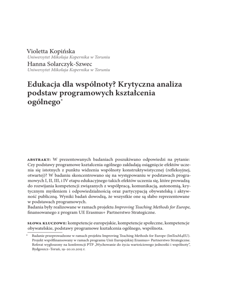 Violetta Kopińska Uniwersytet Mikołaja Kopernika w Toruniu Hanna Solarczyk-Szwec Uniwersytet Mikołaja Kopernika w Toruniu Edukacja dla wspólnoty? Krytyczna analiza podstaw programowych kształcenia ogólnego*1 abstrakt: W prezentowanych badaniach poszukiwano odpowiedzi na pytanie: Czy podstawy programowe kształcenia ogólnego zakładają osiągnięcie efektów uczenia się istotnych z punktu widzenia wspólnoty konstruktywistycznej (refleksyjnej, otwartej)? W badaniu skoncentrowano się na występowaniu w podstawach programowych I, II, III, i IV etapu edukacyjnego takich efektów uczenia się, które prowadzą do rozwijania kompetencji związanych z współpracą, komunikacją, autonomią, krytycznym myśleniem i odpowiedzialnością oraz partycypacją obywatelską i aktywność publiczną. Wyniki badań dowodzą, że wszystkie one są słabo reprezentowane w podstawach programowych. Badania były realizowane w ramach projektu Improving Teaching Methods for Europe, finansowanego z program UE Erasmus+ Partnerstwo Strategiczne. słowa kluczowe: kompetencje europejskie, kompetencje społeczne, kompetencje obywatelskie, podstawy programowe kształcenia ogólnego, wspólnota. * Badanie przeprowadzone w ramach projektu Improving Teaching Methods for Europe (ImTeaM4EU). Projekt współfinansowany w ramach programu Unii Europejskiej Erasmus+ Partnerstwo Strategiczne. Referat wygłoszony na konferencji PTP „Wychowanie do życia wartościowego jednostki i wspólnoty”, Bydgoszcz–Toruń, 19–20.10.2015 r. Kontakt: Violetta Kopińska [email protected] Hanna Solarczyk-Szwec [email protected] Jak cytować: Kopińska, V., Solarczyk-Szwec, H. (2016). Edukacja dla wspólnoty? Krytyczna analiza podstaw programowych kształcenia ogólnego. Forum Oświatowe, 28(1), … Pobrano z: http://forumoswiatowe.pl/index.php/czasopismo/article/view/396 How to cite: Kopińska, V., & Solarczyk-Szwec, H. (2016). Edukacja dla wspólnoty? Krytyczna analiza podstaw programowych kształcenia ogólnego. Forum Oświatowe, 28(1), … Retrieved from http://forumoswiatowe.pl/index.php/czasopismo/article/view/396 Z badań socjologów, m.in. Fatygi (za: Bendyk, 2015), wyłania się obraz Polaków jako istot sprywatyzowanych i doskonale odspołecznionych, dla których najważniejsze jest własne zdrowie i rodzina, a cnoty i powinności obywatelskie nie wzbudzają w nich większych emocji. Czapiński (2006) konstatuje: „W miejsce społeczeństwa rozciąga się próżnia socjologiczna. Między Polakami organizującymi się w podstawowe rodzinne wspólnoty a wspólnotą nadrzędną, narodową, zorganizowaną w państwo, nie istnieją struktury pośrednie” (s. 8). Bendyk (2015) z „Polityki” dodaje: „Polska próżnia socjologiczna kipi różnorodnymi i sprzecznymi zjawiskami: więcej sprawiedliwości społecznej, ale także więcej wolności gospodarczej, więcej państwa, ale także więcej wolności osobistej, więcej kosmopolitycznej otwartości, a także więcej narodowej dumy” (s. 22). Diagnoza społeczna zachęca pedagogów do postawienia pytań o edukację, tj. o przyczyny, wynikające z praktykowanego w szkole i poza nią kształcenia i wychowania, a także możliwości pedagogicznych strategii przeciwdziałania negatywnym skutkom przemian społecznych. Uznano za zasadne, aby punktem wyjścia tak zakreślonego pola problemowego uczynić analizę podstawy programowej kształcenia ogólnego dla wszystkich etapów edukacji szkolnej z punktu widzenia kompetencji społecznych i obywatelskich, zakładając, że są one potencjalnymi czynnikami zmiany społecznej. Zespół badaczek przyjął, że pożądaną wartością społeczną w kontekście diagnozy społecznej oraz interesu społecznego jest wspólnota, która stała się tym samym kategorią teoretyczną, organizującą analizę i interpretację wyników badań. Literatura przedmiotu na temat wspólnoty jest bogata, co wynika z historii tego pojęcia, praktycznego znaczenia dla istnienia społeczeństwa i społeczności oraz jego teoretycznej mocy, inspirującej naukowe spory w naukach humanistycznych i społecznych, odzwierciedlając projekcję ludzi i czasów (w jakich żyją) na temat życia społecznego. Aktualnie odczuwamy powszechnie brak wspólnotowości, co jest ubocznym efektem niekontrolowanego indywidualizmu i przeniesionej z gospodarki na życie społeczne – zasady konkurencji, co z kolei prowadzi do poczucia wyobcowania, niepewności, frustracji. Aby nie pozostać na poziomie „pustego znaczącego”, przejdźmy do udzielenia odpowiedzi na kilka pytań: Co kryje się pod pojęciem wspólnotowości? Jaki typ relacji ludzi ze światem jest w niej oczekiwany? Jakie mo- 12 Forum Oświatowe 28(1) Sekcja tematyczna dele wspólnotowości są wyodrębniane? W odpowiedzi na te pytania odwołamy się do interpretacji Straś-Romanowskiej oraz Szahaja, ograniczając się do zasygnalizowania kluczowych kwestii w tym względzie. Straś-Romanowska (1997) przyjmuje za Buberem, że w zależności od wartości, jaką przypisuje się każdemu członowi relacji: ja–świat, można wyodrębnić trzy typy kultury: indywidualistyczną, kolektywistyczną oraz wspólnotową. W pierwszej ja dominuje nad światem, w drugiej świat nad ja, a trzecia – oparta na podejściu neokonserwatywnym i aksjologicznym – zakłada symetryczność tych relacji oraz traktowanie jako całość, którą rządzi zasada jedności. W kulturze wspólnotowej podstawowym faktem egzystencjalnym nie jest ani człowiek podległy człowiekowi, ani człowiek obok człowieka, lecz człowiek z człowiekiem, sfera pomiędzy. Wyrazem ducha kultury wspólnotowej jest filozofia dialogu, która głosi, że spotkanie z drugim człowiekiem zobowiązuje nie tylko do respektowania jego absolutnej inności, ale również odpowiedzialności za niego (Baran, 1991, za: Straś-Romanowska, 1997), każe uczyć się pokory i ofiarności, samoograniczenia i samodyscypliny. Psychologów w podejściu wspólnotowym