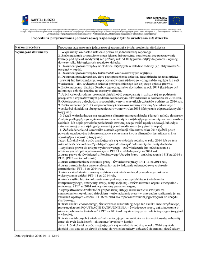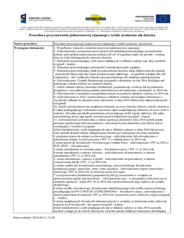 Projekt „Sprawny Samorząd. Wdrażanie usprawnień w zarządzaniu jednostką samorządu terytorialnego w 10 urzędach gmin i 2 starostwach powiatowych z terenu województwa opolskiego i ślą skiego”, współfinansowany przez Unię Europejską ze środków Europejskiego Funduszu Społecznego w ramach Programu Operacyjnego Kapitał Ludzki ,Priorytetu V „Dobre rządzenie” Działania 5.2. „Wzmocnienie potencjału administracji samorządowej” Poddziałania 5.2.1. „Modernizacja zarządzania w administracji samorządowej” Procedura przyznawania jednorazowej zapomogi z tytułu urodzenia się dziecka Nazwa procedury Wymagane dokumenty Procedura przyznawania jednorazowej zapomogi z tytułu urodzenia się dziecka 1. Wypełniony wniosek o ustalenie prawa do jednorazowej zapomogi 2. Zaświadczenie wystawione przez lekarza lub położną potwierdzające pozostawanie kobiety pod opieką medyczną nie później niż od 10 tygodnia ciąży do porodu - wymóg dotyczy tylko biologicznych rodziców dziecka. 3. Dokument potwierdzający wiek dzieci będących w składzie rodziny (np. akty urodzeń oryginał + kopia). 4. Dokument potwierdzający tożsamość wnioskodawcy(do wglądu). 5. Dokument potwierdzający datę przysposobienia dziecka, datę objęcia dziecka opieką prawną lub faktyczną (np. kopia postanowienia sądowego - oryginał do wglądu lub zaś wiadczenie) - dot. wyłącznie dziecka przysposobionego lub objętego opieką prawną. 6. Zaświadczenie Urzędu Skarbowego (oryginał) o dochodzie za rok 2014 (każdego peł noletniego członka rodziny na osobnym druku). 7. Jeżeli członek rodziny prowadzi działalność gospodarczą i rozlicza się na podstawie przepisów o zryczałtowanym podatku dochodowym oświadczenie o dochodzie za 2014 rok. 8. Oświadczenie o dochodzie nieopodatkowanym wszystkich członków rodziny za 2014 rok. 9. Zaświadczenie (z ZUS, od pracodawcy) członków rodziny zawierające informacje o wysokości składek na ubezpieczenie zdrowotne w roku 2014 (faktycznie odprowadzonych) (oryginał). 10. Jeżeli wnioskodawca ma zasądzone alimenty na rzecz dziecka (dzieci), należy dostarczy ć odpis podlegającego wykonaniu orzeczenia sądu zasądzającego alimenty na rzecz osób w rodzinie lub odpis protokołu posiedzenia zawierającego treść ugody sądowej, lub odpis zatwierdzonej przez sąd ugody zawartej przed mediatorem (oryginał + kopia). 11. Zaświadczenie od komornika o stanie egzekucji alimentów roku 2014 (jeżeli postę powanie egzekucyjne było prowadzone a otrzymana kwota alimentów jest niższa niż ta wynikająca z wyroku) (oryginał). Jeżeli którakolwiek z osób znajdujących się w składzie rodziny w roku 2014 lub po tym roku utraciła dochód należy obligatoryjnie dostarczyć dokumenty do utraty dochodu: 1.uzyskanie prawa do urlopu wychowawczego - zaświadczenie lub oświadczenie o udzielonym urlopie wychowawczym i PIT 11 z zakładu pracy za 2014 rok, 2.utrata prawa do świadczeń z Powiatowego Urzędu Pracy - zaświadczenie i PIT za 2014 z PUP, (PUP – oświadczenie) 3.utrata zatrudnienia ze stosunku pracy - świadectwo pracy i PIT 11 za 2014 rok, 4.utrata zatrudnienia z umowy zlecenia - zaświadczenie od pracodawcy o okresie zatrudnienia i PIT 11 za 2014 rok, 5. utrata zatrudnienia z umowy o dzieło - zaświadczenie od pracodawcy o okresie wykonywania dzieła i PIT- 11 za 2014 rok, 6..utrata zasiłku lub świadczenia emerytalnego, nauczycielskiego świadczenia kompensacyjnego, emerytury, renty, renty socjalnej - zaświadczenie organu emerytalno rentowego i PIT za 2014 rok wystawiony przez ten organ, 7.wyrejestrowanie działalności gospodarczej lub jej zawieszenie w związku ze sprawowaniem opieki nad dzieckiem - oświadczenie oraz - w przypadku rozliczania jej na zasadach ogólnych - kopia PIT 36 za 2014 rok z potwierdzeniem jego wpływu do urzędu skarbowego, 8.utrata zasiłku chorobowego, świadczenia rehabilitacyjnego lub zasiłku macierzyńskiego, przysługujących PO UTRACIE ZATRUDNIENIA - świadectwo pracy, zaświadczenie o okresie pobierania świadczeń i PIT za 2014 rok wystawiony przez właściwy organ (oryginał y + kopie), 9.utrata zasądzonych świadczeń alimentacyjnych w związku ze śmiercią osoby zobowią zanej do tych świadczeń - akt zgonu (oryginał + kopia). Jeżeli którakolwiek z osób znajdujących się w składzie rodziny w roku 2014 uzyskała dochód i osiąga go do chwili obecnej do wniosku należy dołączyć dokument określający Data wydruku: 2016-04-11 12:49 Projekt „Sprawny Samorząd. Wdrażanie usprawnień w zarządzaniu jednostką samorządu terytorialnego w 10 urzędach gmin i 2 starostwach powiatowych z terenu województwa opolskiego i ślą skiego”, współfinansowany przez Unię Europejską ze środków Europejskiego Funduszu Społecznego w ramach Programu Operacyjnego Kapitał Ludzki ,Priorytetu V „Dobre rządzenie” Działania 5.2. „Wzmocnienie potencjału administracji samorządowej” Poddziałania 5.2.1. „Modernizacja zarządzania w administracji samorządowej” Opłaty skarbowe datę uzyskania dochodu oraz dokument określający łączną kwotę uzyskanego dochodu w 2014 roku. Chodzi tu o dochody, których członek rodziny nie osiągał przez cały okres 12 miesięcy w 2014 roku. Przez uzyskanie dochodu należy rozumieć: 1.zakończenie urlopu wychowawczego (zaświadczenie od pracodawcy lub oświadczenie o powrocie do pracy i PIT 11 za 2014 rok, zaświadczenie o zarobkach z miesiąca następują cego po miesiącu, w którym rozpoczęto pracę po urlopie wych.), 2.uzyskanie prawa do świadczeń z Powiatowego Urzędu Pracy – zaświadczenie (PUP – oś wiadczenie), 3.uzyskanie zatrudnienia - stosunek pracy, stosunek służbowy, umowa agencyjna, umowa zlecenie, umowa o dzieło (umowa i PIT 11 za 2014 rok), 4.uzyskanie zasiłku lub świadczenia emerytalnego, nauczycielskiego świadczenia kompensacyjnego, emerytury, renty, renty socjalnej - zaświadczenie lub decyzja organu emerytalno 