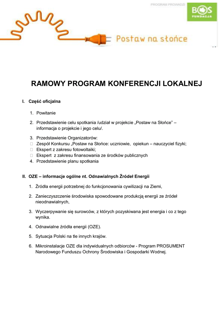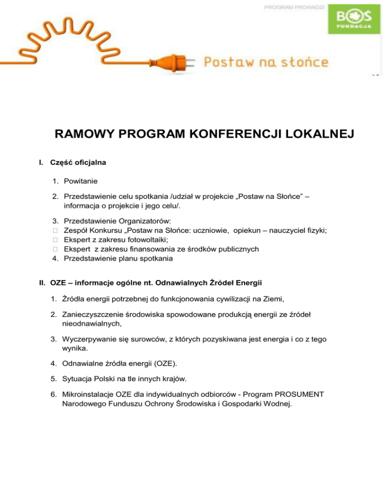 RAMOWY PROGRAM KONFERENCJI LOKALNEJ I. Część oficjalna 1. Powitanie 2. Przedstawienie celu spotkania /udział w projekcie „Postaw na Słońce” – informacja o projekcie i jego celu/. 3. Przedstawienie Organizatorów: Zespół Konkursu „Postaw na Słońce: uczniowie, opiekun – nauczyciel fizyki; Ekspert z zakresu fotowoltaiki; Ekspert z zakresu finansowania ze środków publicznych 4. Przedstawienie planu spotkania II. OZE – informacje ogólne nt. Odnawialnych Źródeł Energii 1. Źródła energii potrzebnej do funkcjonowania cywilizacji na Ziemi, 2. Zanieczyszczenie środowiska spowodowane produkcją energii ze źródeł nieodnawialnych, 3. Wyczerpywanie się surowców, z których pozyskiwana jest energia i co z tego wynika. 4. Odnawialne źródła energii (OZE). 5. Sytuacja Polski na tle innych krajów. 6. Mikroinstalacje OZE dla indywidualnych odbiorców - Program PROSUMENT Narodowego Funduszu Ochrony Środowiska i Gospodarki Wodnej. III. Mikroinstalacje fotowoltaiczne - informacje ogólne nt. Jak pozyskać prąd ze Słońca? 1. Film promocyjny wyjaśniający co to są instalacje fotowoltaicznie. 2. Fotowoltaika –krótko na temat nowej technologii – mapa nasłonecznienie Polski, wydajność systemu, rodzaje paneli, itp. 3. Co trzeba wiedzieć i od czego zacząć, aby zainstalować system fotowoltaiczny Warunki konieczne /Słońce, dach o wystawie południowej, nachylenie powierzchni na której mocowane będą panele słoneczne, itp. IV. MIkroinstalacje fotowoltaiczne - informacje ogólne nt. Jak pozyskać prąd ze Słońca? 1. Film promocyjny wyjaśniający status prosumenta. 2. Podłączenie do sieci energetycznej, możliwość zarabiania na produkcji prądu we własnym domu - wyjaśnienie pojęcia „prosument”. 3. Prezentacja wykonanych projektów przez Szkolny Zespół Konkursowy dla domów z sąsiedztwa wraz z kalkulacją finansową tj. wyliczeniem oszczędności wynikających z zastosowania mikroinstalacji fotowoltaicznych. 4. Prezentacja portalu www.postawnaslonce.pl i przyjaznych użytkownikowi kalkulatorów /energetycznych dla budynku szkolnego i mieszkalnego, obliczania śladu CO2 i rekompensaty ekologicznej, dobrania modułów fotowoltaicznych. 5. Przedstawienie źródeł finansowania mikroinstalacji ze środków publicznych, w tym Program PROSUMENT Narodowego Funduszu Ochrony Środowiska i Gospodarki Wodnej. V. Pytania do ekspertów
