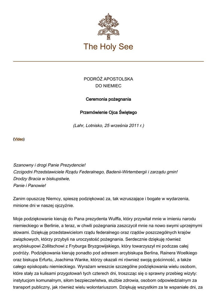 The Holy See PODRÓŻ APOSTOLSKA DO NIEMIEC Ceremonia pożegnania Przemówienie Ojca Świętego (Lahr, Lotnisko, 25 września 2011 r.) (Video) Szanowny i drogi Panie Prezydencie! Czcigodni Przedstawiciele Rządu Federalnego, Badenii-Wirtembergii i zarządu gmin! Drodzy Bracia w biskupstwie, Panie i Panowie! Zanim opuszczę Niemcy, spieszę podziękować za, tak wzruszające i bogate w wydarzenia, minione dni w naszej ojczyźnie. Moje podziękowanie kieruję do Pana prezydenta Wulffa, który przywitał mnie w imieniu narodu niemieckiego w Berlinie, a teraz, w chwili pożegnania zaszczycił mnie na nowo swymi uprzejmymi słowami. Dziękuję przedstawicielom rządu federalnego oraz rządów poszczególnych krajów związkowych, którzy przybyli na uroczystość pożegnania. Serdecznie dziękuję również arcybiskupowi Zollitschowi z Fryburga Bryzgowijskiego, który towarzyszył mi podczas całej podróży. Podziękowania kieruję ponadto pod adresem arcybiskupa Berlina, Rainera Woelkiego oraz biskupa Erfurtu, Joachima Wanke, którzy okazali mi również swoją gościnność, a także całego episkopatu niemieckiego. Wyrażam wreszcie szczególne podziękowania wielu osobom, które stały za kulisami przygotowań tych czterech dni, troszcząc się o sprawny przebieg wizyty: instytucjom komunalnym, siłom bezpieczeństwa, służbie zdrowia, osobom odpowiedzialnym za transport publiczny, jak również wielu wolontariuszom. Dziękuję wszystkim za te wspaniałe dni, za 2 tyle osobistych spotkań i okazane mi niezliczone przejawy uprzejmości i przywiązania. W stolicy federalnej, Berlinie, miałem szczególną okazję, by mówić do członków niemieckiego Bundestagu i przedstawić im swoje przemyślenia na temat duchowych podstaw państwa prawa. Chętnie wspominam również owocne rozmowy z Prezydentem i Panią Kanclerz o aktualnej sytuacji narodu niemieckiego oraz wspólnoty międzynarodowej. Szczególnie wzruszyło mnie życzliwe przyjęcie i entuzjazm tak wielu ludzi w Berlinie. W kraju Reformacji ekumenizm stanowił oczywiście jeden z centralnych punktów podróży. Chciałbym tu podkreślić spotkanie z przedstawicielami Niemieckiego Kościoła Ewangelickiego w byłym klasztorze augustianów w Erfurcie. Jestem głęboko wdzięczny za braterską wymianę opinii i wspólną modlitwę. Bardzo ważne były także spotkania z przedstawicielami prawosławia i starożytnych Kościołów wschodnich oraz z żydami i muzułmanami. Rzecz jasna wizyta ta była adresowana szczególnie do katolików w Berlinie, Erfurcie, w Eichsfeld i we Fryburgu Bryzgowijskim. Z przyjemnością wspominam wspólne celebracje liturgiczne, radość, wspólne słuchanie Słowa Bożego zjednoczenie na modlitwie i we wspólnym śpiewie – zwłaszcza w tej części kraju, w której próbowano przez dziesięciolecia usunąć religię z ludzkiego życia. Nastraja mnie to optymistycznie, co do przyszłości Kościoła w Niemczech i chrześcijaństwa w Niemczech. Można było doświadczyć, podobnie jak w czasie poprzednich wizyt, jak wiele osób świadczy tutaj o swej wierze i uobecnia jej twórczą moc w świecie współczesnym. Wreszcie, byłem bardzo szczęśliwy, że po imponującym Światowym Dniu Młodzieży w Madrycie mogłem być ponownie z tak wielu młodymi we Fryburgu na czuwaniu młodzieży. Pragnę zachęcić Kościół w Niemczech, aby nadal kroczył z mocą i ufnością drogą wiary, która powoduje, że ludzie wracają do swych korzeni, do istoty Dobrej Nowiny Chrystusa. Będą małe wspólnoty wierzących – i już istnieją – które swym entuzjazmem sprawiają, że promieniują światłem w pluralistycznym społeczeństwie, zaciekawiając innych, aby szukali światła, które daje życie w obfitości. „Nie ma nic piękniejszego, niż poznać Chrystusa i dzielić się z innymi przyjaźnią z Nim” (Msza św. z okazji inauguracji pontyfikatu, 24 kwietnia 2005). Z tego doświadczenia, rodzi się w końcu pewność: „Gdzie jest Bóg, tam jest przyszłość”. Gdzie obecny jest Bóg, tam jest nadzieja i tam otwierają się nowe i często nieoczekiwane perspektywy, które wykraczają poza dzień dzisiejszy i sprawy nietrwałe. W tym sensie towarzyszę myślą i modlitwą drodze Kościoła w Niemczech. Powracam do Rzymu napełniony wywierającymi niezwykłe wrażenie przeżyciami i wspomnieniami tych dni w mej ojczyźnie. Zapewniając o modlitwie za was wszystkich a także dobrej przyszłości naszego kraju, w pokoju i wolności, żegnając się, pragnę powiedzieć serdeczne „Bóg zapłać”! Niech Pan błogosławi wam wszystkim! 3 © Copyright 2011 - Libreria Editrice Vaticana © Copyright - Libreria Editrice Vaticana