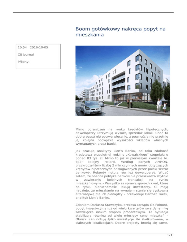 Boom gotówkowy nakręca popyt na mieszkania 10:54 2016-10-05 CIJ Journal Přílohy: Mimo ograniczeń na rynku kredytów hipotecznych, deweloperzy utrzymują wysoką sprzedaż lokali. Choć ta dobra passa nie potrwa wiecznie, z pewnością nie przetnie jej kolejna podwyżka wysokości wkładów własnych wymaganych przez banki. Jak szacują analitycy Lion’s Banku, od roku zdolność kredytowa przeciętnej rodziny „Kowalskiego” stopniała o ponad 83 tys. zł. Mimo to już w pierwszym kwartale br. padł kolejny rekord. Według danych AMRON, przekroczyliśmy liczbę 2 mln czynnych umów dotyczących kredytów hipotecznych obsługiwanych przez polski sektor bankowy. Rekordy notują również deweloperzy. Widać zatem, że obecna polityka banków nie przeszkadza zbytnio w zawieraniu kolejnych transakcji na rynku mieszkaniowym. – Wszystko za sprawą sporych kwot, które na rynku nieruchomości lokują inwestorzy. Ci mają nadzieję, że mieszkanie na wynajem stanie się zyskowną alternatywą dla ich pieniędzy – przekonuje Bartosz Turek, analityk Lion’s Banku. Zdaniem Dariusza Krawczyka, prezesa zarządu GK Polnord, popyt inwestycyjny już od wielu kwartałów swą dynamikę zawdzięcza niskim stopom procentowym. Ta sytuacja stabilizuje również od wielu miesięcy ceny mieszkań – Obniżki cen notują tylko inwestycje źle skalkulowane, w słabszych lokalizacjach. Dobre projekty bronią się same. 1/2 Mieszkania o wysokim standardzie i urealnionych cenach płynnie znikają z rynku. Co więcej, stawki w takich inwestycjach w ostatnim roku poszły w górę o kilka procent. Jak więc widać, wymagania banków nie hamują popytu – tłumaczy Dariusz Krawczyk. 2/2