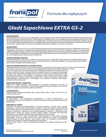 Gad Szpachlowa EXTRA GS-2 ZASTOSOWANIE Gad Szpachlowa Extra GS-2 jest wysokiej jakoci, wolnowicym materiaem wykoczeniowym. Przeznaczona jest gównie do prac remontowych, wykoczeniowych i dekoracyjnych w budownictwie, a w szczególnoci pozwala doprowadzi ciany i sufity do idealnej gadkoci przed malowaniem. Jest doskonaym materiaem sucym do ostatecznego wypeniania ubytków, bruzd, rys na tynkach. Suy do szpachlowania na podoach betonowych, tynkach cementowo-wapiennych i cementowych wewntrz pomieszcze. Spoiwa tego nie stosuje si na podoa drewniane, metalowe i z tworzyw sztucznych. WACIWOCI Gad Szpachlowa Extra GS-2 jest such mieszank produkowan na bazie wyselekcjonowanych skadników naturalnych, wypeniaczy mineralnych i komponentów poprawiajcych waciwoci techniczne i uytkowe zaprawy. Przygotowana z Gadzi Szpachlowej Extra zaprawa ma bardzo dobr przyczepno i atwo rozprowadza si po podou. Po wyschniciu bez trudu poddaje si szlifowaniu tworzc doskonae podoe pod malowanie lub tapetowanie. Du zalet jest biel produktu, co zmniejsza zuycie farby podczas malowania. PRZYGOTOWANIE PODOA Podoe powinno by suche, none, stabilne i oczyszczone z kurzu, resztek farb i innych zabrudze. Podoa naley zagruntowa preparatem gruntujcym (np. Frans Grunt lub Royal Grunt). Wszystkie stykajce si z zapraw elementy stalowe powinny by zabezpieczone antykorozyjnie. PRZYGOTOWANIE PRODUKTU I SPOSÓB UYCIA Gad Szpachlow Extra GS-2 naley powoli wsypywa do wody (na 1kg proszku uy ok. 0,4 litra wody). Nastpnie wymiesza rcznie lub mechanicznie w celu uzyskania jednorodnej masy. Naley odczeka 15 minut i ponownie wymiesza. Nie zuyta zaprawa po rozpoczciu wizania nie nadaje si do powtórnego zarobienia wod i naley j odrzuci, poniewa skraca czas wizania nastpnego zaczynu. Mas szpachlow naciga si równomiernie za pomoc nierdzewnej pacy, silnie dociskajc do podoa. Po naoeniu i wyschniciu masy drobne nierównoci naley usun papierem ciernym lub siatk do szlifowania. Podczas wysychania naley unika bezporedniego nasonecznienia i przecigów oraz zapewni waciw wentylacj i przewietrzenie pomieszcze. PRZECHOWYWANIE I TRANSPORT Gad GS-2 naley przewozi i przechowywa w szczelnie zamknitych workach, na paletach, w suchych warunkach. Chroni przed wilgoci. Nieprzestrzeganie w/w zalece moe mie wpyw na parametry uytkowe produktu. CZAS WIZANIA: Przygotowan wedug powyszego opisu mas naley zuy w cigu 120 min od momentu wymieszania. OKRES SKADOWANIA: W oryginalnym i nie uszkodzonym opakowaniu, w suchym pomieszczeniu i na drewnianych paletach okres skadowania wynosi 9 miesicy od daty produkcji podanej na opakowaniu. GWARANCJE I UWAGI: Producent nie ponosi odpowiedzialnoci za skutki powstae w wyniku uycia wyrobu niezgodnie z powyszymi wskazówkami, zasadami sztuki budowlanej oraz przepisami BHP. Gwarantujemy niezawodn jako naszych produktów. Nasze zalecenia, co do sposobu stosowania opieraj si na przeprowadzonych próbach i dowiadczeniach praktycznych. Mog one jednak stanowi jedynie ogólne wskazówki bez gwarancji waciwoci i nie zwalniaj uytkownika z prowadzenia wasnych prób. Gad Szpachlowa Extra GS-2 jest produktem nietoksycznym w trakcie uycia i podczas eksploatacji, mimo to naley chroni oczy, ukad oddechowy i skór. W przypadku bezporedniego kontaktu przemy du iloci wody. Po wystpieniu jakichkolwiek negatywnych objawów naley skontaktowa si z lekarzem. Chroni przed dziemi. Karta charakterystyki dostpna na danie podmiotu gospodarczego. Produkt posiada atest PZH Wyrób spenia wymagania PN-EN 13279-1:2008 Dostpne opakowania: 20/15/5 kg www.franspol.com.pl