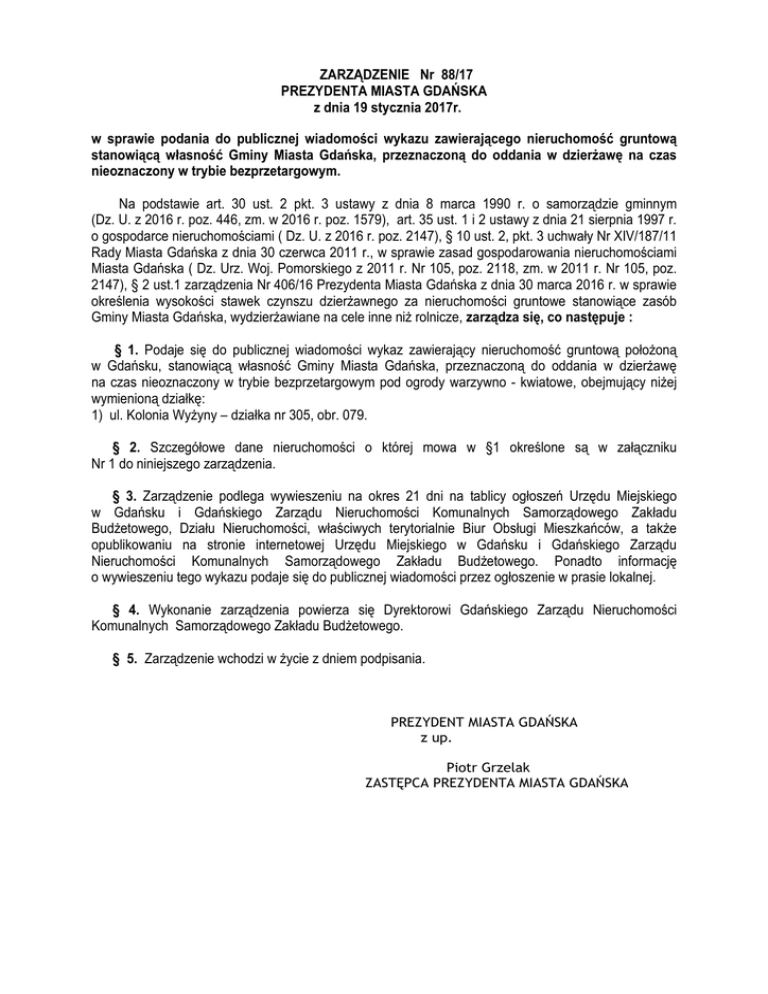ZARZĄDZENIE Nr 88/17 PREZYDENTA MIASTA GDAŃSKA z dnia 19 stycznia 2017r. w sprawie podania do publicznej wiadomości wykazu zawierającego nieruchomość gruntową stanowiącą własność Gminy Miasta Gdańska, przeznaczoną do oddania w dzierżawę na czas nieoznaczony w trybie bezprzetargowym. Na podstawie art. 30 ust. 2 pkt. 3 ustawy z dnia 8 marca 1990 r. o samorządzie gminnym (Dz. U. z 2016 r. poz. 446, zm. w 2016 r. poz. 1579), art. 35 ust. 1 i 2 ustawy z dnia 21 sierpnia 1997 r. o gospodarce nieruchomościami ( Dz. U. z 2016 r. poz. 2147), § 10 ust. 2, pkt. 3 uchwały Nr XIV/187/11 Rady Miasta Gdańska z dnia 30 czerwca 2011 r., w sprawie zasad gospodarowania nieruchomościami Miasta Gdańska ( Dz. Urz. Woj. Pomorskiego z 2011 r. Nr 105, poz. 2118, zm. w 2011 r. Nr 105, poz. 2147), § 2 ust.1 zarządzenia Nr 406/16 Prezydenta Miasta Gdańska z dnia 30 marca 2016 r. w sprawie określenia wysokości stawek czynszu dzierżawnego za nieruchomości gruntowe stanowiące zasób Gminy Miasta Gdańska, wydzierżawiane na cele inne niż rolnicze, zarządza się, co następuje : § 1. Podaje się do publicznej wiadomości wykaz zawierający nieruchomość gruntową położoną w Gdańsku, stanowiącą własność Gminy Miasta Gdańska, przeznaczoną do oddania w dzierżawę na czas nieoznaczony w trybie bezprzetargowym pod ogrody warzywno - kwiatowe, obejmujący niżej wymienioną działkę: 1) ul. Kolonia Wyżyny – działka nr 305, obr. 079. § 2. Szczegółowe dane nieruchomości o której mowa w §1 określone są w załączniku Nr 1 do niniejszego zarządzenia. § 3. Zarządzenie podlega wywieszeniu na okres 21 dni na tablicy ogłoszeń Urzędu Miejskiego w Gdańsku i Gdańskiego Zarządu Nieruchomości Komunalnych Samorządowego Zakładu Budżetowego, Działu Nieruchomości, właściwych terytorialnie Biur Obsługi Mieszkańców, a także opublikowaniu na stronie internetowej Urzędu Miejskiego w Gdańsku i Gdańskiego Zarządu Nieruchomości Komunalnych Samorządowego Zakładu Budżetowego. Ponadto informację o wywieszeniu tego wykazu podaje się do publicznej wiadomości przez ogłoszenie w prasie lokalnej. § 4. Wykonanie zarządzenia powierza się Dyrektorowi Gdańskiego Zarządu Nieruchomości Komunalnych Samorządowego Zakładu Budżetowego. § 5. Zarządzenie wchodzi w życie z dniem podpisania. PREZYDENT MIASTA GDAŃSKA z up. Piotr Grzelak ZASTĘPCA PREZYDENTA MIASTA GDAŃSKA