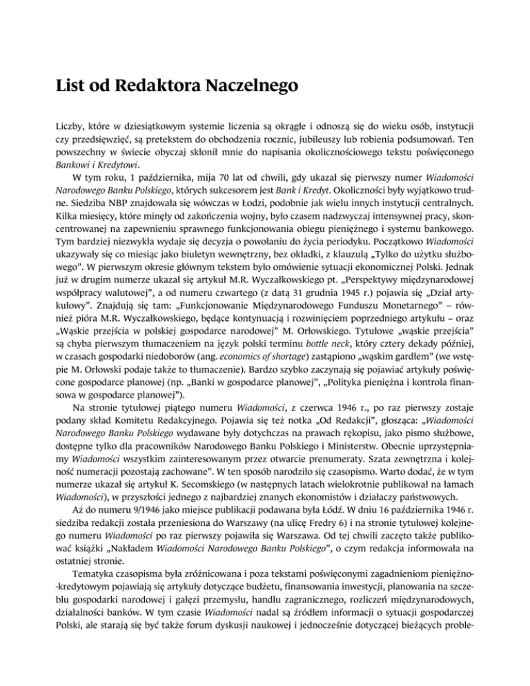 List od Redaktora Naczelnego Liczby, które w dziesiątkowym systemie liczenia są okrągłe i odnoszą się do wieku osób, instytucji czy przedsięwzięć, są pretekstem do obchodzenia rocznic, jubileuszy lub robienia podsumowań. Ten powszechny w świecie obyczaj skłonił mnie do napisania okolicznościowego tekstu poświęconego Bankowi i Kredytowi. W tym roku, 1 października, mija 70 lat od chwili, gdy ukazał się pierwszy numer Wiadomości Narodowego Banku Polskiego, których sukcesorem jest Bank i Kredyt. Okoliczności były wyjątkowo trudne. Siedziba NBP znajdowała się wówczas w Łodzi, podobnie jak wielu innych instytucji centralnych. Kilka miesięcy, które minęły od zakończenia wojny, było czasem nadzwyczaj intensywnej pracy, skoncentrowanej na zapewnieniu sprawnego funkcjonowania obiegu pieniężnego i systemu bankowego. Tym bardziej niezwykła wydaje się decyzja o powołaniu do życia periodyku. Początkowo Wiadomości ukazywały się co miesiąc jako biuletyn wewnętrzny, bez okładki, z klauzulą „Tylko do użytku służbowego”. W pierwszym okresie głównym tekstem było omówienie sytuacji ekonomicznej Polski. Jednak już w drugim numerze ukazał się artykuł M.R. Wyczałkowskiego pt. „Perspektywy międzynarodowej współpracy walutowej”, a od numeru czwartego (z datą 31 grudnia 1945 r.) pojawia się „Dział artykułowy”. Znajdują się tam: „Funkcjonowanie Międzynarodowego Funduszu Monetarnego” – również pióra M.R. Wyczałkowskiego, będące kontynuacją i rozwinięciem poprzedniego artykułu − oraz „Wąskie przejścia w polskiej gospodarce narodowej” M. Orłowskiego. Tytułowe „wąskie przejścia” są chyba pierwszym tłumaczeniem na język polski terminu bottle neck, który cztery dekady później, w czasach gospodarki niedoborów (ang. economics of shortage) zastąpiono „wąskim gardłem” (we wstępie M. Orłowski podaje także to tłumaczenie). Bardzo szybko zaczynają się pojawiać artykuły poświęcone gospodarce planowej (np. „Banki w gospodarce planowej”, „Polityka pieniężna i kontrola finansowa w gospodarce planowej”). Na stronie tytułowej piątego numeru Wiadomości, z czerwca 1946 r., po raz pierwszy zostaje podany skład Komitetu Redakcyjnego. Pojawia się też notka „Od Redakcji”, głosząca: „Wiadomości Narodowego Banku Polskiego wydawane były dotychczas na prawach rękopisu, jako pismo służbowe, dostępne tylko dla pracowników Narodowego Banku Polskiego i Ministerstw. Obecnie uprzystępniamy Wiadomości wszystkim zainteresowanym przez otwarcie prenumeraty. Szata zewnętrzna i kolejność numeracji pozostają zachowane”. W ten sposób narodziło się czasopismo. Warto dodać, że w tym numerze ukazał się artykuł K. Secomskiego (w następnych latach wielokrotnie publikował na łamach Wiadomości), w przyszłości jednego z najbardziej znanych ekonomistów i działaczy państwowych. Aż do numeru 9/1946 jako miejsce publikacji podawana była Łódź. W dniu 16 października 1946 r. siedziba redakcji została przeniesiona do Warszawy (na ulicę Fredry 6) i na stronie tytułowej kolejnego numeru Wiadomości po raz pierwszy pojawiła się Warszawa. Od tej chwili zaczęto także publikować książki „Nakładem Wiadomości Narodowego Banku Polskiego”, o czym redakcja informowała na ostatniej stronie. Tematyka czasopisma była zróżnicowana i poza tekstami poświęconymi zagadnieniom pieniężno-kredytowym pojawiają się artykuły dotyczące budżetu, finansowania inwestycji, planowania na szczeblu gospodarki narodowej i gałęzi przemysłu, handlu zagranicznego, rozliczeń międzynarodowych, działalności banków. W tym czasie Wiadomości nadal są źródłem informacji o sytuacji gospodarczej Polski, ale starają się być także forum dyskusji naukowej i jednocześnie dotyczącej bieżących proble- II mów praktyki bankowej (głównie banku centralnego). Utrzymanie właściwych proporcji nie jest łatwe, zwłaszcza w związku ze zmianami ustrojowymi dokonującymi się w Polsce. Numer 11−12/1949 otwiera notka: „Numer niniejszy jest ostatnim numerem czasopisma Wiadomości Narodowego Banku Polskiego, wychodzącego od 1945 r. oraz będącego w kolportażu krajowym i zagranicznym”. W rzeczy samej: począwszy od numeru 1/1950 powraca zastrzeżenie „Tylko do użytku służbowego”. Zmieniona zostaje szata graficzna (dodano okładkę), która z nieznacznymi korektami przetrwała do końca 1969 r. Przede wszystkim zmieniono jednak strukturę Wiadomości; odtąd tworzą ją działy: „Artykułowy”, „Organizacja i technika finansowa”, „Dział instrukcyjny”, „Dział racjonalizacji”, „Pytania i odpowiedzi” oraz „Bibliografia”. Niestety, jest to odbiciem procesów politycznych zachodzących w Polsce i fatalnie wpływa na poziom pisma. Z numeru 12/1950 znika nawet „Dział artykułowy” i zostaje zastąpiony „Działem ogólnym”, w którym publikowane są uchwały Rady Ministrów, przemówienia, komunikaty NBP, komentarze, artykuły szkoleniowe. Później wraca „Dział artykułowy”, ale tylko z nazwy, zawiera bowiem bardzo różne teksty, z których zaledwie nieliczne można zakwalifikować jako naukowe. Podobnie jak w wielu innych pismach również na łamach Wiadomości sławi się naukę radziecką, rozwiązania stosowane w ZSRR, a w „Miesiącu pogłębiania przyjaźni polsko-radzieckiej” i z innych podobnych okazji pojawiają się okolicznościowe panegiryki. Ten stan rzeczy trwa do końca 1956 r. Niestety, następne lata nie przynoszą przełomu. Znika, co prawda, zastrzeżenie „Do użytku pracowników NBP” (od 1956 r.), ale tematyka artykułów najczęściej dotyczy bieżącego funkcjonowania banku, co lokuje Wiadomości pośród wielu innych pism branżowych. W 1962 r. pojawia się barwna okładka. Na łamy powracają teksty naukowe, w których autorzy posługują się matematyką, próbując nawiązać do współczesnej literatury