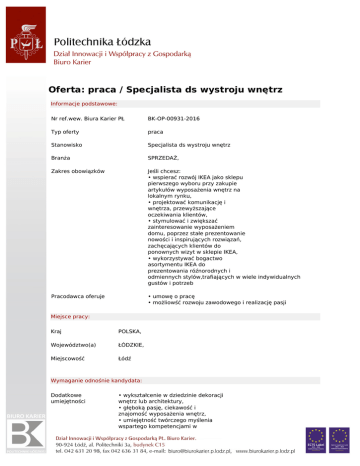 Oferta: praca / Specjalista ds wystroju wnętrz Informacje podstawowe: Nr ref.wew. Biura Karier PŁ BK-OP-00931-2016 Typ oferty praca Stanowisko Specjalista ds wystroju wnętrz Branża SPRZEDAŻ, Zakres obowiązków Jeśli chcesz: • wspierać rozwój IKEA jako sklepu pierwszego wyboru przy zakupie artykułów wyposażenia wnętrz na lokalnym rynku, • projektować komunikację i wnętrza, przewyższające oczekiwania klientów, • stymulować i zwiększać zainteresowanie wyposażeniem domu, poprzez stałe prezentowanie nowości i inspirujących rozwiązań, zachęcających klientów do ponownych wizyt w sklepie IKEA, • wykorzystywać bogactwo asortymentu IKEA do prezentowania róźnorodnych i odmiennych stylów,trafiających w wiele indywidualnych gustów i potrzeb Pracodawca oferuje • umowę o pracę • możliowść rozwoju zawodowego i realizację pasji Miejsce pracy: Kraj POLSKA, Województwo(a) ŁÓDZKIE, Miejscowość Łódź Wymaganie odnośnie kandydata: Dodatkowe umiejętności • wykształcenie w dziedzinie dekoracji wnętrz lub architektury, • głęboką pasję, ciekawość i znajomość wyposażenia wnętrz, • umiejętność twórczego myślenia wspartego kompetencjami w komercyjnej wizualizacji i estetycznego spojrzenia, • umiejętność aktywnego poszukiwania nowych metod pracy, • praktyczne podejście do swoich obowiązków i umiejętność pracy w szybko zmieniającym się środowisku, • znajomość obsługi programów AutoCAD, InDesign, • znajomość języka angielskiego Dane kontaktowe: Nazwa firmy/Pracodawcy Kraj Województwo Miasto Adres Kod pocztowy Opis firmy IKEA Retail Sp Z o.o. POLSKA ŁÓDZKIE Łódź Ul Pabianicka 255 93-457 IKEA oferuje szeroki asortyment, dobrze zaprojektowanych, funkcjonalnych elementów wyposażenia domu w cenach tak niskich, by wielu ludzi mogło sobie na nie pozwolić. Ta idea przyświeca wszystkim działaniom IKEA, od projektu przez produkcję, aż po sprzedaż artykułów w sklepach IKEA.Unikalna kultura IKEA sprawia, że jesteśmy pracodawcą dla wielu ludzi. Ludzie są dla nas najważniejsi, dlatego przykładamy ogromną wagę do tego, kogo zapraszamy do współpracy. Szukamy tych, którzy podzielają nasze wartości, otwartych, szczerych, osób, które lubią ludzi i lubią rozmawiać z naszymi klientami. Brzmi dobrze? dołącz do nas! Data umieszczenia: Oferta ważna od 25-04-2016 do 15-05-2018 Politechnika Łódzka, jest wpisana pod numerem 2414 do rejestru podmiotów prowadzących agencje zatrudnienia.