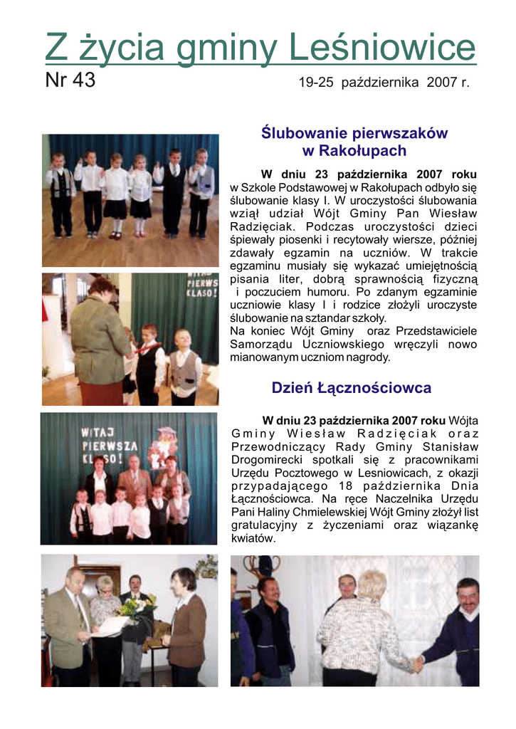 Z ¿ycia gminy Leœniowice Nr 43 19-25 paŸdziernika 2007 r. Œlubowanie pierwszaków w Rako³upach W dniu 23 paŸdziernika 2007 roku w Szkole Podstawowej w Rako³upach odby³o siê œlubowanie klasy I. W uroczystoœci œlubowania wzi¹³ udzia³ Wójt Gminy Pan Wies³aw Radziêciak. Podczas uroczystoœci dzieci œpiewa³y piosenki i recytowa³y wiersze, póŸniej zdawa³y egzamin na uczniów. W trakcie egzaminu musia³y siê wykazaæ umiejêtnoœci¹ pisania liter, dobr¹ sprawnoœci¹ fizyczn¹ i poczuciem humoru. Po zdanym egzaminie uczniowie klasy I i rodzice z³o¿yli uroczyste œlubowanie na sztandar szko³y. Na koniec Wójt Gminy oraz Przedstawiciele Samorz¹du Uczniowskiego wrêczyli nowo mianowanym uczniom nagrody. Dzieñ £¹cznoœciowca W dniu 23 paŸdziernika 2007 roku Wójta Gminy Wies³aw Radziêciak oraz Przewodnicz¹cy Rady Gminy Stanis³aw Drogomirecki spotkali siê z pracownikami Urzêdu Pocztowego w Lesniowicach, z okazji przypadaj¹cego 18 paŸdziernika Dnia £¹cznoœciowca. Na rêce Naczelnika Urzêdu Pani Haliny Chmielewskiej Wójt Gminy z³o¿y³ list gratulacyjny z ¿yczeniami oraz wi¹zankê kwiatów. Podsumowanie XIX edycji Alertu Ekologiczno-Zdrowotnego W dniu 17 paŸdziernika 2007 roku Szko³a Podstawowa w Sielcu ju¿ po raz szósty wziê³a udzia³ w XIX edycji Alertu EkologicznoZdrowotnego zorganizowanego w Lublinie kontynuuj¹c wiele dzia³añ prowadzonych we wczeœniejszych latach uczestnictwa. Na podsumowaniu obecni byli: dyrektor szko³y El¿bieta G³uszek, wójt Gminy Leœniowice Wies³aw Radziêciak. W tegorocznej edycji szko³a otrzyma³a wyró¿nienie I stopnia w kategorii szkó³ podstawowych i nagrodê pieniê¿n¹ w wysokoœci 1200 z³. Aby odnieœæ ten sukces podejmowa³a wiele dzia³añ o charakterze prozdrowotnym, proekologicznym i prospo³ecznym. Inicjatorami prowadzonych przedsiêwziêæ byli sami uczniowie, cz³onkowie szkolnych organizacji (Samorz¹du Uczniowskiego, LOP, PCK) wspierani przez grono pedagogiczne i rodziców. W bie¿¹cym roku szkolnym planuje wzi¹æ udzia³ w jubileuszowej XX edycji alertu. Przez okres roku szkolnego 2006/2007 szko³a zorganizowa³a wiele akcji proekologicznych o zasiêgu ogólnoœwiatowym „Sprz¹tanie œwiata”, „Dzieñ Ziemi”, oraz szkolnym „Dzieñ Niezapominajki”, „Aby wokó³ nas by³o czysto”, prozdrowotnym i prospo³ecznym- „Dzieñ bez papierosa”, „Góra grosza”, „Czerwonokrzyska Gwiazda”. Uczniowie chêtnie uczestniczyli w konkursach, wycieczkach, happeningach oraz zajêciach kó³ zainteresowañ. Udzia³ dzieci w tych formach przybli¿y³ im nie tylko problemy œrodowiska spo³eczno-przyrodniczego, ale pobudzi³ do podejmowania wielu dzia³añ na rzecz najbli¿szego otoczenia. Podejmowane przez szko³ê przedsiêwziêcia wspierane by³y przez Urz¹d Gminy Leœniowice, rodziców oraz szereg innych instytucji i organizacji dzia³aj¹cych w naszym regionie.