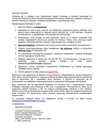 Szanowni Państwo! Podobnie jak w ubiegłym roku Departament Języka Polskiego w Dyrekcji Generalnej ds. Tłumaczeń Pisemnych (DGT) Komisji Europejskiej (KE) oferuje studentom możliwość odbycia w okresie wakacyjnym (sierpień–wrzesień) bezpłatnego 4-tygodniowego stażu. Najważniejsze informacje nt. stażu: 1. Staż ma miejsce w Luksemburgu. 2. Kandydaci na staż muszą wykazać się doskonałą znajomością języka polskiego oraz bardzo dobrą znajomością co najmniej dwóch języków UE, w tym jednego z języków proceduralnych, tj. angielskiego, francuskiego lub niemieckiego. 3. Departament może przyjąć na staż studentów, którzy są w trakcie ostatniego roku studiów magisterskich (ukończony czwarty rok studiów). Osoby, które ukończyły studia trzyletnie i otrzymały licencjat, również mogą ubiegać się o przyjęcie na staż. 4. Staż jest bezpłatny. Kandydaci sami muszą pokryć koszty utrzymania i ubezpieczenia. 5. Odbycie czterotygodniowego stażu bezpłatnego nie wyklucza odbycia w przyszłości płatnego stażu w instytucjach UE. 6. Po zakończeniu rekrutacji KE podpisuje z wybranymi studentami i uczelnią wysyłającą umowę regulującą warunki stażu. 7. Oficjalne zgłoszenia w języku EN, FR lub DE (CV, list motywacyjny i wyciąg ocen z ostatniego roku studiów) należy przesłać na adres e-mail: [email protected]. 8. Zgłoszenia można przesyłać indywidualnie. Preferowane są jednak zgłoszenia nadesłane przez uczelnię. 9. Termin zgłoszeń na staż upływa 14 maja 2010 r. Staż ma na celu zapoznanie studentów z pracą tłumacza w Departamencie Języka Polskiego w DGT. Ma on pomóc studentom w zdobyciu praktycznej wiedzy dotyczącej tłumaczeń tekstów UE oraz w zapoznaniu się z warsztatem pracy tłumacza, a poprzez to przyczynić się do podniesienia ich kwalifikacji i zwiększenia szans na znalezienie atrakcyjnego zatrudnienia. Staż rozpoczyna się od zapoznania studentów ze strukturą DGT i Departamentu Języka Polskiego, specyfiką pracy tłumacza w KE oraz z narzędziami informatycznymi, które są do dyspozycji polskich tłumaczy w KE. Po odbyciu podstawowego szkolenia w tym zakresie, stażyści otrzymują do tłumaczenia na język polski proste teksty, które są następnie sprawdzane przez tłumaczy. Po zakończeniu stażu studenci otrzymują zaświadczenie potwierdzające odbycie stażu. W przypadku dalszych pytań lub wątpliwości [email protected]. Z poważaniem Aleksandra Domańska -----------------------------Translator/Training correspondent Polish Language Department, Unit 01 Directorate General for Translation European Commission Office: JMO C4/080A, phone: +352 4301 33642 L- 2920 Luxembourg proszę o kontakt na adres e-mail: