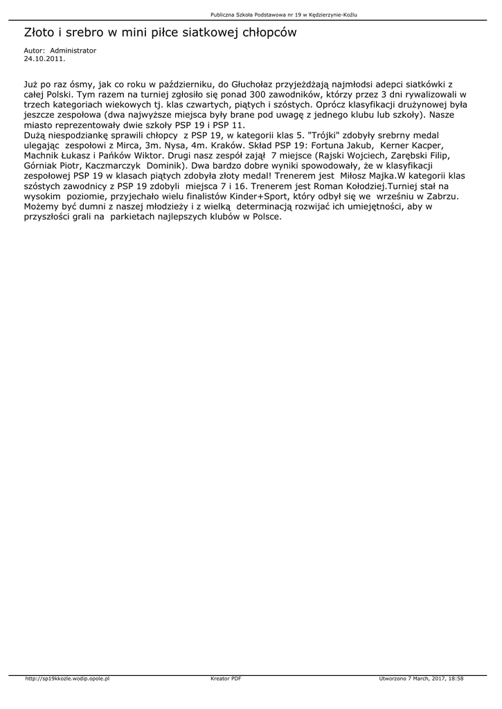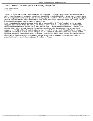 Publiczna Szkoła Podstawowa nr 19 w Kędzierzynie-Koźlu Złoto i srebro w mini piłce siatkowej chłopców Autor: Administrator 24.10.2011. Już po raz ósmy, jak co roku w październiku, do Głuchołaz przyjeżdżają najmłodsi adepci siatkówki z całej Polski. Tym razem na turniej zgłosiło się ponad 300 zawodników, którzy przez 3 dni rywalizowali w trzech kategoriach wiekowych tj. klas czwartych, piątych i szóstych. Oprócz klasyfikacji drużynowej była jeszcze zespołowa (dwa najwyższe miejsca były brane pod uwagę z jednego klubu lub szkoły). Nasze miasto reprezentowały dwie szkoły PSP 19 i PSP 11. Dużą niespodziankę sprawili chłopcy z PSP 19, w kategorii klas 5. "Trójki" zdobyły srebrny medal ulegając zespołowi z Mirca, 3m. Nysa, 4m. Kraków. Skład PSP 19: Fortuna Jakub, Kerner Kacper, Machnik Łukasz i Pańków Wiktor. Drugi nasz zespół zajął 7 miejsce (Rajski Wojciech, Zarębski Filip, Górniak Piotr, Kaczmarczyk Dominik). Dwa bardzo dobre wyniki spowodowały, że w klasyfikacji zespołowej PSP 19 w klasach piątych zdobyła złoty medal! Trenerem jest Miłosz Majka.W kategorii klas szóstych zawodnicy z PSP 19 zdobyli miejsca 7 i 16. Trenerem jest Roman Kołodziej.Turniej stał na wysokim poziomie, przyjechało wielu finalistów Kinder+Sport, który odbył się we wrześniu w Zabrzu. Możemy być dumni z naszej młodzieży i z wielką determinacją rozwijać ich umiejętności, aby w przyszłości grali na parkietach najlepszych klubów w Polsce. http://sp19kkozle.wodip.opole.pl Kreator PDF Utworzono 7 March, 2017, 18:58
