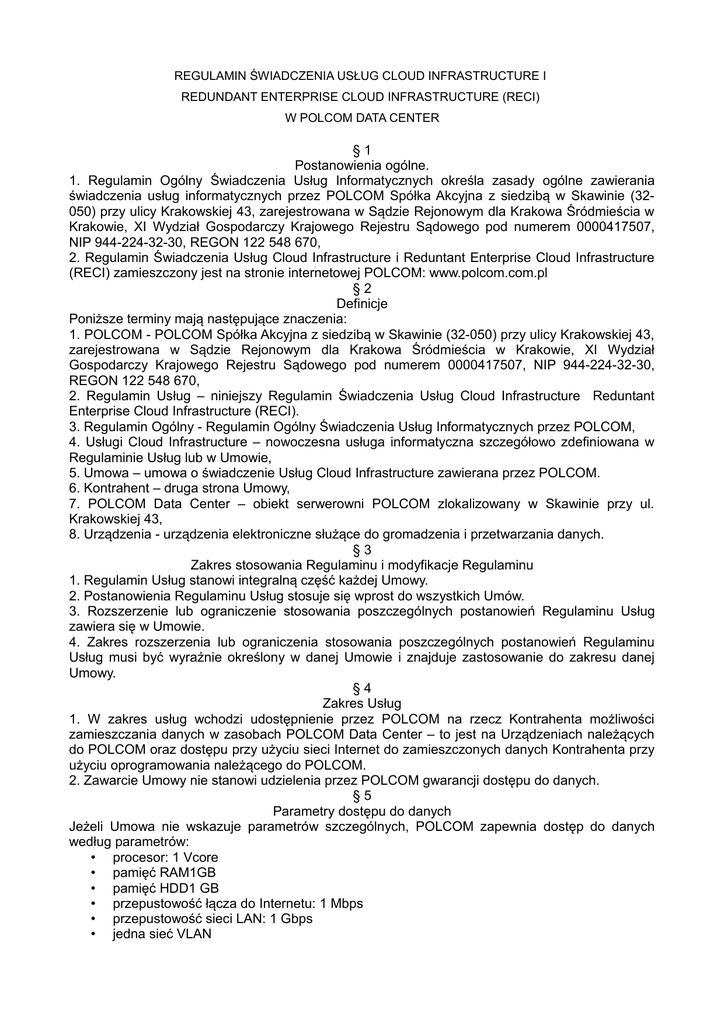 REGULAMIN ŚWIADCZENIA USŁUG CLOUD INFRASTRUCTURE I REDUNDANT ENTERPRISE CLOUD INFRASTRUCTURE (RECI) W POLCOM DATA CENTER §1 Postanowienia ogólne. 1. Regulamin Ogólny Świadczenia Usług Informatycznych określa zasady ogólne zawierania świadczenia usług informatycznych przez POLCOM Spółka Akcyjna z siedzibą w Skawinie (32050) przy ulicy Krakowskiej 43, zarejestrowana w Sądzie Rejonowym dla Krakowa Śródmieścia w Krakowie, XI Wydział Gospodarczy Krajowego Rejestru Sądowego pod numerem 0000417507, NIP 944-224-32-30, REGON 122 548 670, 2. Regulamin Świadczenia Usług Cloud Infrastructure i Reduntant Enterprise Cloud Infrastructure (RECI) zamieszczony jest na stronie internetowej POLCOM: www.polcom.com.pl §2 Definicje Poniższe terminy mają następujące znaczenia: 1. POLCOM - POLCOM Spółka Akcyjna z siedzibą w Skawinie (32-050) przy ulicy Krakowskiej 43, zarejestrowana w Sądzie Rejonowym dla Krakowa Śródmieścia w Krakowie, XI Wydział Gospodarczy Krajowego Rejestru Sądowego pod numerem 0000417507, NIP 944-224-32-30, REGON 122 548 670, 2. Regulamin Usług – niniejszy Regulamin Świadczenia Usług Cloud Infrastructure Reduntant Enterprise Cloud Infrastructure (RECI). 3. Regulamin Ogólny - Regulamin Ogólny Świadczenia Usług Informatycznych przez POLCOM, 4. Usługi Cloud Infrastructure – nowoczesna usługa informatyczna szczegółowo zdefiniowana w Regulaminie Usług lub w Umowie, 5. Umowa – umowa o świadczenie Usług Cloud Infrastructure zawierana przez POLCOM. 6. Kontrahent – druga strona Umowy, 7. POLCOM Data Center – obiekt serwerowni POLCOM zlokalizowany w Skawinie przy ul. Krakowskiej 43, 8. Urządzenia - urządzenia elektroniczne służące do gromadzenia i przetwarzania danych. §3 Zakres stosowania Regulaminu i modyfikacje Regulaminu 1. Regulamin Usług stanowi integralną część każdej Umowy. 2. Postanowienia Regulaminu Usług stosuje się wprost do wszystkich Umów. 3. Rozszerzenie lub ograniczenie stosowania poszczególnych postanowień Regulaminu Usług zawiera się w Umowie. 4. Zakres rozszerzenia lub ograniczenia stosowania poszczególnych postanowień Regulaminu Usług musi być wyraźnie określony w danej Umowie i znajduje zastosowanie do zakresu danej Umowy. §4 Zakres Usług 1. W zakres usług wchodzi udostępnienie przez POLCOM na rzecz Kontrahenta możliwości zamieszczania danych w zasobach POLCOM Data Center – to jest na Urządzeniach należących do POLCOM oraz dostępu przy użyciu sieci Internet do zamieszczonych danych Kontrahenta przy użyciu oprogramowania należącego do POLCOM. 2. Zawarcie Umowy nie stanowi udzielenia przez POLCOM gwarancji dostępu do danych. §5 Parametry dostępu do danych Jeżeli Umowa nie wskazuje parametrów szczególnych, POLCOM zapewnia dostęp do danych według parametrów: • procesor: 1 Vcore • pamięć RAM1GB • pamięć HDD1 GB • przepustowość łącza do Internetu: 1 Mbps • przepustowość sieci LAN: 1 Gbps • jedna sieć VLAN REGULAMIN ŚWIADCZENIA USŁUG CLOUD INFRASTRUCTURE I REDUNDANT ENTERPRISE CLOUD INFRASTRUCTURE (RECI) W POLCOM DATA CENTER §6 Cena Usług Cloud Infrastructure 1. Cena Usług Cloud Infrastructure określona jest w Umowie. §7 Dostęp do danych 1. Wyłącznym dysponentem danych jest Kontrahent. 2. POLCOM, bez wyraźnego upoważnienia Kontrahenta, nie ma dostępu do danych w zasobach Urządzenia. 3. Zasady dostępu do danych przez upoważnione organy określają obowiązujące przepisy. 4. POLCOM nie odpowiada za dane zgromadzone przez Kontrahenta, w tym za utratę albo uszkodzenie danych. 5. Usługa świadczona w ramach Umowy z Kontrahentem nie jest usługą powszechną w rozumieniu ustawy Prawo Telekomunikacyjne (Dz.U.2016.1489 t.j.) i nie stosuje się do niej ograniczeń w zakresie zawieszenia lub zaprzestania świadczenia usług. Powyższe przypadki określa Umowa z Kontrahentem. §8 Usługi dodatkowe Kontrahent może powierzyć na zasadach określonych w Umowie wykonywanie przez POLCOM czynności przewidzianych w art. 31 ustawy o ochronie danych osobowych. §9 Warunki korzystania z produktów i licencji oprogramowania komercyjnego oraz oprogramowania Microsoft Corporation 1. Kontrahent zobowiązuje się do przestrzegania wszelkich wymogów licencyjnych związanych z użytkowaniem przez Kontrahenta każdego oprogramowania komercyjnego (dotyczy m.in. IBM, IFS, Microsoft, Oracle, SAP), do którego Kontrahent posiada uprawnienia i które uruchamiane będzie w związku z Usługami Cloud Infrastructure. 2. Kontrahent wykorzystujący w ramach świadczonych przez POLCOM Usług Cloud Infrastructure produkty objęte licencją Microsoft Corporation („Produkty Microsoft”) zobowiązuje się do przestrzegania warunków określonych dokumencie „End User License Terms”, które stanowią załącznik do niniejszego regulaminu, a także innych warunków licencyjnych korzystania z Produktów Microsoft określonych przez Microsoft Corporation; 3. Ponadto Kontrahent zobowiązuje się do przestrzegania wymogów ogólnych zawartych w umowie licencyjnej zawartej przez POLCOM z Microsoft Corporation, w tym: a. Kontrahent zobowiązuje się do nie usuwania, nie modyfikowania, nie ukrywania praw autorskich, znaków towarowych lub innych praw własności intelektualnych odnoszących się do Produktów Microsoft; b. Kontrahent zobowiązuje się do nie odtwarzania kodów źródłowych oraz nie dekompilowania Produktów Microsoft, z wyłączeniem przypadków, w którym działania takie są wprost dozwolone zgodnie z obowiązującymi przepisami prawa; c. Kontrahent zrzeka się – w zakresie dozwolonym przez obowiązujące przepisy prawa – roszczeń gwarancyjnych i innych roszczeń względem Microsoft Corporation lub jego dostawców z tytułu szkody poniesionej w związku z korzystaniem z Usług Cloud Infrastructure, niezależnie od charakteru poniesionej szkody; d. Kontrahent wyraża zgodę na przekazywanie Microsoft Corporation informacji wymaganych umową licencyjną zawa