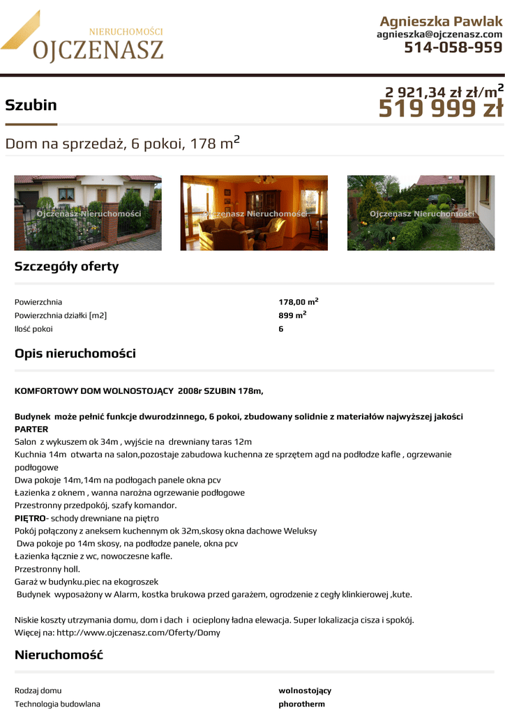 Agnieszka Pawlak [email protected] 514-058-959 2 921,34 zł zł/m2 519 999 zł Szubin Dom na sprzedaż, 6 pokoi, 178 m2 Szczegóły oferty Powierzchnia 178,00 m2 Powierzchnia działki [m2] 899 m2 Ilość pokoi 6 Opis nieruchomości KOMFORTOWY DOM WOLNOSTOJĄCY 2008r SZUBIN 178m, Budynek może pełnić funkcje dwurodzinnego, 6 pokoi, zbudowany solidnie z materiałów najwyższej jakości PARTER Salon z wykuszem ok 34m , wyjście na drewniany taras 12m Kuchnia 14m otwarta na salon,pozostaje zabudowa kuchenna ze sprzętem agd na podłodze kafle , ogrzewanie podłogowe Dwa pokoje 14m,14m na podłogach panele okna pcv Łazienka z oknem , wanna narożna ogrzewanie podłogowe Przestronny przedpokój, szafy komandor. PIĘTRO- schody drewniane na piętro Pokój połączony z aneksem kuchennym ok 32m,skosy okna dachowe Weluksy Dwa pokoje po 14m skosy, na podłodze panele, okna pcv Łazienka łącznie z wc, nowoczesne kafle. Przestronny holl. Garaż w budynku.piec na ekogroszek Budynek wyposażony w Alarm, kostka brukowa przed garażem, ogrodzenie z cegły klinkierowej ,kute. Niskie koszty utrzymania domu, dom i dach i ocieplony ładna elewacja. Super lokalizacja cisza i spokój. Więcej na: http://www.ojczenasz.com/Oferty/Domy Nieruchomość Rodzaj domu wolnostojący Technologia budowlana phorotherm Standard Ilość pięter w budynku 2 Wymiary działki 35 m Garaż w budynku Stan prawny Własność Okna nowe PCV Instalacje nowe Balkon taras Ilość tarasów 1 Zagosp. działki zagospodarowana Ukształtowanie działki płaska Pokrycie dachu dachówka ceramiczna Pozwolenie na użytkowanie tak Ogrodzenie działki cegła klinkierowa Rok budowy 2008 Woda tak Otoczenie działki zabudowane Ogrzewanie własne - piec na ekogroszek Odległość do komunikacji publicznej [m] 500 m Odległość do sklepu 500 m Odległość do szkoły 500 m Odległość do przedszkola 500 m Prąd jest Kanalizacja szambo