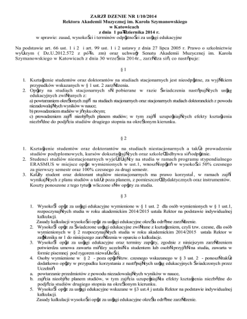 ZARZĄDZENIE NR 1/10/2014 Rektora Akademii Muzycznej im. Karola Szymanowskiego w Katowicach z dnia 1 października 2014 r. w sprawie: zasad, wysokości i terminów odpłatności za usługi edukacyjne Na podstawie art. 66 ust. 1 i 2 i art. 99 ust. 1 i 2 ustawy z dnia 27 lipca 2005 r. Prawo o szkolnictwie wyższym ( Dz.U.2012.572 z późn. zm) oraz uchwały Senatu Akademii Muzycznej im. Karola Szymanowskiego w Katowicach z dnia 30 września 2014r., zarządza się, co następuje: §1 1. Kształcenie studentów oraz doktorantów na studiach stacjonarnych jest nieodpłatne, za wyjątkiem przypadków wskazanych w § 1 ust. 2 zarządzenia. 2. Opłaty na studiach stacjonarnych są pobierane w razie świadczenia następujących usług edukacyjnych związanych z: a) powtarzaniem określonych zajęć na studiach stacjonarnych oraz stacjonarnych studiach doktoranckich z powodu niezadowalających wyników w nauce; b) prowadzeniem studiów w języku obcym; c) prowadzeniem zajęć nieobjętych planem studiów; w tym zajęć uzupełniających efekty kształcenia niezbędne do podjęcia studiów drugiego stopnia na określonym kierunku. §2 1. Kształcenie studentów oraz doktorantów na studiach niestacjonarnych a także prowadzenie studiów podyplomowych, kursów dokształcających oraz szkoleń odbywa się odpłatnie. 2. Studenci studiów niestacjonarnych wyjeżdżający na studia w ramach programu stypendialnego ERASMUS w miejsce opłat wymienionych w ust.1, wnoszą opłatę w wysokości 50% czesnego za pierwszy semestr oraz 100% czesnego za drugi semestr. 3. Każdy student oraz doktorant studiów niestacjonarnych ma prawo korzystać, w ramach zajęć wynikających z planu studiów a także poza planem, z pomieszczeń dydaktycznych oraz instrumentów. Koszty ponoszone z tego tytułu wliczone są w opłaty za studia. §3 1. Wysokość opłat za usługi edukacyjne wymienione w § 1 ust. 2 dla osób wymienionych w § 1 ust.1, rozpoczynających studia w roku akademickim 2014/2015 ustala Rektor na podstawie indywidualnej kalkulacji. Zasady kalkulacji wysokości opłat za usługi edukacyjne określa odrębne zarządzenie. 2. Wysokość opłat za świadczone usługi edukacyjne związane z kształceniem, czyli tzw. czesne, dla osób wymienionych w § 2 rozpoczynających studia w roku akademickim 2014/2015 ustala Rektor w załączniku nr 1 do niniejszego zarządzenia w oparciu o kalkulacje. 3. Wysokość opłat za usługi edukacyjne oraz terminy zapłaty, zgodnie z niniejszym zarządzeniem potwierdza umowa zawarta między uczelnią a studentem lub osobą przyjętą na studia, zawarta w formie pisemnej pod rygorem nieważności. 4. Osoby wymienione w § 2 - poza opłatą tzw. czesnego wskazanego w § 3 ust. 2 - ponoszą także dodatkowo opłaty w przypadku korzystania z następujących usług edukacyjnych świadczonych przez Uczelnię: a. powtarzanie przedmiotów z powodu niezadowalających wyników w nauce, b. zajęcia nieobjęte planem studiów, w tym zajęcia uzupełniająca efekty kształcenia niezbędne do podjęcia studiów drugiego stopnia na określonym kierunku. 5. Wysokość opłat za usługi edukacyjne wskazane w §3 ust.4 j ustala Rektor na podstawie indywidualnej kalkulacji. Zasady kalkulacji wysokości opłat za usługi edukacyjne określa odrębne zarządzenie. 6. Wysokość opłat i terminy zapłaty dla studentów, doktorantów i słuchaczy przyjętych na studia w latach poprzednich, wynikają z podpisanych umów o warunkach odpłatności. §4 1. Ulgi w opłatach za zajęcia dydaktyczne mogą być przyznawane przez Rektora studentom lub doktorantom w szczególności tym, którzy osiągają wybitne wyniki w nauce lub uczestniczyli w międzynarodowych programach stypendialnych, a także będącym w wyjątkowo trudnej sytuacji materialnej- na wniosek zainteresowanego, zaopiniowany odpowiednio przez Dziekana Wydziału - dotyczy studentów studiów stacjonarnych, Kierownika Studiów Niestacjonarnych dotyczy studentów studiów niestacjonarnych oraz samorząd studencki lub Kierownika Studiów Doktoranckich i samorząd doktorantów. 2. Ulgi, o których mowa w ust. 1, nie mogą przekraczać 1/3 obowiązującej opłaty. 3. Rektor na wniosek studenta może przyznać ulgę w opłatach za zajęcia dydaktyczne na studiach niestacjonarnych w przypadku, gdy student podejmuje studia jednocześnie na dwóch kierunkach w Akademii Muzycznej im. Karola Szymanowskiego i część z realizowanych zajęć jest dla tych kierunków wspólna. 4. Skutki ulg, o których mowa w ust. 1 obciążają rozliczenie finansowe właściwych studiów. §5 1. Studenci studiów niestacjonarnych, doktoranci studiów niestacjonarnych oraz słuchacze studiów podyplomowych rozpoczynający zajęcia w Akademii Muzycznej im. Karola Szymanowskiego w roku akademickim 2014/2015, obowiązani są wnieść opłatę z tytułu czesnego w terminach: a. do 30 października - za semestr zimowy, b. do 15 lutego - za semestr letni 2. Studenci, doktoranci oraz słuchacze studiów podyplomowych nie wymienieni w § 5 ust. 1 obowiązani są wnieść opłatę z tytułu czesnego w terminach wynikających z podpisanych umów o warunkach odpłatności, przy czym za datę spełnienia świadczenia uważa się, zgodnie z art. 454 § 1 KC, datę wpływu na konto Akademii. 3. Terminy zapłaty pozostałych opłat za studia ustalane są decyzją odpowiednio Dziekana lub Pełnomocnika Rektora ds. MSP z zastrzeżeniem, że termin zapłaty nie może być krótszy niż 7 dni od dnia wydania decyzji 4. Dokonanie wpłaty po ustalonym terminie spowoduje naliczenie odsetek za opóźnienie w ustawowej wysokości. 5. Brak wpłaty może spowodować skreślenie z listy studentów, doktorantów oraz słuchaczy. §6 1. W przypadku gdy Student , Doktorant lub Słuchacz złoży do Dziekana pisemną rezygnację ze studiów po terminie rozpoczęcia zajęć dydaktycznych, za które opłata została wniesiona Uczelnia zwraca Studentowi, Doktorantowi lub Słuchaczowi część opłaty semes