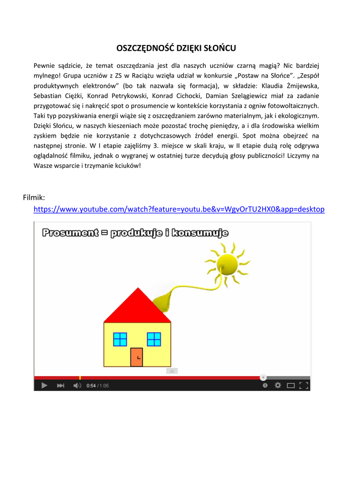 OSZCZĘDNOŚĆ DZIĘKI SŁOŃCU Pewnie sądzicie, że temat oszczędzania jest dla naszych uczniów czarną magią? Nic bardziej mylnego! Grupa uczniów z ZS w Raciążu wzięła udział w konkursie „Postaw na Słońce”. „Zespół produktywnych elektronów” (bo tak nazwała się formacja), w składzie: Klaudia Żmijewska, Sebastian Ciężki, Konrad Petrykowski, Konrad Cichocki, Damian Szelągiewicz miał za zadanie przygotować się i nakręcić spot o prosumencie w kontekście korzystania z ogniw fotowoltaicznych. Taki typ pozyskiwania energii wiąże się z oszczędzaniem zarówno materialnym, jak i ekologicznym. Dzięki Słońcu, w naszych kieszeniach może pozostać trochę pieniędzy, a i dla środowiska wielkim zyskiem będzie nie korzystanie z dotychczasowych źródeł energii. Spot można obejrzeć na następnej stronie. W I etapie zajęliśmy 3. miejsce w skali kraju, w II etapie dużą rolę odgrywa oglądalność filmiku, jednak o wygranej w ostatniej turze decydują głosy publiczności! Liczymy na Wasze wsparcie i trzymanie kciuków! Filmik: https://www.youtube.com/watch?feature=youtu.be&v=WgvOrTU2HX0&app=desktop