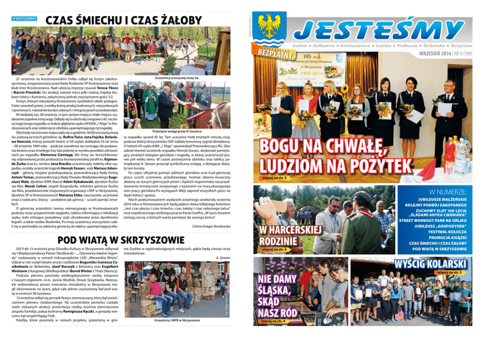 CZAS ŚMIECHU I CZAS ŻAŁOBY ISSN 1429-6721 SP KROSTOSZOWICE Godów ● Gołkowice ● Krostoszowice ● Łaziska ● Podbucze ● Skrbeńsko ● Skrzyszów WRZESIEŃ 2014 | NR 9 (109) fot. K. Gąsior Uczestnicy uroczystej mszy św. fot. K. Gąsior 27 września na krostoszowickim Orliku odbył się festyn szkolnosportowy, zorganizowany przez Radę Rodziców SP Krostoszowice oraz klub Inter Krostoszowice. Nad całością imprezy czuwali Teresa Tkocz i Marcin Piwoński. Do atrakcji należał mecz piłki nożnej między klubami Interu i Kamienia, zakończony jednak zwycięstwem gości 3:2. Festyn, którym mieszkańcy Krostoszowic i pobliskich okolic pożegnali lato i powitali jesień, z wielką ilością atrakcji kulinarnych, rozrywkowych i sportowych, należał do bardzo udanych i integracyjnych przedsięwzięć. W niedzielę zaś, 28 września, w tym samym miejscu miało miejsce wydarzenie zupełnie innej wagi. Odbyły się tu obchody związane z 45. rocznicą tragicznego wypadku w trakcie głębienia szybu VII KWK „1 Maja” w Krostoszowicach oraz odsłonięcie obelisku upamiętniającego tę tragedię. Obchody rocznicowe rozpoczęły się o godzinie 16:00 uroczystą mszą św. polową za trzech górników: śp. Rufina Tulca, Jana Fojcika, Bolesława Nawrata, którzy ponieśli śmierć w VII szybie dokładnie 45 lat temu – 28 września 1969 roku – podczas zawalenia się rurociągu do podawania betonu oraz zmarłego trzy lata później w wyniku powikłań zdrowotnych po wypadku Klemensa Ciemięgę. We mszy św. koncelebrowanej odprawionej przez proboszcza krostoszowickiej parafii ks. Rajmunda Żurka oraz ks. seniora Jana Bracika uczestniczyły rodziny ofiar wypadku, ocalały uczestnik tragedii Henryk Szwarc, wójt Mariusz Adamczyk – główny inicjator przedsięwzięcia, przewodniczący Rady Gminy Antoni Tomas, przewodniczący Rady Powiatu Wodzisławskiego Eugeniusz Wala, dyrektor KWK Marcel Adam Rybakowski, dyrektor Ruchu Jas-Mos Marek Celner, zespół Gospodynki, orkiestra górnicza Ruchu Jas-Mos, przedstawiciele miejscowych organizacji i OSP w Skrzyszowie, dyrektor SP w Krostoszowicach Marzena Sitko, nauczyciele, uczniowie wraz z rodzicami, którzy – podobnie jak górnicy – uczcili pamięć zmarłych. O górniczej przeszłości terenu rekreacyjnego w Krostoszowicach podczas mszy przypominała węglarka, tablica informująca o lokalizacji szybu, koło imitujące prawdziwy szyb ufundowane przez dyrektorów kopalń, a także rzeźba Skarbnika. Po mszy uczestnicy uroczystości udali się w pochodzie za orkiestrą górniczą do tablicy upamiętniającej ofia- Przecięcie wstęgi przez H. Szwarca ry wypadku sprzed 45 lat. Tam uczczono hołd zmarłych minutą ciszy, podczas której skrzyszowska OSP oddała honorowy sygnał dźwiękowy. O historii VII szybu KWK „1 Maja” opowiedział Przewodniczący RG. Głos zabrał również uczestnik wypadku Henryk Szwarc, doskonale pamiętający zmarłych kolegów górników i tragedię, w której uczestniczył prawie pół wieku temu. W czasie poświęcenia obelisku oraz tablicy pamiątkowej H. Szwarc przeciął symboliczną wstęgę, a delegacje złożyły tam kwiaty. Po części oficjalnej pamięć zabitych górników oraz trud górniczej pracy uczcili uczniowie, przedstawiając montaż słowno-muzyczny złożony ze starych górniczych pieśni i śląskich wspomineko raz przedstawienia tematycznie związanego z kazaniem na mszy,ukazującego etos pracy górników.Po występach Wójt zaprosił wszystkich gości na śląski kołocz i gulasz.. Niech podsumowaniem wydarzeń ostatniego weekendu września 2014 roku w Krostoszowicach będą piękne słowa bilbijnego Koheleta: „Jest czas płaczu i czas śmiechu, czas żałoby i czas radosnego tańca” oraz współczesnego wielkiego pisarza Paulo Coelho: „W życiu bowiem istnieją rzeczy, o których warto pamiętać do samego końca”. Celina Grieger-Brodowska POD WIATĄ W SKRZYSZOWIE nie Godów w ogólnodostępnych miejscach, gdzie będą cieszyć oczy mieszkańców. A. Szwarc Fot. GCKSiT Godów Od 9 do 13 września przy Ośrodku Kultury w Skrzyszowie odbywał się I Międzynarodowy Plener Rzeźbiarski – ,, Ożywiamy lokalne legendy” realizowany w ramach mikroprojektów LGD ,,Morawskie Wrota”. Udział w nim wzięli lokalni artyści rzeźbiarze Bogumiła i Ireneusz Canibołowie ze Skrbeńska, Józef Burszyk z Bełsznicy oraz Engelbert Weimann z Kargowej (Wielkopolska) i Bernd Winter z Thale (Niemcy). Podczas pleneru powstały wielkogabarytowe rzeźby związane z naszym regionem, m.in. Jancio Wodnik, Drwal, Grzybiarka. Niezwykle widowiskowy proces tworzenia mieszkańcy w Skrzyszowie mogli obserwować na żywo, gdyż cały plener usytuowany był pod wiatą w centrum Skrzyszowa. 13 września odbył się jarmark-festyn ziemniaczany, który był zwieńczeniem pleneru rzeźbiarskiego. Na uczestników jarmarku czekało wiele ciekawych atrakcji: prezentacja rzeźby, kuchnia ziemniaczana zespołu Familijo, pokaz kulinarny Remigiusza Rączki, a gwiazdą wieczoru był zespół Happy Folk. Rzeźby, które powstały w ramach projektu, pozostaną w gmi- Uczestnicy I MPR w Skrzyszowie Bogu na chwałę, ludziom na pożytek więcej na str. 3 w numerze: W harcerskiej rodzinie więcej na str. 4 jubileusze małżeńskie kolejny podbój zakopanego zuchowy zlot 100-lecia „śladAmi antka cwaniaka” street workout park na orliku jubileusz „gospodynek” festiwal kołocza promocja książki czas śmiechu i czas żałoby pod wiatą w skrzyszowie WyŚcig kolarski Nie damy Śląska, skąd nasz ród więcej na str. 4 więcej na str. 5 Antonia i Paweł Hermanowie Józef i Jadwiga Jańczykowie Albertyna i Norbert Sitkowie Małgorzata i Alfred Surmowie z Gołkowic z Krostoszowic z Łazisk z Gołkowic DIAMENTOWE GODY ŚWIĘTOWALI PAŃSTWO: Halina i Bernard Berowie ze Skrzyszowa Salomea i Jerzy Kocjanowie z Krostoszowic Anna i Antoni Marcolowie ze Skrbeńska Ruta i Jan Wowreczkowie ze Skrbeńska Maria i Jaromir Wo