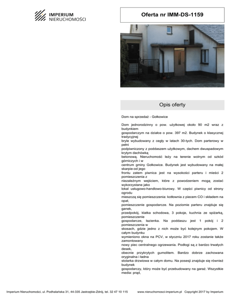 Oferta nr IMM-DS-1159 Opis oferty Dom na sprzedaż - Gołkowice Dom jednorodzinny o pow. użytkowej około 90 m2 wraz z budynkiem gospodarczym na działce o pow. 397 m2. Budynek o klasycznej tradycyjnej bryle wybudowany z cegły w latach 30-tych. Dom parterowy w pełni podpiwniczony z poddaszem użytkowym, dachem dwuspadowym krytym dachówką betonową. Nieruchomość leży na terenie wolnym od szkód górniczych i w centrum gminy Gołkowice. Budynek jest wybudowany na małej skarpie-od jego frontu zatem piwnica jest na wysokości parteru i mieści 2 pomieszczenia z niezależnym wejściem, które z powodzeniem mogą zostać wykorzystane jako lokal usługowo-handlowo-biurowy. W części piwnicy od strony ogrodu mieszczą się pomieszczenia: kotłownia z piecem CO i składem na opał, pomieszczenie gospodarcze. Na poziomie parteru znajduje się ganek, przedpokój, klatka schodowa, 3 pokoje, kuchnia ze spiżarką, pomieszczenie gospodarcze, łazienka. Na poddaszu jest 1 pokój i 2 pomieszczenia w skosach, gdzie jedno z nich może być kolejnym pokojem. W całym budynku wymieniono okna na PCV, w styczniu 2017 roku zostanie także zamontowany nowy piec centralnego ogrzewania. Podłogi są z bardzo trwałych desek, obecnie przykrytych gumolitem. Bardzo dobrze zachowana oryginalna i ładna stolarka drzwiowa w całym domu. Na posesji znajduje się również budynek gospodarczy, który może być przebudowany na garaż. Wszystkie media: prąd, Imperium Nieruchomości, ul. Podhalańska 31, 44-335 Jastrzębie-Zdrój, tel. 32 47 10 115 www.nieruchomosci-imperium.pl Copyright 2017 by Imperium Oferta nr IMM-DS-1159 Dane kontaktowe agenta Imię i nazwisko Telefon E-mail Monika Łączniak +48 511 455 644 [email protected] Informacje ogólne Lokalizacja Cena Pow. całkowita [m2] Standard Ilość pokoi Opłaty w czynszu Opłaty wg liczników Przeznaczenie działki Ukształtowanie działki Przeznaczenie lokalu Rodzaj domu Pokrycie dachu Powierzchnia użytkowa [m2] Podpiwniczenie Stan budynku Godów, (woj. ŚLĄSKIE) 165 000,00 zł 120,00 4 płaska dom jednorodzinny dachówka betonowa 90,00 Tak do remontu woda, kanalizacja gminna, przyłącze gazowe, centralne ogrzewanie piecem na opał stały, studnia. Budynek ma bezpośredni dostęp do drogi publicznej serwisowanej przez gminę. Nieruchomość jest doskonale zlokalizowana- w pieszym zasięgu znajdują się: urząd gminy, szkoła podstawowa z gimnazjum, sklepy, przychodnia zdrowia, kościół, przystanki komunikacji miejskiej z dojazdem w kierunku Jastrzębia i Wodzisławia. Szybki i dogodny dojazd do Jastrzębia-zdroju, do granicy państwowej i do węzła z autostradą A1 w Gorzyczkach. Dom wolny od zaraz. Cena 165 000 PLN Imperium Nieruchomości, ul. Podhalańska 31, 44-335 Jastrzębie-Zdrój, tel. 32 47 10 115 www.nieruchomosci-imperium.pl Copyright 2017 by Imperium