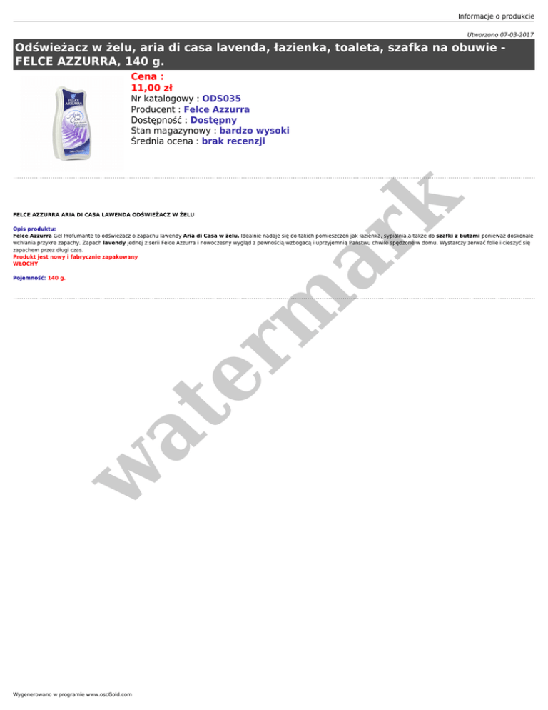 Informacje o produkcie Utworzono 07-03-2017 Odświeżacz w żelu, aria di casa lavenda, łazienka, toaleta, szafka na obuwie FELCE AZZURRA, 140 g. Cena : 11,00 zł er m ar k Nr katalogowy : ODS035 Producent : Felce Azzurra Dostępność : Dostępny Stan magazynowy : bardzo wysoki Średnia ocena : brak recenzji FELCE AZZURRA ARIA DI CASA LAWENDA ODŚWIEŻACZ W ŻELU Opis produktu: Felce Azzurra Gel Profumante to odświeżacz o zapachu lawendy Aria di Casa w żelu. Idealnie nadaje się do takich pomieszczeń jak łazienka, sypialnia,a także do szafki z butami ponieważ doskonale wchłania przykre zapachy. Zapach lavendy jednej z serii Felce Azzurra i nowoczesny wygląd z pewnością wzbogacą i uprzyjemnią Państwu chwile spędzone w domu. Wystarczy zerwać folie i cieszyć się zapachem przez długi czas. Produkt jest nowy i fabrycznie zapakowany WŁOCHY w at Pojemność: 140 g. Wygenerowano w programie www.oscGold.com