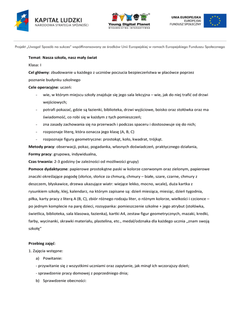 Temat: Nasza szkoła, nasz mały świat Klasa: I Cel główny: zbudowanie u każdego z uczniów poczucia bezpieczeństwa w placówce poprzez poznanie budynku szkolnego Cele operacyjne: uczeń: - wie, w którym miejscu szkoły znajduje się jego sala lekcyjna – wie, jak do niej trafić od drzwi wejściowych; - potrafi pokazać, gdzie są łazienki, biblioteka, drzwi wyjściowe, boisko oraz stołówka oraz ma świadomość, co robi się w każdym z tych pomieszczeń; - zna zasady zachowania się na przerwach i podczas spaceru i dostosowuje się do nich; - rozpoznaje literę, która oznacza jego klasę (A, B, C) - rozpoznaje figury geometryczne: prostokąt, koło, kwadrat, trójkąt. Metody pracy: obserwacji, pokaz, pogadanka, własnych doświadczeń, praktycznego działania, Formy pracy: grupowa, indywidualna, Czas trwania: 2-3 godziny (w zależności od możliwości grupy) Pomoce dydaktyczne: papierowe prostokątne paski w kolorze czerwonym oraz zielonym, papierowe znaczki określające pogodę (słońce, słońce za chmurą, chmury – białe, szare, czarne, chmury z deszczem, błyskawice, drzewa ukazujące wiatr: wiejące lekko, mocno, wcale), duża kartka z rysunkiem szkoły, klej, kalendarz, na którym zapisane są: dzień miesiąca, miesiąc, dzień tygodnia, piłka, karty pracy z literą A (B, C), zbiór różnego rodzaju liter, o różnym kolorze, wielkości i czcionce – po jednym komplecie na parę dzieci, rozsypanka: pomieszczenie szkolne + jego atrybut (stołówka, świetlica, biblioteka, sala klasowa, łazienka), kartki A4, zestaw figur geometrycznych, mazaki, kredki, farby, wycinanki, skrawki materiału, plastelina, etc., medal/odznaka dla każdego ucznia „znam swoją szkołę” Przebieg zajęć: 1. Zajęcia wstępne: a) Powitanie: - przywitanie się z wszystkimi uczniami oraz zapytanie, jak minął ich wczorajszy dzień; - sprawdzenie pracy domowej z poprzedniego dnia; b) Sprawdzenie obecności: - rozdanie uczniom zielonych papierowych prostokątnych pasków, - podejście do tablicy obecności i wyczytywanie po kolei imion i nazwisk dzieci, - umieszczenie przez każde dziecko zielonego paska w odpowiedniej przegródce (przy pomocy nauczyciela), - w miejsca dzieci, których nie ma, nauczyciel umieszcza czerwone paski, - głośne liczenie wraz z nauczycielem, ile jest czerwonych a ile zielonych pasków papieru; c) Sprawdzenie pogody - podejście do okna - obserwacja: nieba (czy jest słońce, deszcz czy chmury – i jakiego koloru), drzew (czy wieje wiatr), przechodzących ludzi (jak są ubrani), - wspólna praca: przyklejenie do dużej kartki z rysunkiem budynku szkoły znaczków odpowiadających dzisiejszej pogodzie, d) Ustalenie daty - podejście do kalendarza całą grupą, - ustalenie za pomocą kalendarza, jaki dzień jest dzisiaj (jaki dzień tygodnia, który dzień miesiąca, jaki miesiąc), - głośne powtórzenie ustalonej daty. 2. Zajęcia poznawcze: a) wyjaśnienie uczniom, że dziś wybieramy się na krótką wycieczkę, w celu dobrego poznania budynku szkolnego i otaczającego o terenu, b) ustalenie zasad panujących w trakcie wyjścia: słuchanie nauczyciela, spacer w parach, nie rozbieganie się, c) spacer do szkole – odwiedzenie miejsc typu: toalety, stołówka, świetlica, biblioteka, szatnie, gabinet pielęgniarki i wyjaśnianie do czego one służą i kiedy należy/można z nich korzystać, d) praca indywidualna – każde dziecko otrzymuje kartoniki z rysunkami pomieszczeń (łazienka, stołówka, świetlica, szatnia, biblioteka, klasa) oraz przedmiotami pasującymi do tych pomieszczeń (umywalka wraz z kranem, talerz z zupą i łyżką obok, zestaw różnych gier i układane, kurtki wiszące na wieszaku, gry planszowe, tablica z kredą) i musi je dopasować do siebie; następnie nauczyciel sprawdza poprawność wykonania zadania a dzieci wklejają pary do zeszytu; e) karta pracy: utrwalanie litery A (B, C) – pisanie po śladzie, w liniaturze, wyszukiwanie elementów zaczynających się na A (B, C); 3. Zajęcia ekspresyjne: a) każde dziecko otrzymuje kartkę A4 oraz zestaw figur: koło, trójkąt, prostokąt i kwadrat, musi wybrać z zestawu prostokąt, nakleić na kartkę, a następnie zaprojektować najpiękniejsze na świecie drzwi do swojej sali (nie zapominając o napisie: KLASA IA/IB/IC) – technika może być dowolna lub zaproponowana przez nauczyciela (proponuję różne elementy do naklejania na drzwi), b) stworzenie wystawy z prac uczniów na klasowej tablicy oraz posprzątanie stolików i sali po zajęciach plastycznych; 4. Zajęcia utrwalające: a) zabawa w zgadywanie pomieszczeń – nauczyciel mówi, co w tym pomieszczeniu można zrobić (typu: „tutaj odrabiasz zadania domowe”, „tutaj jesz śniadanie lub obiad”, „tutaj się uczysz”, „tutaj się bawisz”, „tutaj się załatwiasz”), a dzieci zgłaszają się, jeśli wiedzą, co to za miejsce – za każde prawidłowo odgadnięte pomieszczenie uczeń otrzymuje punkt, jeśli zgłosi się, ale nie wie, albo odpowie źle, nauczyciel zabiera mu punkt; 5. Zajęcia końcowe: a) wręczenie uczniom odznak „Znam swoją szkołę”; b) praca domowa: narysuj to, co najbardziej podoba ci się w mojej szkole; c) pożegnanie z uczniami.