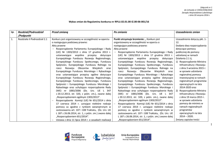 Załącznik nr 1 do Uchwały nr CXXIII/2596/2016 Zarządu Województwa Lubelskiego z dnia 30 sierpnia 2016 r. Wykaz zmian do Regulaminu konkursu nr RPLU.02.01.00-IZ.00-06-001/16 Lp. Rozdział/Podrozdział /Podpunkt Przed zmianą Po zmianie Uzasadnienie zmian 1. Rozdziała II Podrozdział 2.1 Konkurs jest organizowany w szczególności w oparciu o następujące podstawy prawne: Akty prawne - Rozporządzenie Parlamentu Europejskiego i Rady (UE) Nr 1303/2013 z dnia 17 grudnia 2013 r. ustanawiające wspólne przepisy dotyczące Europejskiego Funduszu Rozwoju Regionalnego, Europejskiego Funduszu Społecznego, Funduszu Spójności, Europejskiego Funduszu Rolnego na rzecz Rozwoju Obszarów Wiejskich oraz Europejskiego Funduszu Morskiego i Rybackiego oraz ustanawiające przepisy ogólne dotyczące Europejskiego Funduszu Rozwoju Regionalnego, Europejskiego Funduszu Społecznego, Funduszu Spójności i Europejskiego Funduszu Morskiego i Rybackiego oraz uchylające rozporządzenie Rady (WE) nr 1083/2006 (Dz. Urz. UE L 347 z 20.12.2013, str. 320, z późn. zm.), zwane dalej „Rozporządzeniem ogólnym 1303/2013”. Rozporządzenie Komisji (UE) Nr 651/2014 z dnia 17 czerwca 2014 r. uznające niektóre rodzaje pomocy za zgodne z rynkiem wewnętrznym w zastosowaniu art. 107 i 108 Traktatu, (Dz. Urz. UE L 187 z 26.06.2014, str. 1, z późn. zm.) zwane dalej „Rozporządzeniem 651/2014”. Ustawa z dnia 11 lipca 2014 r. o zasadach realizacji Punkt otrzymuje brzmienie: „ Konkurs jest organizowany w szczególności w oparciu o następujące podstawy prawne: Akty prawne - Rozporządzenie Parlamentu Europejskiego i Rady (UE) Nr 1303/2013 z dnia 17 grudnia 2013 r. ustanawiające wspólne przepisy dotyczące Europejskiego Funduszu Rozwoju Regionalnego, Europejskiego Funduszu Społecznego, Funduszu Spójności, Europejskiego Funduszu Rolnego na rzecz Rozwoju Obszarów Wiejskich oraz Europejskiego Funduszu Morskiego i Rybackiego oraz ustanawiające przepisy ogólne dotyczące Europejskiego Funduszu Rozwoju Regionalnego, Europejskiego Funduszu Społecznego, Funduszu Spójności i Europejskiego Funduszu Morskiego i Rybackiego oraz uchylające rozporządzenie Rady (WE) nr 1083/2006 (Dz. Urz. UE L 347 z 20.12.2013, str. 320, z późn. zm.), zwane dalej „Rozporządzeniem ogólnym 1303/2013”. Rozporządzenie Komisji (UE) Nr 651/2014 z dnia 17 czerwca 2014 r. uznające niektóre rodzaje pomocy za zgodne z rynkiem wewnętrznym w zastosowaniu art. 107 i 108 Traktatu, (Dz. Urz. UE L 187 z 26.06.2014, str. 1, z późn. zm.) zwane dalej „Rozporządzeniem 651/2014”. Uzasadnienie dotyczy pkt. 112. Dodano dwa rozporządzenia dotyczące pomocy publicznej do pomocy udzielanej w ramach Działania 2.1 tj. 1) Rozporządzenie Ministra Infrastruktury i Rozwoju z dnia 3 września 2015 r. w sprawie udzielania regionalnej pomocy inwestycyjnej w ramach regionalnych programów operacyjnych na lata 2014-2020 oraz 2) Rozporządzenie Ministra Infrastruktury i Rozwoju z dnia 19 marca 2015 r. w sprawie udzielania pomocy de minimis w ramach regionalnych programów operacyjnych na lata 2014 – 2020. Zmiany zapisów treści 1 programów w zakresie polityki spójności finansowanych w perspektywie finansowej 20142020 (Dz. U. z 2016 r., poz. 217) zwana dalej „ustawą wdrożeniową”. Rozporządzenie Ministra Infrastruktury i Rozwoju z dnia 28 sierpnia 2015 r. w sprawie udzielania pomocy inwestycyjnej na kulturę i zachowanie dziedzictwa kulturowego w ramach regionalnych programów operacyjnych na lata 2014-2020 (Dz.U. z 2015 r., poz. 1364). 2. Rozdział V Podrozdział 5.1 pkt 1 Maksymalny poziom dofinansowania projektu z EFRR: projekty nieobjęte pomocą publiczną: 85% 2 Rozporządzenie Komisji (UE) Nr 1407/2013 z dnia 18 grudnia 2013 r. w sprawie stosowania art. 107 i 108 Traktatu o funkcjonowaniu Unii Europejskiej do pomocy de minimis, zwane dalej „Rozporządzeniem 1407/2013”. Ustawa z dnia 11 lipca 2014 r. o zasadach realizacji programów w zakresie polityki spójności finansowanych w perspektywie finansowej 20142020 (Dz. U. z 2016 r., poz. 217) zwana dalej „ustawą wdrożeniową”. Rozporządzenie Ministra Infrastruktury i Rozwoju z dnia 3 września 2015 r. w sprawie udzielania regionalnej pomocy inwestycyjnej w ramach regionalnych programów operacyjnych na lata 2014-2020 (Dz. U. z 2015 r., poz. 1416). Rozporządzenie Ministra Infrastruktury i Rozwoju z dnia 28 sierpnia 2015 r. w sprawie udzielania pomocy inwestycyjnej na kulturę i zachowanie dziedzictwa kulturowego w ramach regionalnych programów operacyjnych na lata 2014-2020 (Dz.U. z 2015 r., poz. 1364). Rozporządzenie Ministra Infrastruktury i Rozwoju z dnia 19 marca 2015 r. w sprawie udzielania pomocy de minimis w ramach regionalnych programów operacyjnych na lata 2014 – 2020 (Dz.U. z 2015 r., poz. 488 z późn. zm)”. Punkt otrzymuje brzmienie: „Maksymalny poziom regulaminu wynikają z konieczności zastosowania przepisów pomocy publicznej o których mowa powyżej w zakresie projektów innych niż digitalizacja zasobów kultury (tu stosuje się rozporządzenie ws. udzielenia pomocy inwestycyjnej na kulturę i dziedzictwo kulturowe w ramach regionalnych programów operacyjnych na lata 2014-2020, które zawierał regulamin przed zmianami) dla wnioskodawców uprawnionych do aplikowania w działaniu w odniesieniu do których udzielone wsparcie może stanowić pomoc publiczną. Zmiany wprowadzone w ślad za zmianami w Szczegółowym Opisie Osi Priorytetowych Regionalnego Programu Operacyjnego Województwa Lubelskiego na lata 2014-2020. wydatków kwalifikowalnych (w przypadku projektów generujących dochód zgodnie z luką 5 finansową ). projekty objęte pomocą publiczną: na podstawie schematu pomocowego, o którym mowa w rozdziale 5.3 pkt 3: 85% wydatków kwalifikowalnych, jednak kwota pomocy nie przekracza różnicy między kosztami kwalifikowalnymi, a zyskiem operacyjnym z inwestycji. Zysk operacyjny odlicza się od kosztów kwalifikowalnych ex ante, n