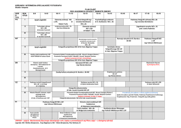 KIERUNEK I INTERMEDIA-SPECJALNOŚĆ FOTOGRAFIA Studia I stopnia DZIE Ń TYG. PO WT ROK STUD . I 8-9 9-10 Język angielski II Technologie cyfrowe MZ s. 208 drJarosław Czarnecki III Technologie cyfrowe MZ s. 208 dr Jarosław Czarnecki 10-11 PLAN ZAJĘĆ ROK AKADEMICKI 2016/2017, SEMESTR ZIMOWY 11-12 12-13 13-14 14-15 Elementy animacji MZ s.14f, dr Robert Turło Instytucje kultury MZ s. 2b mgr Anna Włodarska Historia fotografii mgr Psychofizjologia widzenia Jarosław Bartołowicz dr A. Burkiewicz MZ s. 2b MZ s.2b Elementy animacji WZ s.120 dr Robert Turło I Język angielski III Analiza sztuki współczesnej WZ AUDYTORIUM dr Łukasz Guzek I Historia sztuki i kultury starożytnej – WZ Audytorium dr Ł.Guzek, /średniowiecznej - dr R. Nieczyporowski Fotografia projektowa MZ 13f dr hab. Zbigniew Treppa 16-17 17-18 18-19 Podstawy fotografii cyfrowej MZ s.2b mgr Jarosław Bartołowicz Zagadnienia rysunku WZ s. 01 prof. Janina Rudnicka Narracja wizualna dr B. Burska s. 3b MZ Metodologia konstruowania projektów artystycznych dr Dorota Nieznalska MZ s. 3b II 15-16 Podstawy fotografii MZs.13f mgr Vahram Mkhitaryan Semiotyka obrazu fotograficznego MZ 13f dr hab. Zbigniew Treppa Pracownia Działań Transdyscyplinarnych MZ - 4b prof. Grzegorz Klaman / Pracownia Przestrzeni Audio i VideoMZ -1b prof. Wojciech Zamiara Studenci z pracowni dr hab. L.Krutulskiego Fotografia projektowa MZ 13f dr hab. Zbigniew Treppa ŚR II Wychowanie fizyczne wg dostępnej oferty Warsztat DTP MZ s.14f mgr Maciej Salamon Zasoby kultury wizualnej dr B. Burska s. 3b MZ Projektowanie graficzne MZ 14f mgr Maciej Salamon III CZ I Podstawy technik fotograficznych MZ s.12f (e-lerning) dr A. Babińska Podstawy rysunku WZ s. 04 dr Sylwia Jakubowska-Szycik II III PI Fotografia dokumentalna dr hab. Leszek Krutulski MZ 12f Historia filozofii z element. etyki i socjologii sztuki WZ Audytorium dr hab. A.Pawliszyn prof. ASP I Pracownia Działań Transdyscyplinarnych MZ - 4b prof. Grzegorz Klaman / Pracownia Przestrzeni Audio i VideoMZ -1b prof. Wojciech Zamiara Studenci z pracowni dr hab. Z. Treppy Fotografia dokumentalna MZ 12f dr hab. Leszek Krutulski Podstawy fotografii MZ-s.12f mgr Vahram Mkhitaryan II III Podstawy audio MZ s.208 dr Adam Witkowski Prawo autorskie - WZ Audytorium mgr Małgorzata Matyka Przedmioty do wyboru z oferty ogólnouczelnianej (jedna do wyboru spośród: Rzeźba, Podstawy Projektowania Graficznego, Projektowanie i Org. Przestrzeni, Fotografia wg siatki godzin) Historia sztuk medialnych WZ Audytorium dr Katarzyna Lewandowska Teoria mediów MZ s.3b Realizacja obrazu filmowego dr Małgorzata Jankowska mgr Vahram Mkhitaryan MZ-s.13f Nowe tendencje w sztuce współczesnej WZ Audytorium dr Katarzyna Lewandowska UWAGA – zajęcia Wychowania fizycznego obowiązują I rok ( zapisy u prowadzących wg Planu zajęć – z dostępnej oferty)) Legenda: WZ- Wielka Zbrojownia , Targ Węglowy 6, MZ – Mała Zbrojownia, Plac Wałowy 15