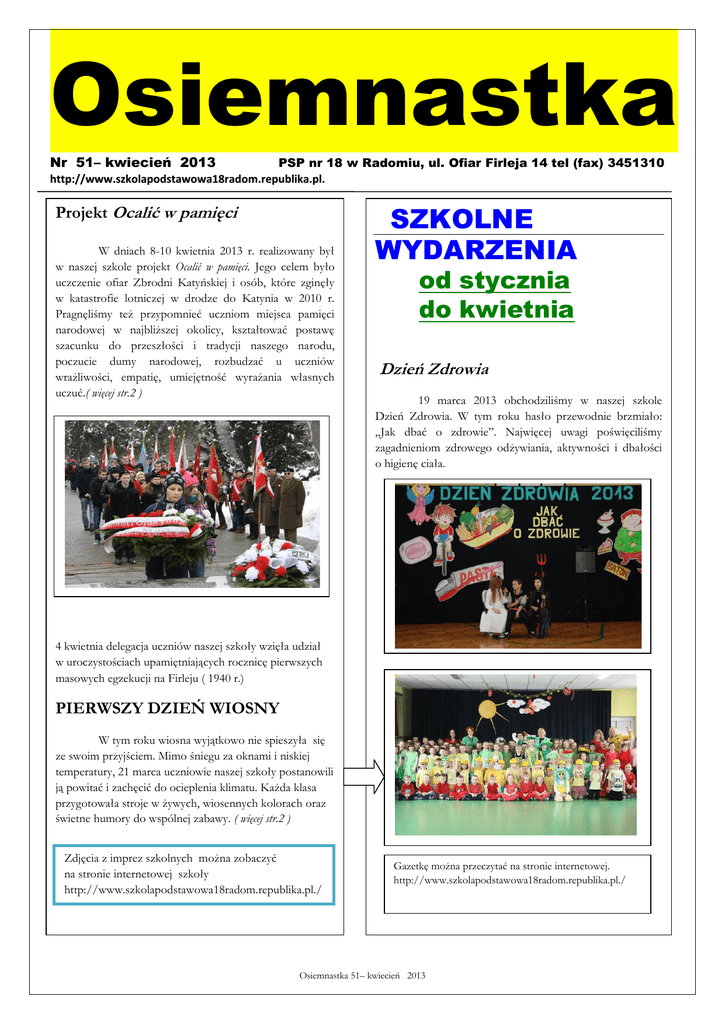 Osiemnastka Nr 51– kwiecień 2013 PSP nr 18 w Radomiu, ul. Ofiar Firleja 14 tel (fax) 3451310 http://www.szkolapodstawowa18radom.republika.pl. Projekt Ocalić w pamięci W dniach 8-10 kwietnia 2013 r. realizowany był w naszej szkole projekt Ocalić w pamięci. Jego celem było uczczenie ofiar Zbrodni Katyńskiej i osób, które zginęły w katastrofie lotniczej w drodze do Katynia w 2010 r. Pragnęliśmy też przypomnieć uczniom miejsca pamięci narodowej w najbliższej okolicy, kształtować postawę szacunku do przeszłości i tradycji naszego narodu, poczucie dumy narodowej, rozbudzać u uczniów wrażliwości, empatię, umiejętność wyrażania własnych uczuć.( więcej str.2 ) SZKOLNE WYDARZENIA od stycznia do kwietnia Dzień Zdrowia 19 marca 2013 obchodziliśmy w naszej szkole Dzień Zdrowia. W tym roku hasło przewodnie brzmiało: „Jak dbać o zdrowie”. Najwięcej uwagi poświęciliśmy zagadnieniom zdrowego odżywiania, aktywności i dbałości o higienę ciała. 4 kwietnia delegacja uczniów naszej szkoły wzięła udział w uroczystościach upamiętniających rocznicę pierwszych masowych egzekucji na Firleju ( 1940 r.) PIERWSZY DZIEŃ WIOSNY W tym roku wiosna wyjątkowo nie spieszyła się ze swoim przyjściem. Mimo śniegu za oknami i niskiej temperatury, 21 marca uczniowie naszej szkoły postanowili ją powitać i zachęcić do ocieplenia klimatu. Każda klasa przygotowała stroje w żywych, wiosennych kolorach oraz świetne humory do wspólnej zabawy. ( więcej str.2 ) Zdjęcia z imprez szkolnych można zobaczyć na stronie internetowej szkoły http://www.szkolapodstawowa18radom.republika.pl./ Gazetkę można przeczytać na stronie internetowej. http://www.szkolapodstawowa18radom.republika.pl./ Osiemnastka 51– kwiecień 2013 SZKOLNE WYDARZENIA od stycznia do kwietnia Projekt Ocalić w pamięci W dniach 8-10 kwietnia 2013 r. realizowany był w naszej szkole projekt Ocalić w pamięci. Jego celem było uczczenie ofiar Zbrodni Katyńskiej i osób, które zginęły w katastrofie lotniczej w drodze do Katynia w 2010 r. Pragnęliśmy też przypomnieć uczniom miejsca pamięci narodowej w najbliższej okolicy, kształtować postawę szacunku do przeszłości i tradycji naszego narodu, poczucie dumy narodowej, rozbudzać u uczniów wrażliwości, empatię, umiejętność wyrażania własnych uczuć. Pierwszym etapem realizacji projektu były zajęcia przeprowadzone we wszystkich klasach IV-VI. Na lekcjach wykorzystano prezentację multimedialną, mapy, materiały zawierające informacje o wydarzeniach sprzed 70 lat w Katyniu i o katastrofie pod Smoleńskiem, karty IPN. Zadanie domowe uczniów, związane ściśle z treścią zajęć, polega na wyrażeniu w formie plastycznej, jak dziś możemy pielęgnować pamięć o przeszłości. Prace zostaną ocenione w formie konkursu, który przebiega pod hasłem Pamięć o przeszłości to nasze zaangażowanie w przyszłość. Najlepsze prace zostaną zaprezentowane na szkolnej wystawie. 10 kwietnia odbył się uroczysty apel dla klas IV-VI. Po wspólnym odśpiewaniu hymnu w obecności pocztu sztandarowego głos zabrała Pani Dyrektor Iwona Dąbek. W swojej wypowiedzi Pani Dyrektor przypomniała wydarzenia, które miały miejsce ponad 70 lat temu w Katyniu i trzy lata temu pod Smoleńskiem. Szczególną uwagę zwróciła na obowiązek pamiętania o przeszłości i pielęgnowania jej. To zadanie spoczywa na każdym Polaku, również tym najmłodszym. Słowa te ściśle odpowiadały treści hasła będącego elementem dekoracji: Pamięć przeszłości siłą narodu. Na zakończenie spotkania minutą ciszy uczczono ofiary Katynia i ofiary katastrofy pod Smoleńskiem. Jolanta Grzywacz PIERWSZY DZIEŃ WIOSNY W tym roku wiosna wyjątkowo nie spieszyła się ze swoim przyjściem. Mimo śniegu za oknami i niskiej temperatury, 21 marca uczniowie naszej szkoły postanowili ją powitać i zachęcić do ocieplenia klimatu. Każda klasa przygotowała stroje w żywych, wiosennych kolorach oraz świetne humory do wspólnej zabawy. Przedstawiciele Samorządu Uczniowskiego wybrali najlepiej przebranych reprezentantów klas starszych, którzy wzięli udział w wyborach Miss i Mistera Wiosny 2013. Komisja, której przewodniczyła pani wicedyrektor Bożena Świgoń oceniała nie tylko wygląd ale również wiedzę uczestników. Najwięcej punktów otrzymali : Magdalena Ogrodniczek 3a, Paulina Nowicka 3a oraz Jakub Molendowski 5a i Dawid Kalita 6a. Na wyróżnienie zasługiwał również samodzielnie wykonany niebieski strój Katarzyny Pawlaczyk 5a.Obrady jury były bardzo burzliwe a w czasie ich trwania mieliśmy okazję poznać próbkę twórczości poetyckiej naszych uczniów. Ich zadaniem było utworzyć krótkie teksty na podstawie otrzymanych wiosennych słówek. Oto przykłady: W kwietniu wiosna, w grudniu zima, a na drzewach pąk się zgina. Klasa 5a Maj i marzec grają w rokowym barze. Klasa 5b i 4a Gdy bazie kwitną - przyroda rozkwita A gdy jest ciepło wiosna nas wita. Klasa 4b Gdy początek wiosny witamy to zew natury odczuwamy. Klasa 3a Zdjęcia finalistów zostały wysłane na konkurs i umieszczone na stronie www.polanglo. pl Zachęcamy wszystkich do głosowania na naszych uczniów w dniach 16 maja - 7 czerwca 2013 Ogłoszenie wyników: 10 czerwca 2013 na stronie www.polanglo.pl (Joanna Czarnecka) Zapobiegamy pożarom Uczeń klasy 1b Jan Sasin zajął V miejsce na szczeblu powiatowym w XXXVI edycji konkursu plastycznego "Zapobiegamy Pożarom" organizowanego przez Polski Związek Ochotniczych Straży Pożarnych. Wszystkich uczniów zachęcamy do wzięcia udziału w kolejnej edycji w marcu 2014. ZBIÓRKA SUROWCÓW WTÓRNYCH W NASZEJ SZKOLE W bieżącym roku szkolnym nasza szkoła bierze aktywny udział w konkursie organizowanym przez firmę RADKOM pod hasłem „Szkoła Przyjazna Środowisku”. Jednym z zadań konkursowych jest zbiórka surowców wtórnych do specjalnych pojemników, które umieszczone są przy wejściu do szkoły i ozn
