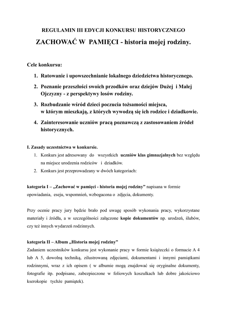 REGULAMIN III EDYCJI KONKURSU HISTORYCZNEGO ZACHOWAĆ W PAMIĘCI - historia mojej rodziny. Cele konkursu: 1. Ratowanie i upowszechnianie lokalnego dziedzictwa historycznego. 2. Poznanie przeszłości swoich przodków oraz dziejów Dużej i Małej Ojczyzny - z perspektywy losów rodziny. 3. Rozbudzanie wśród dzieci poczucia tożsamości miejsca, w którym mieszkają, z których wywodzą się ich rodzice i dziadkowie. 4. Zainteresowanie uczniów pracą poznawczą z zastosowaniem źródeł historycznych. I. Zasady uczestnictwa w konkursie. 1. Konkurs jest adresowany do wszystkich uczniów klas gimnazjalnych bez względu na miejsce urodzenia rodziców i dziadków. 2. Konkurs jest przeprowadzany w dwóch kategoriach: kategoria I – „Zachować w pamięci - historia mojej rodziny” napisana w formie opowiadania, eseju, wspomnień, wzbogacona o zdjęcia, dokumenty. Przy ocenie pracy jury będzie brało pod uwagę sposób wykonania pracy, wykorzystane materiały i źródła, a w szczególności załączone kopie dokumentów np. urodzeń, ślubów, czy też innych wydarzeń rodzinnych. kategoria II – Album „Historia mojej rodziny” Zadaniem uczestników konkursu jest wykonanie pracy w formie książeczki o formacie A 4 lub A 5, dowolną techniką, zilustrowaną zdjęciami, dokumentami i innymi pamiątkami rodzinnymi, wraz z ich opisem ( w albumie mogą znajdować się oryginalne dokumenty, fotografie itp. podpisane, zabezpieczone w foliowych koszulkach lub dobre jakościowo kserokopie tychże pamiątek). 3. Technika pracy może być dowolna, dopuszczamy możliwość wykonania jej na komputerze. Zachęcamy do prezentacji swojej historii podczas wystąpienia w spotkaniu finałowym (krótka relacja o bohaterach pracy, sposobie poszukiwania źródeł, itp.). W prezentacji może uczestniczyć bohater opowiadania (np. dziadek, babcia) lub można ją przygotować w formie multimedialnej. Do każdej pracy należy dołączyć kartę z informacjami o autorze, źródłach informacji i nauczycielu - opiekunie. II. Nagrody. Nagrody przyznawane są w dwóch kategoriach: „Zachować w pamięci - historia mojej rodziny” i Album „Historia mojej rodziny”. Autorzy wszystkich prac otrzymają dyplomy, a twórcy najlepszych prac otrzymają nagrody rzeczowe. Przewidujemy również nagrody specjalne dla autorów prezentacji w dniu finału. III. Terminarz.  Do 30.05.2014r. należy dostarczyć prace konkursowe do nauczyciela - opiekuna, celem późniejszego przekazania ich do organizatora.  Uroczyste podsumowanie, z udziałem uczniów, rodziców i zaproszonych gości odbędzie się w jednym z Zespołów Szkół biorących udział w konkursie. Dokumenty oraz fotografie zebrane w ramach konkursu zostaną zamieszczone w Cyfrowym Archiwum Tradycji Lokalnej przy Gminnej Bibliotece Publicznej w Jaśle z/s w Szebniach oraz na stronie CATL: szebnie.archiwa.org Przez wypełnienie karty konkursowej uczestnik potwierdza, że zapoznał się z regulaminem i zgadza się na publikowanie dokumentów oraz fotografii zawartych w swojej pracy w celach edukacyjnych i promocyjnych przez Gminną Bibliotekę Publiczną w Jaśle z/s w Szebniach KARTA KONKURSOWA Imię i nazwisko uczestnika...................................... …................................................................................ telefon kontaktowy …............................................... klasa …................................................................... nazwa szkoły …..................................................... …................................................................................ Imię i nazwisko nauczyciela - opiekuna ….................................................................