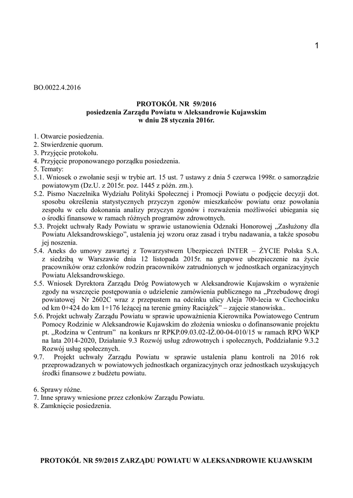 1 BO.0022.4.2016 PROTOKÓŁ NR 59/2016 posiedzenia Zarządu Powiatu w Aleksandrowie Kujawskim w dniu 28 stycznia 2016r. 1. Otwarcie posiedzenia. 2. Stwierdzenie quorum. 3. Przyjęcie protokołu. 4. Przyjęcie proponowanego porządku posiedzenia. 5. Tematy: 5.1. Wniosek o zwołanie sesji w trybie art. 15 ust. 7 ustawy z dnia 5 czerwca 1998r. o samorządzie powiatowym (Dz.U. z 2015r. poz. 1445 z późn. zm.). 5.2. Pismo Naczelnika Wydziału Polityki Społecznej i Promocji Powiatu o podjęcie decyzji dot. sposobu określenia statystycznych przyczyn zgonów mieszkańców powiatu oraz powołania zespołu w celu dokonania analizy przyczyn zgonów i rozważenia możliwości ubiegania się o środki finansowe w ramach różnych programów zdrowotnych. 5.3. Projekt uchwały Rady Powiatu w sprawie ustanowienia Odznaki Honorowej „Zasłużony dla Powiatu Aleksandrowskiego”, ustalenia jej wzoru oraz zasad i trybu nadawania, a także sposobu jej noszenia. 5.4. Aneks do umowy zawartej z Towarzystwem Ubezpieczeń INTER – ŻYCIE Polska S.A. z siedzibą w Warszawie dnia 12 listopada 2015r. na grupowe ubezpieczenie na życie pracowników oraz członków rodzin pracowników zatrudnionych w jednostkach organizacyjnych Powiatu Aleksandrowskiego. 5.5. Wniosek Dyrektora Zarządu Dróg Powiatowych w Aleksandrowie Kujawskim o wyrażenie zgody na wszczęcie postępowania o udzielenie zamówienia publicznego na „Przebudowę drogi powiatowej Nr 2602C wraz z przepustem na odcinku ulicy Aleja 700-lecia w Ciechocinku od km 0+424 do km 1+176 leżącej na terenie gminy Raciążek” – zajęcie stanowiska.. 5.6. Projekt uchwały Zarządu Powiatu w sprawie upoważnienia Kierownika Powiatowego Centrum Pomocy Rodzinie w Aleksandrowie Kujawskim do złożenia wniosku o dofinansowanie projektu pt. „Rodzina w Centrum” na konkurs nr RPKP.09.03.02-IŻ.00-04-010/15 w ramach RPO WKP na lata 2014-2020, Działanie 9.3 Rozwój usług zdrowotnych i społecznych, Poddziałanie 9.3.2 Rozwój usług społecznych. 9.7. Projekt uchwały Zarządu Powiatu w sprawie ustalenia planu kontroli na 2016 rok przeprowadzanych w powiatowych jednostkach organizacyjnych oraz jednostkach uzyskujących środki finansowe z budżetu powiatu. 6. Sprawy różne. 7. Inne sprawy wniesione przez członków Zarządu Powiatu. 8. Zamknięcie posiedzenia. PROTOKÓŁ NR 59/2015 ZARZĄDU POWIATU W ALEKSANDROWIE KUJAWSKIM 2 Ad. 1. Pan Dariusz Wochna Starosta Aleksandrowski – otwieram posiedzenie Zarządu Powiatu w Aleksandrowie Kujawskim. Witam członków Zarządu Powiatu, Członka Zarządu Powiatu pana Lotfi Mansoura, Skarbnika Powiatu panią Dorotę Sobierajską i Sekretarza Powiatu pana Piotra Marciniaka. Posiedzenie Zarządu Powiatu zostało otwarte o godzinie 10:00. Ad. 2. Pan Dariusz Wochna – stwierdzam quorum. W posiedzeniu nie uczestniczy Wicestarosta pan Wojciech Marjański. Posiedzenie jest prawomocne i Zarząd może podejmować uchwały. Lista obecności stanowi załącznik do protokołu. Ad 3. Pan Dariusz Wochna – Pan Dariusz Wochna – proponuję przyjąć bez czytania protokół nr 58/2016 posiedzenia Zarządu Powiatu z dnia 20 stycznia 2016r. Czy są uwagi, propozycje zmian, czy uzupełnień do przedłożonego protokołu nr 58/2016 posiedzenia Zarządu Powiatu w dniu 20 stycznia 2016r.? Nie widzę. Proponuję przyjąć go bez czytania. Przebieg głosowania: Za – 2, Przeciw – nie było, Wstrzymujących się – nie było. Jednogłośnie. Członkowie Zarządu Powiatu, w wyniku głosowania przyjęli protokół nr 58/2016 posiedzenia Zarządu Powiatu z dnia 20 stycznia 2016r. Ad 4. Pan Dariusz Wochna – przechodzimy do proponowanego porządku dzisiejszego posiedzenia. Proponuję rozszerzyć porządek o punkty: 5.4. Aneks do umowy zawartej z Towarzystwem Ubezpieczeń INTER – ŻYCIE Polska S.A. z siedzibą w Warszawie dnia 12 listopada 2015r. na grupowe ubezpieczenie na życie pracowników oraz członków rodzin pracowników zatrudnionych w jednostkach organizacyjnych Powiatu Aleksandrowskiego. 5.5. Wniosek Dyrektora Zarządu Dróg Powiatowych w Aleksandrowie Kujawskim o wyrażenie zgody na wszczęcie postępowania o udzielenie zamówienia publicznego na „Przebudowę drogi powiatowej Nr 2602C wraz z przepustem na odcinku ulicy Aleja 700-lecia w Ciechocinku od km 0+424 do km 1+176 leżącej na terenie gminy Raciążek” – zajęcie stanowiska.. 5.6. Projekt uchwały Zarządu Powiatu w sprawie upoważnienia Kierownika Powiatowego Centrum Pomocy Rodzinie w Aleksandrowie Kujawskim do złożenia wniosku o dofinansowanie projektu pt. „Rodzina w Centrum” na konkurs nr RPKP.09.03.02-IŻ.00-04-010/15 w ramach RPO WKP na lata 2014-2020, Działanie 9.3 Rozwój usług zdrowotnych i społecznych, Poddziałanie 9.3.2 Rozwój usług społecznych. PROTOKÓŁ NR 59/2015 ZARZĄDU POWIATU W ALEKSANDROWIE KUJAWSKIM 3 9.7. Projekt uchwały Zarządu Powiatu w sprawie ustalenia planu kontroli na 2016 rok przeprowadzanych w powiatowych jednostkach organizacyjnych oraz jednostkach uzyskujących środki finansowe z budżetu powiatu. Kto jest za? Dziękuję. Przebieg głosowania: Za – 2, Przeciw – nie było, Wstrzymujących się – nie było. Jednogłośnie. Pan Dariusz Wochna – czy są inne wnioski o zmianę porządku posiedzenia? Nie widzę. Kto jest za przyjęciem porządku posiedzenia? Dziękuję. Przebieg głosowania: Za – 2, Przeciw – nie było, Wstrzymujących się – nie było. Jednogłośnie. Porządek posiedzenia Zarządu Powiatu, stanowi załącznik do protokołu. Ad 5.1. Wniosek o zwołanie sesji w trybie art. 15 ust. 7 ustawy z dnia 5 czerwca 1998r. o samorządzie powiatowym (Dz.U. z 2015r. poz. 1445 z późn. zm.). Pan Dariusz Wochna – przechodzimy do punktu 5.1. Wniosek o zwołanie sesji w trybie art. 15 ust. 7 ustawy z dnia 5 czerwca 1998r. o samorządzie powiatowym (Dz.U. z 2015r. poz. 1445 z późn. zm.). W związku z ogłoszonym przez Ministerstwo Infrastruktury i Rozwoju naborem wniosków o dofinansowanie w 2016 roku dr