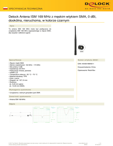 Delock Antena ISM 169 MHz z męskim wtykiem SMA, 0 dBi, dookólna, nieruchoma, w kolorze czarnym Opis Ta antena ISM 169 MHz może być podłączana do urządzenia ISM 169 MHz wyposażonego w złącze SMA, aby wysyłać i odbierać sygnał. Specyfikacja • Złącze: męski SMA • Zakres częstoliwości: 164 MHz - 174 MHz • Siła anteny: 0 dBi • Impedancja: 50 Ohm • Polaryzacja: liniowa, pionowa • VSWR: 2,5 • Temperatura robocza: -30 °C ~ 70 °C • Materiał obudowy: TPR • Kolor: czarny • Długość: ok. 197,10 mm • Średnica: ok. 5,00 mm (góra) ok. 13,00 mm (SMA) Numer artykułu 89461 EAN: 4043619894611 Kraj pochodzenia: China Opakowanie: Retail Box Wymagania systemowe • Urządzenie z wolnym gniazdem jack SMA Zawartość opakowania • Antena ISM 169 MHz Zdjęcia © 2017 by Delock. Wszelkie pojawiające się tutaj nazwy i znaki należą do ich odpowiednich właścicieli. Błędy drukarskie, zmiany & pomyłki zastrzeżone. www.delock.com 89461 1/2 07.03.2017 Interface złącze : męski SMA Technical characteristics Frequency range: 164 - 174 MHz Gain: 0 dBi Impedancja: 50 Ω Temperatura robocza: -30 °C ~ 70 °C Polarisation: linear vertical VSWR: 2.5 Physical characteristics Housing material: TPR Length: 18.9 cm Diameter connector: 13 mm Kolor: czarny © 2017 by Delock. Wszelkie pojawiające się tutaj nazwy i znaki należą do ich odpowiednich właścicieli. Błędy drukarskie, zmiany & pomyłki zastrzeżone. Powered by TCPDF (www.tcpdf.org) www.delock.com 89461 2/2 07.03.2017