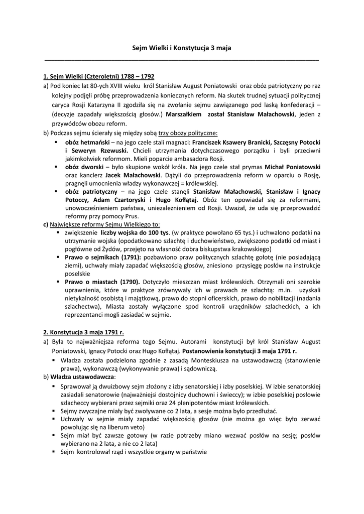 Sejm Wielki i Konstytucja 3 maja __________________________________________________________________________________ 1. Sejm Wielki (Czteroletni) 1788 – 1792 a) Pod koniec lat 80-ych XVIII wieku król Stanisław August Poniatowski oraz obóz patriotyczny po raz kolejny podjęli próbę przeprowadzenia koniecznych reform. Na skutek trudnej sytuacji politycznej caryca Rosji Katarzyna II zgodziła się na zwołanie sejmu zawiązanego pod laską konfederacji – (decyzje zapadały większością głosów.) Marszałkiem został Stanisław Małachowski, jeden z przywódców obozu reform. b) Podczas sejmu ścierały się między sobą trzy obozy polityczne: obóz hetmaoski – na jego czele stali magnaci: Franciszek Ksawery Branicki, Szczęsny Potocki i Seweryn Rzewuski. Chcieli utrzymania dotychczasowego porządku i byli przeciwni jakimkolwiek reformom. Mieli poparcie ambasadora Rosji. obóz dworski – było skupione wokół króla. Na jego czele stał prymas Michał Poniatowski oraz kanclerz Jacek Małachowski. Dążyli do przeprowadzenia reform w oparciu o Rosję, pragnęli umocnienia władzy wykonawczej = królewskiej. obóz patriotyczny – na jego czele stanęli Stanisław Małachowski, Stanisław i Ignacy Potoccy, Adam Czartoryski i Hugo Kołłątaj. Obóz ten opowiadał się za reformami, unowocześnieniem paostwa, uniezależnieniem od Rosji. Uważał, że uda się przeprowadzid reformy przy pomocy Prus. c) Największe reformy Sejmu Wielkiego to: zwiększenie liczby wojska do 100 tys. (w praktyce powołano 65 tys.) i uchwalono podatki na utrzymanie wojska (opodatkowano szlachtę i duchowieostwo, zwiększono podatki od miast i pogłówne od Żydów, przejęto na własnośd dobra biskupstwa krakowskiego) Prawo o sejmikach (1791): pozbawiono praw politycznych szlachtę gołotę (nie posiadającą ziemi), uchwały miały zapadad większością głosów, zniesiono przysięgę posłów na instrukcje poselskie Prawo o miastach (1790). Dotyczyło mieszczan miast królewskich. Otrzymali oni szerokie uprawnienia, które w praktyce zrównywały ich w prawach ze szlachtą: m.in. uzyskali nietykalnośd osobistą i majątkową, prawo do stopni oficerskich, prawo do nobilitacji (nadania szlachectwa), Miasta zostały wyłączone spod kontroli urzędników szlacheckich, a ich reprezentanci mogli zasiadad w sejmie. 2. Konstytucja 3 maja 1791 r. a) Była to najważniejsza reforma tego Sejmu. Autorami konstytucji był król Stanisław August Poniatowski, Ignacy Potocki oraz Hugo Kołłątaj. Postanowienia konstytucji 3 maja 1791 r. Władza została podzielona zgodnie z zasadą Monteskiusza na ustawodawczą (stanowienie prawa), wykonawczą (wykonywanie prawa) i sądowniczą. b) Władza ustawodawcza: Sprawował ją dwuizbowy sejm złożony z izby senatorskiej i izby poselskiej. W izbie senatorskiej zasiadali senatorowie (najważniejsi dostojnicy duchowni i świeccy); w izbie poselskiej posłowie szlacheccy wybierani przez sejmiki oraz 24 plenipotentów miast królewskich. Sejmy zwyczajne miały byd zwoływane co 2 lata, a sesje można było przedłużad. Uchwały w sejmie miały zapadad większością głosów (nie można go więc było zerwad powołując się na liberum veto) Sejm miał byd zawsze gotowy (w razie potrzeby miano wezwad posłów na sesję; posłów wybierano na 2 lata, a nie co 2 lata) Sejm kontrolował rząd i wszystkie organy w paostwie Pozbawiono praw politycznych szlachtę gołotę (klienci magnaccy nie mieli już wpływu na obrady sejmu). Prawa polityczne zachowała tylko szlachta posiadająca majątek ziemski – tzw. posesjonaci Zniesiono: liberum veto, rokosz, konfederację, przysięgę posłów na instrukcje poselskie – od tej pory posłowie byli przedstawicielami całego narodu. Co 25 lata miał byd zwoływany sejm dla poprawy konstytucji c) Władza wykonawcza: Miał ją sprawowad król wraz ze Strażą Praw. Straż Praw to rada ministrów powoływana przez króla lecz pod kontrolą sejmu. Była ona odpowiedzialna przed sejmem. Uprawnienia króla: miał zwoływad sejm, posiadał prawo inicjatywy ustawodawczej, w jego imieniu miały byd ogłaszane ustawy. Był naczelnym dowódcą wojska w czasie wojny, obsadzał wszystkie urzędy. Zniesiono wolną elekcję i wprowadzono dziedziczenie tronu w rodzie elektora saskiego Fryderyka Augusta. W razie wymarcia tej dynastii szlachta miała wybrad nową. Wprowadzono nowy organ administracji – Komisję Policji, która miała sprawowad nadzór głównie nad miastami. d) Władza sądownicza: Pozostała ta sama – najwyższym organem sądowym był Trybunał Koronny i Litewski. Utworzono sądy magistrackie dla miast oraz sądy apelacyjne wydziałowe. e) Inne postanowienia: Religia katolicka została uznana za religię panującą w Rzeczypospolitej przy jednoczesnym zachowaniu tolerancji religijnej i wolności wyznania Wprowadzono po raz pierwszy pojęcie narodu – obywatele mieli byd obroocami swobód narodowych i praw