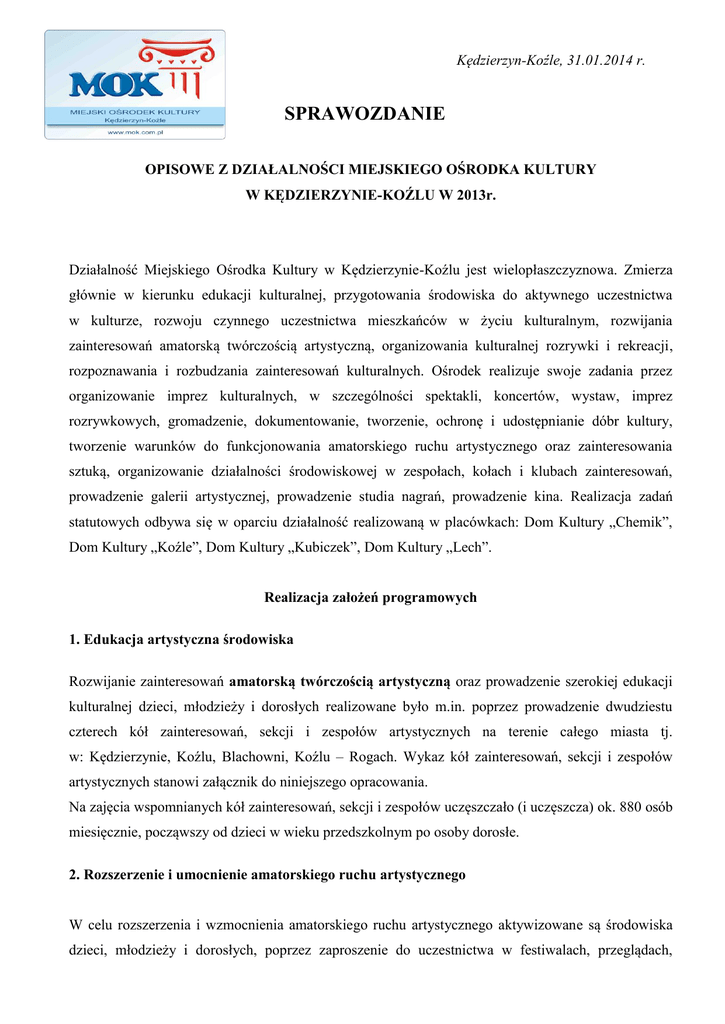 Kędzierzyn-Koźle, 31.01.2014 r. SPRAWOZDANIE OPISOWE Z DZIAŁALNOŚCI MIEJSKIEGO OŚRODKA KULTURY W KĘDZIERZYNIE-KOŹLU W 2013r. Działalność Miejskiego Ośrodka Kultury w Kędzierzynie-Koźlu jest wielopłaszczyznowa. Zmierza głównie w kierunku edukacji kulturalnej, przygotowania środowiska do aktywnego uczestnictwa w kulturze, rozwoju czynnego uczestnictwa mieszkańców w życiu kulturalnym, rozwijania zainteresowań amatorską twórczością artystyczną, organizowania kulturalnej rozrywki i rekreacji, rozpoznawania i rozbudzania zainteresowań kulturalnych. Ośrodek realizuje swoje zadania przez organizowanie imprez kulturalnych, w szczególności spektakli, koncertów, wystaw, imprez rozrywkowych, gromadzenie, dokumentowanie, tworzenie, ochronę i udostępnianie dóbr kultury, tworzenie warunków do funkcjonowania amatorskiego ruchu artystycznego oraz zainteresowania sztuką, organizowanie działalności środowiskowej w zespołach, kołach i klubach zainteresowań, prowadzenie galerii artystycznej, prowadzenie studia nagrań, prowadzenie kina. Realizacja zadań statutowych odbywa się w oparciu działalność realizowaną w placówkach: Dom Kultury „Chemik”, Dom Kultury „Koźle”, Dom Kultury „Kubiczek”, Dom Kultury „Lech”. Realizacja założeń programowych 1. Edukacja artystyczna środowiska Rozwijanie zainteresowań amatorską twórczością artystyczną oraz prowadzenie szerokiej edukacji kulturalnej dzieci, młodzieży i dorosłych realizowane było m.in. poprzez prowadzenie dwudziestu czterech kół zainteresowań, sekcji i zespołów artystycznych na terenie całego miasta tj. w: Kędzierzynie, Koźlu, Blachowni, Koźlu – Rogach. Wykaz kół zainteresowań, sekcji i zespołów artystycznych stanowi załącznik do niniejszego opracowania. Na zajęcia wspomnianych kół zainteresowań, sekcji i zespołów uczęszczało (i uczęszcza) ok. 880 osób miesięcznie, począwszy od dzieci w wieku przedszkolnym po osoby dorosłe. 2. Rozszerzenie i umocnienie amatorskiego ruchu artystycznego W celu rozszerzenia i wzmocnienia amatorskiego ruchu artystycznego aktywizowane są środowiska dzieci, młodzieży i dorosłych, poprzez zaproszenie do uczestnictwa w festiwalach, przeglądach, konkursach, spotkaniach artystycznych oraz innych formach. Do najbardziej rozpoznawanych, cyklicznych wydarzeń artystycznych, współorganizowanych m.in. z placówkami oświatowymi, organizacjami pozarządowymi i innymi należą: konkurs teatralny „Teatromania Przedszkolaka”, Przegląd Teatrów Szkół Podstawowych „Debiut”, Festiwal Piosenki Harcerskiej „Muzyczne Spotkanie”, Biesiady Kozielskie – „Lekcje śpiewania”, warsztaty artystyczne: biżuterii (11), ozdób świątecznych i inne, Stay Fresh – festiwal kultury hip-hopowej, Konkurs piosenki artystycznej podczas Ogólnopolskiego Przeglądu Poezji Śpiewanej, Piosenki Turystycznej i Sztuk Różnych „Wrzosowisko”, Konkurs filmów nieprofesjonalnych podczas Międzynarodowego Festiwalu Filmów Niezależnych im. Ireneusza Radzia „Publicystyka”, Turniej Kultury Gimnazjów, wernisaże i wystawy prac artystów z terenu naszego miasta, kraju i za granicy, prezentowane w dwóch galeriach: „Galerii Sztuk Wszelakich” w Domu Kultury „Chemik” oraz w „Galerii na Strychu" w Domu Kultury „Koźle”. Miejsca te są ważnym elementem procesu twórczego oraz pozwalają na prezentowanie prac w odpowiedniej oprawie szerokiemu gronu odbiorców z Kędzierzyna – Koźla i regionu. W roku 2013 zorganizowano łącznie 19 wernisaży wystaw artystycznych, podczas których oprawą artystyczną zajęli się młodzi wokaliści ze Studia Piosenki działającego przy MOK. Uczestnictwo w kołach artystycznych oraz przeglądach organizowanych w naszym mieście jest ważnym elementem procesu wychowawczego, przygotowuje dzieci, młodzież i dorosłych do aktywnego uczestnictwa w życiu kulturalnym, będącym alternatywnym sposobem spędzania czasu wolnego. Przeglądy organizowane w naszych placówkach umożliwiają dzieciom, młodzieży i dorosłym dostrzeżenie ich talentów oraz prezentację umiejętności, jak również udzielenie wsparcia edukacyjnego w postaci zaproszenia do uczestnictwa w kołach zainteresowań i sekcjach. W wielu przypadkach młodzi twórcy mają okazję nawiązania współpracy z MOK przy organizacji wydarzeń kulturalnych, prezentując własny dorobek artystyczny na miejskiej scenie muzycznej (np. zespoły taneczne, wokalne i inne). Wokaliści „Studia Piosenki” często znajdują się w czołówce młodych wokalistów w Polsce, zdobywając główne nagrody i wyróżnienia podczas ogólnopolskich festiwali i przeglądów artystycznych. W bieżącym roku wiele nagród zdobyło koło teatralne „Nienażarty” prowadzone przez Waldemara Lankaufa, chór „Echo Kresów” prowadzony przez Adama Wołkowskiego, chór „Cantabile” prowadzony przez Jolantę Stefaniak. Ciekawym wydarzeniem był spektakl tanecznowokalny pt. „Grease”, będący wspomnieniem znanego z lat 70-tych filmu muzycznego pod tym samym tytułem. Spektakl, przygotowany na płaszczyźnie współpracy kilku sekcji artystycznych MOK: Studia Piosenki, Teatru Tańca RoArte oraz Zespołu Tanecznego SPIN, przygotowany przez instruktorki MOK, zaangażował blisko 50-osobową grupę młodych artystów. Wyróżniony został tytułem „Opolskie Szmaragdy”, podczas organizowanego przez Marszałka Województwa Opolskiego I Wojewódzkiego Przeglądu Twórczości Artystycznej w Opolu. Niezaprzeczalnym sukcesem było zdobycie międzynarodowej mistrzowskiej klasy S w tańcu towarzyskim przez Michała Pawlaczyka i Adę Słotwińską trenujących pod okiem Marka Trzemżalskiego w Klubie Tańca Towarzyskiego „Fiesta” działającego przy MOK. 3. Realizacja projektów edukacyjnych i społecznych W 2013 roku zrealizowaliśmy składający się z dwóch etapów projekt Narodowego Centrum Kultury, w ramach programu Dom Kultury+. Inicjatywy Lokaln