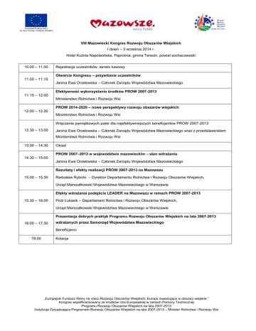 VIII Mazowiecki Kongres Rozwoju Obszarów Wiejskich I dzień – 3 września 2014 r. Hotel Kuźnia Napoleońska, Paprotnia, gmina Teresin, powiat sochaczewski 10.00 – 11.00 11.00 – 11.15 11.15 – 12.00 Rejestracja uczestników, serwis kawowy Otwarcie Kongresu – przywitanie uczestników Janina Ewa Orzełowska – Członek Zarządu Województwa Mazowieckiego Efektywność wykorzystania środków PROW 2007-2013 Ministerstwo Rolnictwa i Rozwoju Wsi 12.00 – 12.30 PROW 2014-2020 – nowe perspektywy rozwoju obszarów wiejskich Ministerstwo Rolnictwa i Rozwoju Wsi Wręczenie pamiątkowych pater dla najefektywniejszych beneficjentów PROW 2007-2013 12.30 – 13.00 Janina Ewa Orzełowska – Członek Zarządu Województwa Mazowieckiego wraz z przedstawicielem Ministerstwa Rolnictwa i Rozwoju Wsi 13.00 – 14.30 14.30 – 15.00 Obiad PROW 2007–2013 w województwie mazowieckim – stan wdrażania Janina Ewa Orzełowska – Członek Zarządu Województwa Mazowieckiego Rezultaty i efekty realizacji PROW 2007-2013 na Mazowszu 15.00 – 15.30 Radosław Rybicki – Dyrektor Departamentu Rolnictwa i Rozwoju Obszarów Wiejskich, Urząd Marszałkowski Województwa Mazowieckiego w Warszawie Efekty wdrażania podejścia LEADER na Mazowszu w ramach PROW 2007-2013 15.30 – 16.00 Piotr Łukasik – Departament Rolnictwa i Rozwoju Obszarów Wiejskich, Urząd Marszałkowski Województwa Mazowieckiego w Warszawie Prezentacja dobrych praktyk Programu Rozwoju Obszarów Wiejskich na lata 2007-2013 16.00 – 17.30 wdrażanych przez Samorząd Województwa Mazowieckiego Beneficjenci 19.00 Kolacja „Europejski Fundusz Rolny na rzecz Rozwoju Obszarów Wiejskich: Europa inwestująca w obszary wiejskie.” Kongres współfinansowany ze środków Unii Europejskiej w ramach Pomocy Technicznej Programu Rozwoju Obszarów Wiejskich na lata 2007-2013 Instytucja Zarządzająca Programem Rozwoju Obszarów Wiejskich na lata 2007-2013 – Minister Rolnictwa i Rozwoju Wsi VIII Mazowiecki Kongres Rozwoju Obszarów Wiejskich II dzień – 4 września 2014 r. Hotel Kuźnia Napoleońska, Paprotnia, gmina Teresin, powiat sochaczewski Krajowa Sieć Obszarów Wiejskich na Mazowszu – podsumowanie działań 10.00 – 10.30 Piotr Marzec – Departament Rolnictwa i Rozwoju Obszarów Wiejskich, Urząd Marszałkowski Województwa Mazowieckiego w Warszawie 10.30 – 11.00 Aktywizacja młodzieży wiejskiej szansą rozwoju Adam Prewęcki – Wiceprezes Zarządu Związku Młodzieży Wiejskiej Wykorzystanie przez LGD nowoczesnych narzędzi informatycznych na rzecz rozwoju 11.00 – 11.30 społeczności wiejskich Cezary Adam Nowek – Prezes Lokalnej Grupy Działania "Razem dla Radomki" 11.30 – 12.00 12.00 – 12.30 Wpływ PROW 2007-2013 na rozwój obszarów wiejskich na Mazowszu Adam Struzik – Marszałek Województwa Mazowieckiego Wizyty studyjne szansą wymiany dobrych praktyk i nawiązywanie współpracy Beneficjenci 12.30 – 13.00 13.00 – 13.15 13.15 – 14.30 Wnioski i dyskusja Zamknięcie Kongresu Adam Struzik – Marszałek Województwa Mazowieckiego Obiad „Europejski Fundusz Rolny na rzecz Rozwoju Obszarów Wiejskich: Europa inwestująca w obszary wiejskie.” Kongres współfinansowany ze środków Unii Europejskiej w ramach Pomocy Technicznej Programu Rozwoju Obszarów Wiejskich na lata 2007-2013 Instytucja Zarządzająca Programem Rozwoju Obszarów Wiejskich na lata 2007-2013 – Minister Rolnictwa i Rozwoju Wsi