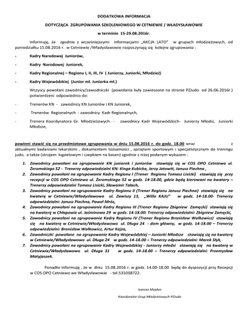 DODATKOWA INFORMACJA DOTYCZĄCA ZGRUPOWANIA SZKOLENIOWEGO W CETNIEWIE / WŁADYSŁAWOWIE w terminie 15-29.08.2016r. Informuję, że zgodnie z wcześniejszymi informacjami „AKCJA LATO” w grupach młodzieżowych, od poniedziałku 15.08.2016 r. w Cetniewie /Władysławowie rozpoczynają się kolejne zgrupowania : - Kadry Narodowej Juniorów, - Kadry Narodowej Juniorek, - Kadry Regionalnej – Regionu I, II, III, IV ( Juniorzy, Juniorki, Młodzież) - Kadry Wojewódzkiej (Junior mł. Juniorka mł.) Wszyscy powołani zawodnicy/zawodniczki (powołania były zawieszone na stronie PZJudo od 26.06.2016r.) potwierdzeni odpowiednio do: - Trenerów KN - zawodnicy KN Juniorów i KN Juniorek, - Trenerów Regionalnych - zawodnicy Kadr Regionalnych, - Trenera Koordynatora Gr. Młodzieżowych Młodsze, zawodnicy Kadr Wojewódzkich- Juniorzy Młodsi, Juniorki powinni stawić się na przedmiotowe zgrupowania w dniu 15.08.2016 r. do godz. 18.00 wraz z aktualnymi badaniami lekarskimi , dokumentem tożsamości , sprzętem sportowym i specjalistycznym do treningu judo, a także (strojem kąpielowym i czepkiem na basen) zgodnie z niżej podanym wykazem : 1. Zawodnicy powołani na zgrupowanie KN juniorek i juniorów stawiają się w COS OPO Cetniewo ul. Żeromskiego 52 - Trenerzy odpowiedzialni KN: Kinga Kubicka, Jerzy Jatowtt, Janusz Piechna , 2. Zawodnicy powołani na zgrupowanie Kadry Regionu I (Trener Regionu Tomasz Lisicki) stawiają się przy recepcji w COS OPO Cetniewo ul. Żeromskiego 52 w godz. 14-18.00, gdzie będą kierowani na kwatery – Trenerzy odpowiedzialni Tomasz Lisicki, Sławomir Tałach, 3. Zawodnicy powołani na zgrupowanie Kadry Regionu II (Trener Regionu Janusz Piechna) stawiają się na kwaterę w Cetniewie/Władysławowo ul. Zawiszy 13, „Willa KAJU” w godz. 14-18.00- Trenerzy odpowiedzialni: Janusz Piechna, Paweł Mróz, 4. Zawodnicy powołani na zgrupowanie Kadry Regionu III (Trener Regionu Zbigniew Zamęcki) stawiają się na kwaterę w Chłapowie ul. Jaśminowa 29 w godz. 14-18.00: Trenerzy odpowiedzialni: Zbigniew Zamęcki, 5. Zawodnicy powołani na zgrupowanie Kadry Regionu IV (Trener Regionu Bronisław Wołkowicz) stawiają się na kwaterę w Cetniewie/Władysławowo ul. Długa 24 - dom główny, w godz. 14-18.00 – Trenerzy odpowiedzialni: Bronisław Wołkowicz, Artur Kejza, 6. Zawodniczki powołane na zgrupowanie Kadry Wojewódzkiej – Juniorki Młodsze stawiają się na kwaterę w Cetniewie/Władysławowo ul. Długa 24 w godz. 14-18.00 – Trenerzy odpowiedzialni: Marek Słyk, 7. Zawodnicy powołani na zgrupowanie Kadry Wojewódzkiej - Juniorzy młodsi stawiają się na kwaterę w Cetniewie/Władysławowo ul. Długa 31 w godz. 14-18.00 – Trenerzy odpowiedzialni: Przemysław Matyjaszek. Ponadto informuję , że w dniu 15.08.2016 r. w godz. 14.00-18.00 będę do dyspozycji przy Recepcji w COS OPO Cetniewo we Władysławowie - tel.531038722. Joanna Majdan Koordynator Grup Młodzieżowych PZJudo
