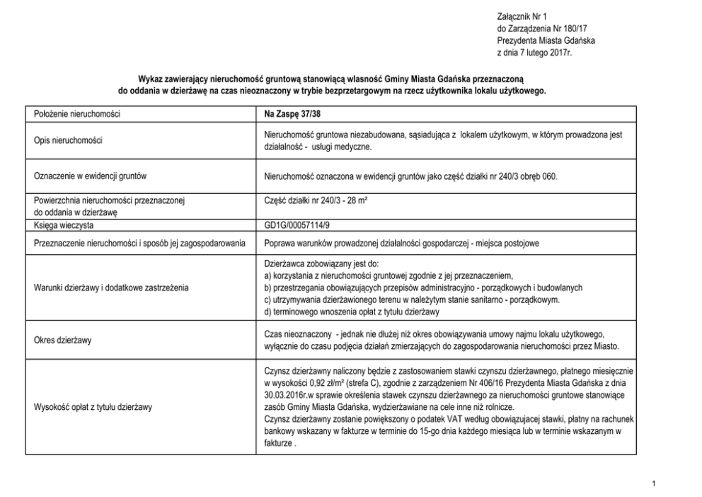 Załącznik Nr 1 do Zarządzenia Nr 180/17 Prezydenta Miasta Gdańska z dnia 7 lutego 2017r. Wykaz zawierający nieruchomość gruntową stanowiącą wlasność Gminy Miasta Gdańska przeznaczoną do oddania w dzierżawę na czas nieoznaczony w trybie bezprzetargowym na rzecz użytkownika lokalu użytkowego. Położenie nieruchomości Na Zaspę 37/38 Opis nieruchomości Nieruchomość gruntowa niezabudowana, sąsiadująca z lokalem użytkowym, w którym prowadzona jest działalność - usługi medyczne. Oznaczenie w ewidencji gruntów Nieruchomość oznaczona w ewidencji gruntów jako część działki nr 240/3 obręb 060. Powierzchnia nieruchomości przeznaczonej do oddania w dzierżawę Księga wieczysta Część działki nr 240/3 - 28 m² Przeznaczenie nieruchomości i sposób jej zagospodarowania Poprawa warunków prowadzonej działalności gospodarczej - miejsca postojowe Warunki dzierżawy i dodatkowe zastrzeżenia Dzierżawca zobowiązany jest do: a) korzystania z nieruchomości gruntowej zgodnie z jej przeznaczeniem, b) przestrzegania obowiązujących przepisów administracyjno - porządkowych i budowlanych c) utrzymywania dzierżawionego terenu w należytym stanie sanitarno - porządkowym. d) terminowego wnoszenia opłat z tytułu dzierżawy Okres dzierżawy Czas nieoznaczony - jednak nie dłużej niż okres obowiązywania umowy najmu lokalu użytkowego, wyłącznie do czasu podjęcia działań zmierzających do zagospodarowania nieruchomości przez Miasto. Wysokość opłat z tytułu dzierżawy Czynsz dzierżawny naliczony będzie z zastosowaniem stawki czynszu dzierżawnego, płatnego miesięcznie w wysokości 0,92 zł/m² (strefa C), zgodnie z zarządzeniem Nr 406/16 Prezydenta Miasta Gdańska z dnia 30.03.2016r.w sprawie określenia stawek czynszu dzierżawnego za nieruchomości gruntowe stanowiące zasób Gminy Miasta Gdańska, wydzierżawiane na cele inne niż rolnicze. Czynsz dzierżawny zostanie powiększony o podatek VAT według obowiązujacej stawki, płatny na rachunek bankowy wskazany w fakturze w terminie do 15-go dnia każdego miesiąca lub w terminie wskazanym w fakturze . GD1G/00057114/9 1 ZASADY DZIERŻAWY NIERUCHOMOŚCI GRUNTOWYCH. 1. Nieruchomości gruntowe przeznaczone do oddania w dzierżawę na rzecz użytkowników lokali użytkowych oddawane są w trybie bezprzetargowym. 2. Dzierżawa nieruchomości gruntowych odbywa się w oparciu o uchwałę nr XIV/187/11 Rady Miasta Gdańska z dnia 30.06.2011r. w sprawie zasad gospodarowania nieruchomościami Miasta Gdańska. 3. Stawki czynszu na dzierżawę nieruchomości gruntowych przeznaczonych do oddania w dzierżawę nie mogą być niższe niż wynikające z zarządzenia Nr 406/16 Prezedenta Miasta Gdańska z dnia 30.03.2016r.w sprawie określenia wysokości stawek czynszu dzierżawnego za nieruchomości gruntowe stanowiące zasób Gminy Miasta Gdańska, wydzierżawiane na cele inne niż rolnicze i podlegają corocznej waloryzacji od dnia 1 maja każdego następnego roku. 4. Prezydentowi Miasta Gdańska przysługuje prawo odstąpienia od przeprowadzenia ogłoszonego postępowania w trybie bezprzetargowym w sprawie oddania nieruchomości gruntowych w dzierżawę, w całości na poszczególne nieruchomości gruntowe, umieszczone w wykazie, w stosunku do których pojawią się nieprzewidziane wcześniej okoliczności natury prawnej, bądź formalnej, uzasadniającej konieczność ich wycofania. 5. Umowa dzierżawy gruntu jest zawierana w Dziale Nieruchomości po przejęciu nieruchomości gruntowej protokołem zdawczo - odbiorczym w siedzibie Biura Obsługi Mieszkańców 6. Ze wzorem umowy dzierżawy oraz mapą nieruchomości przeznaczonej do dzierżawy można zapoznać się w siedzibie Działu Nieruchomości ul. Dyrekcyjna 6 pokój 8 od poniedziałku do piątku w godzinach 7:30 - 15:30 2 3 bezprzetargowym. dbiorczym w siedzibie ruchomości ul. Dyrekcyjna 6 pokój 8 4
